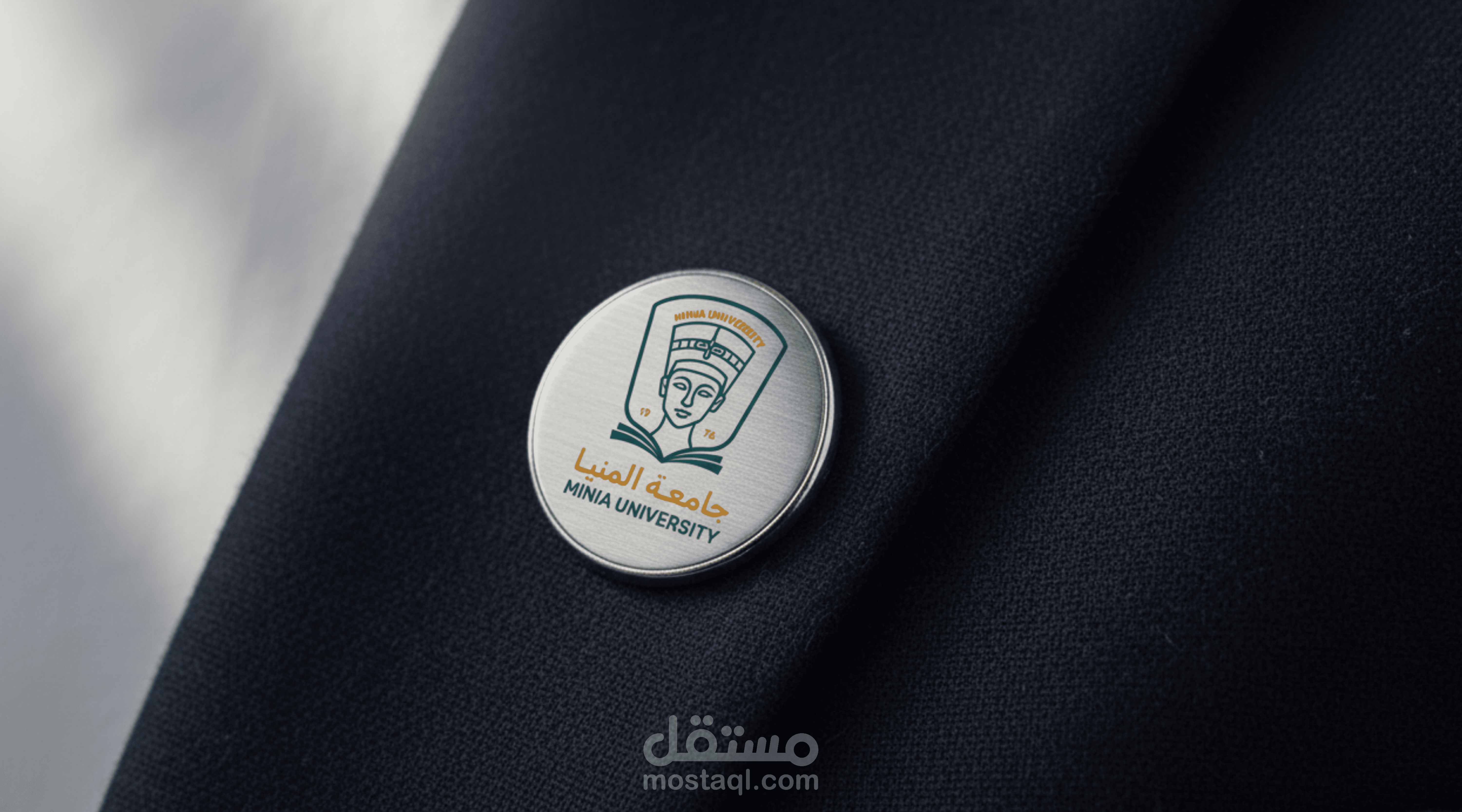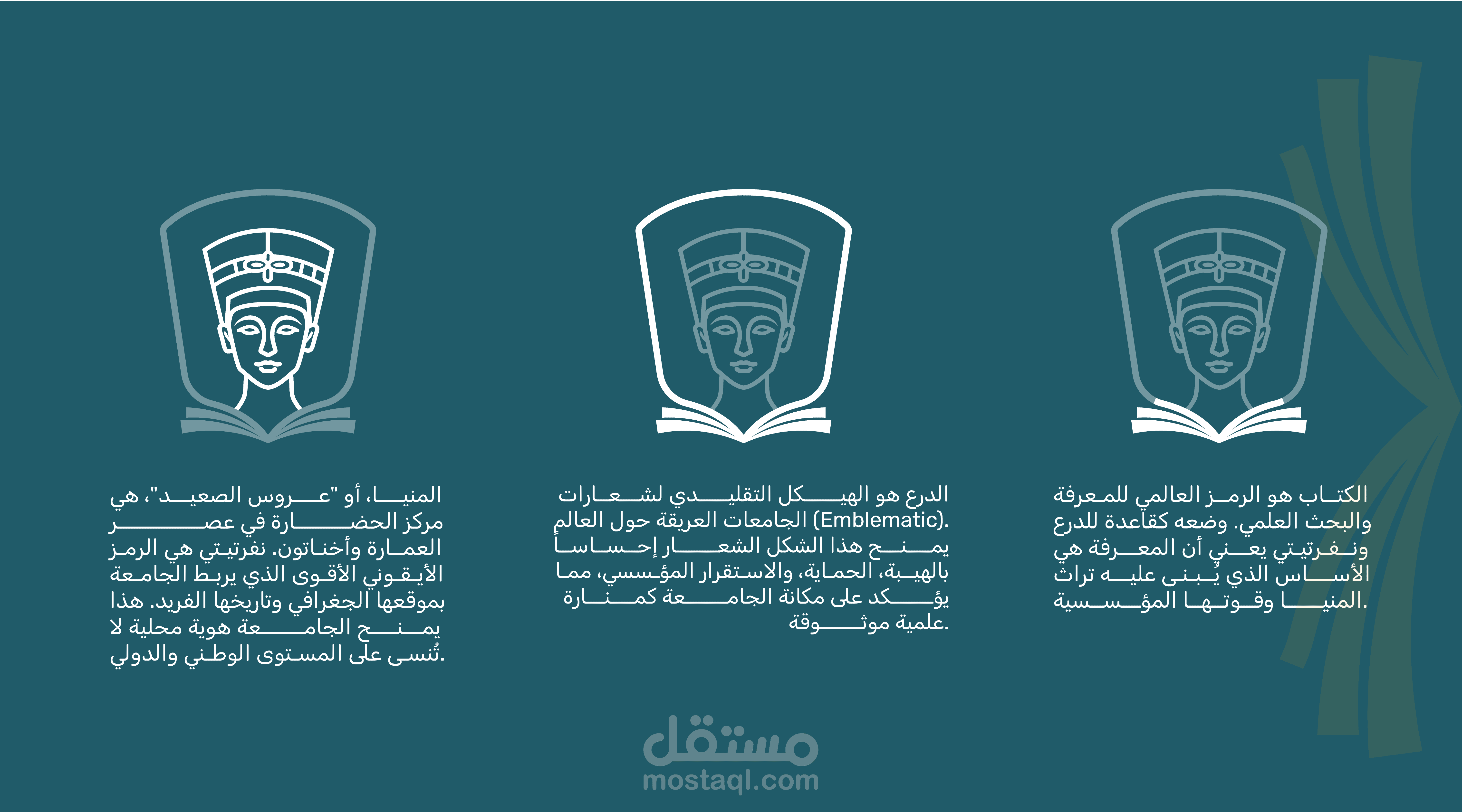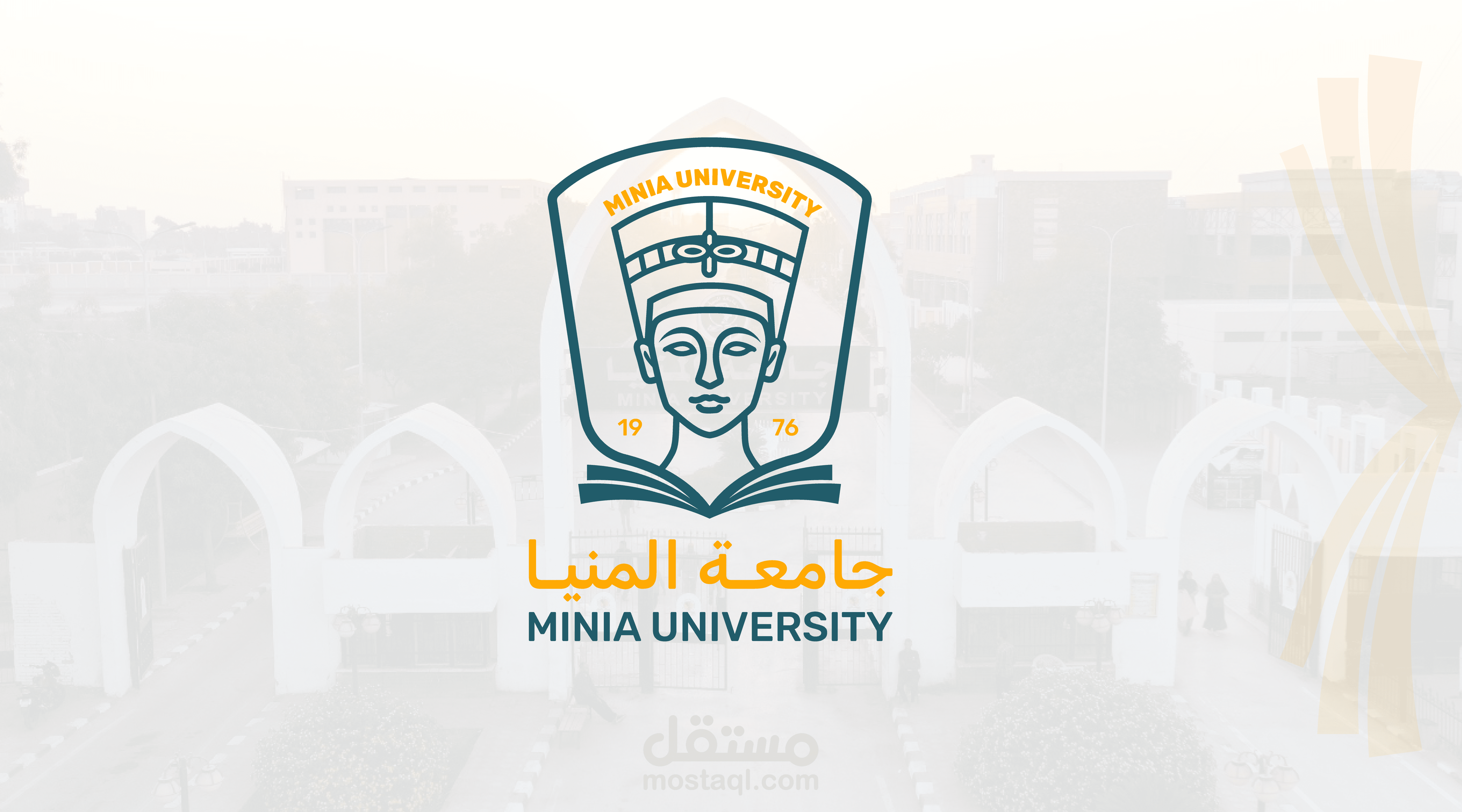 A formal logo design for Minia University that reflects the institution’s academic identity and historical depth through a modern visual approach. The design features Queen Nefertiti as a symbol of Egypt’s rich heritage, combined with an open book to represent knowledge, education, and intellectual growth.