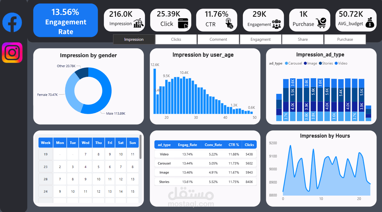 Built advanced DAX measures to calculate key KPIs including impressions, clicks, CTR, engagement rate, conversions, purchases, and average budget.