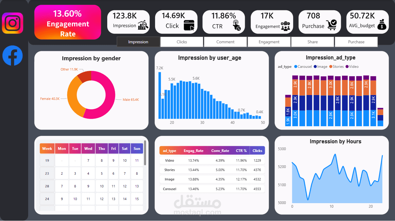 Developed a comprehensive Ads Performance Dashboard for both Instagram and Facebook to analyze and optimize digital advertising campaigns across multiple metrics and audiences.