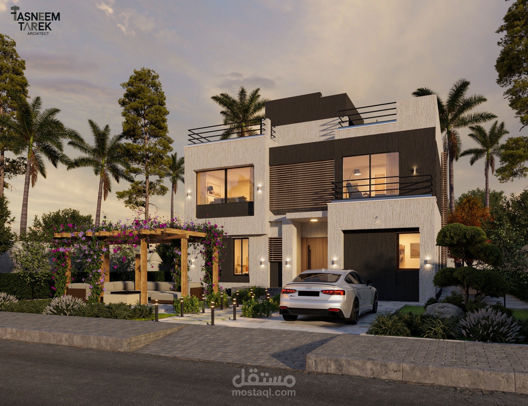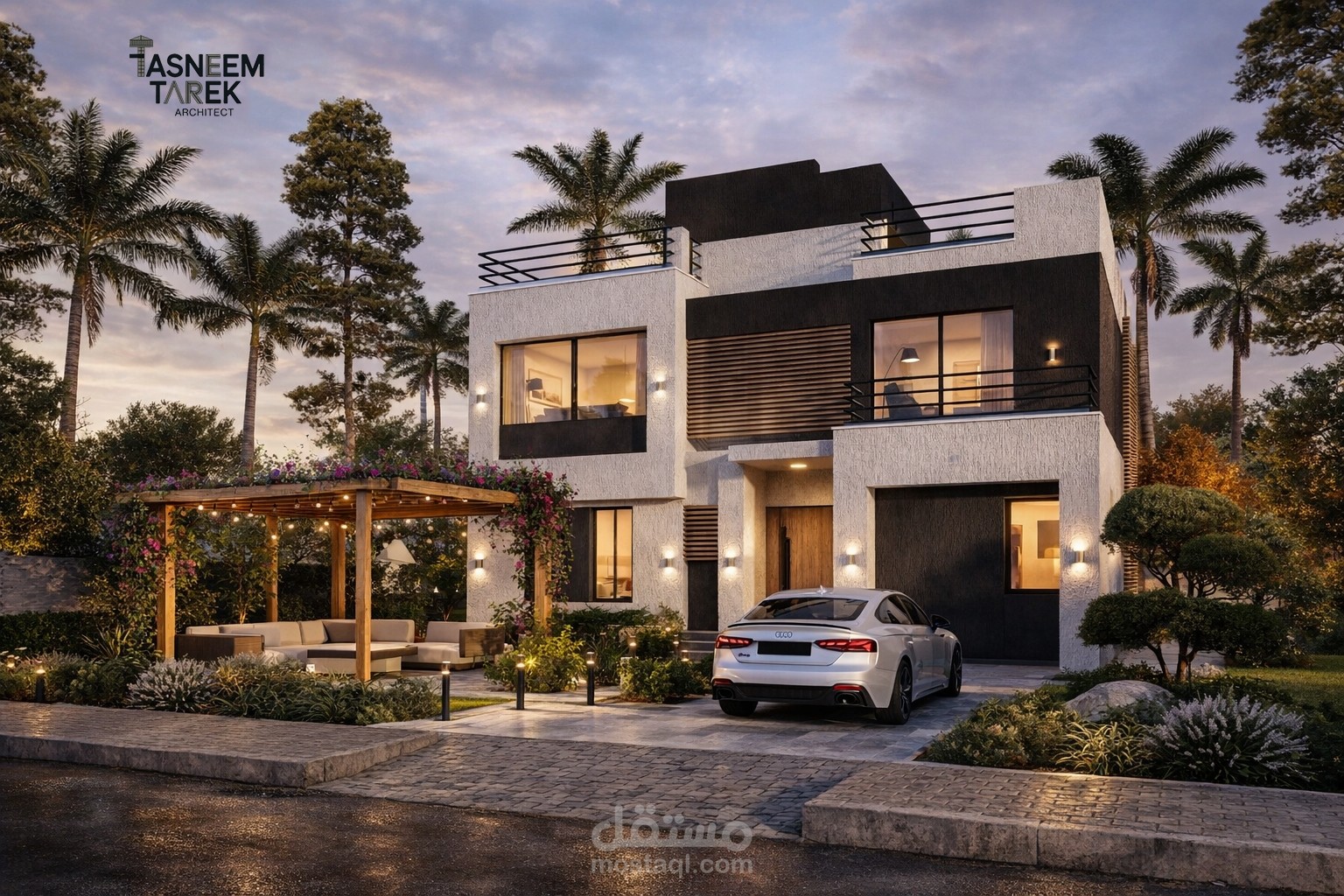 From a blank model to a fully detailed architectural visualization — materials, lighting, and landscape .