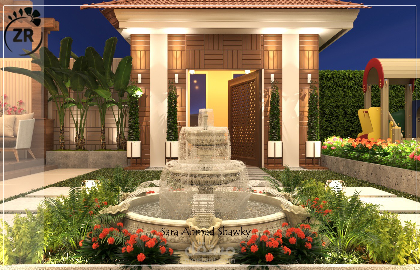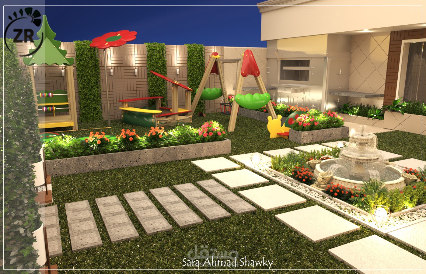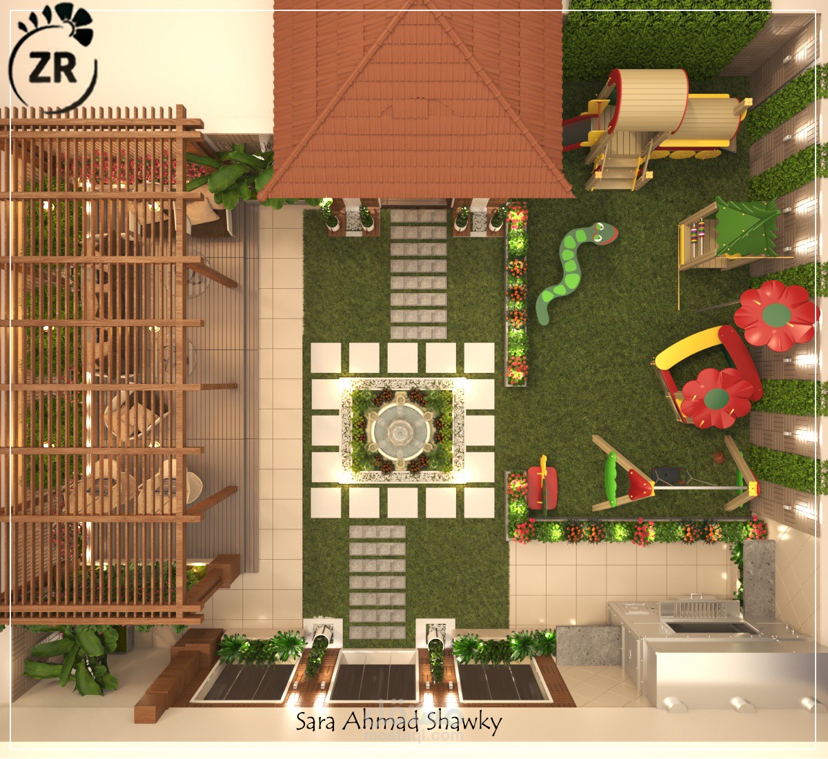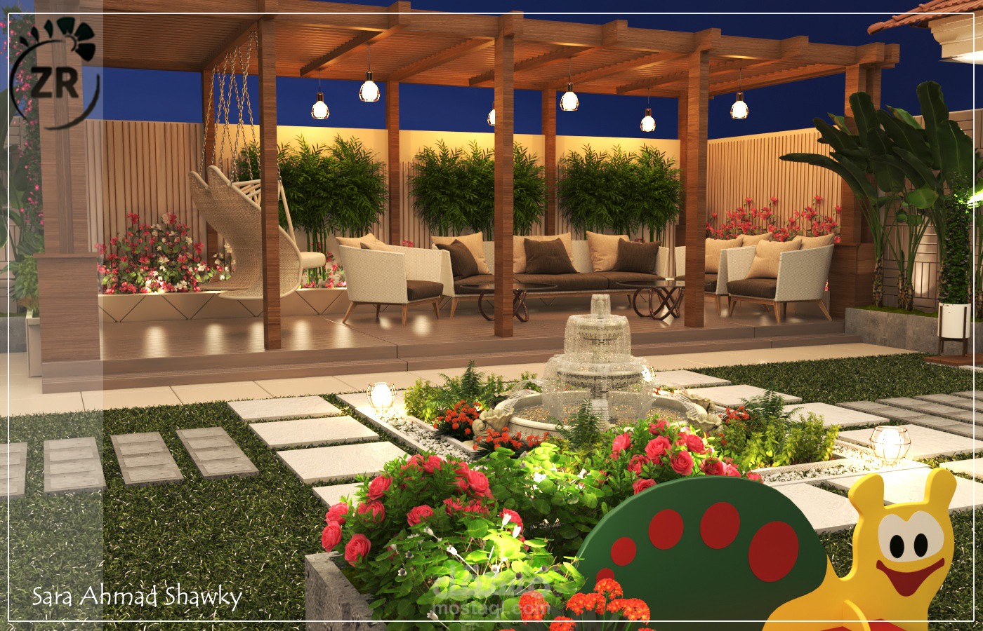 تصميم روف فيلا ليكون مجلس عائلة و به منطقة لعب أطفال ومنطقة نافورة للتزيين و منطقة شوى .