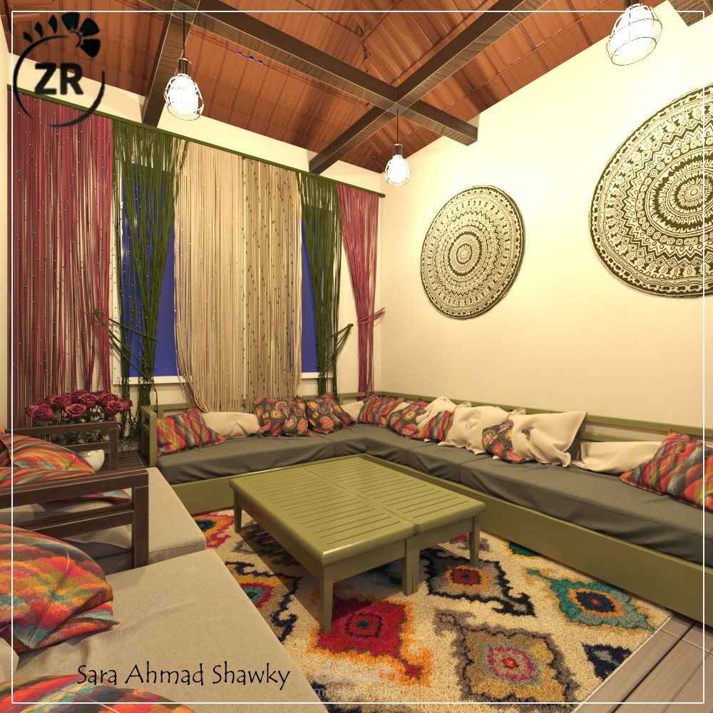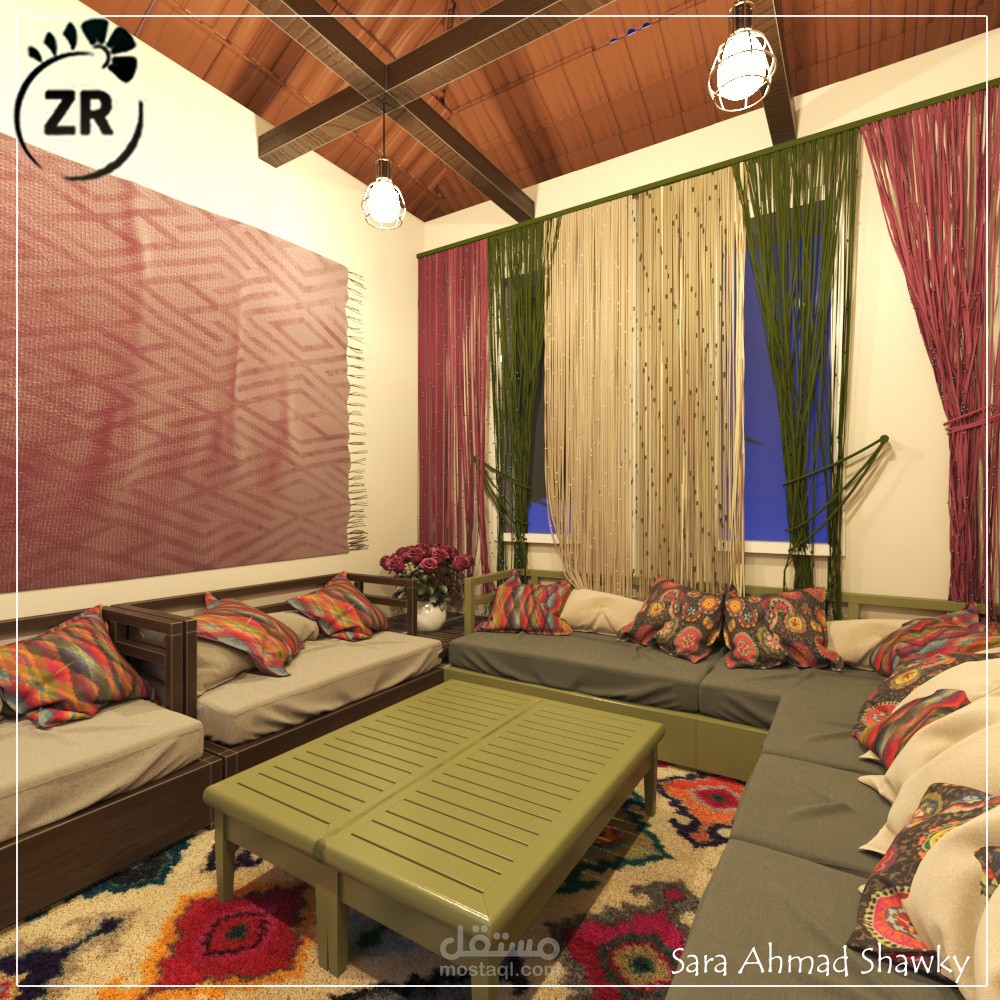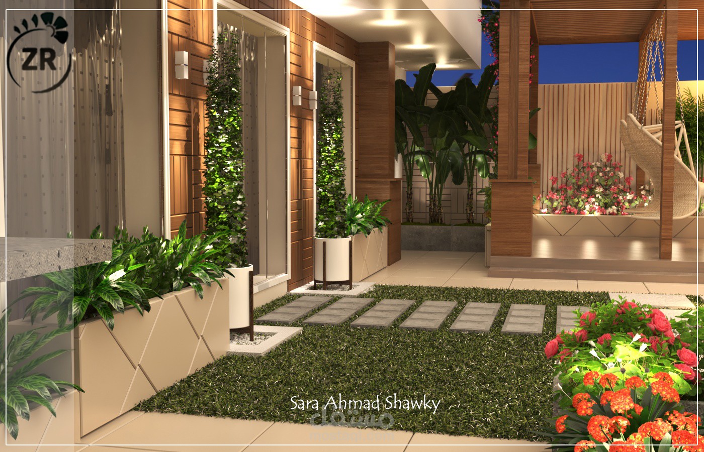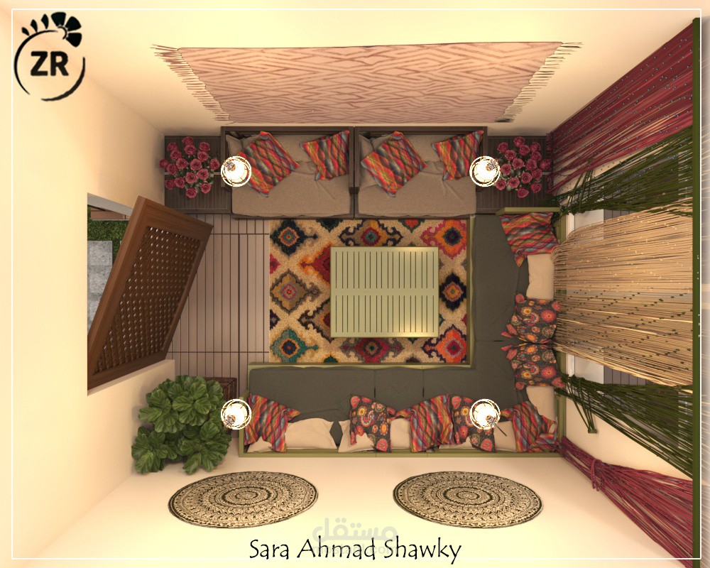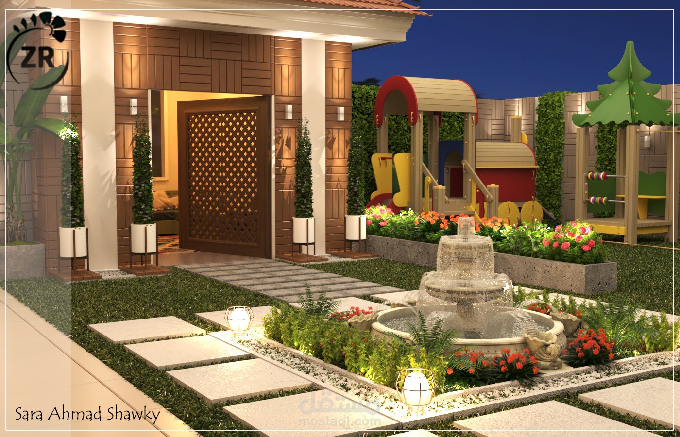 تصميم روف فيلا ليكون مجلس عائلة و به منطقة لعب أطفال ومنطقة نافورة للتزيين و منطقة شوى .