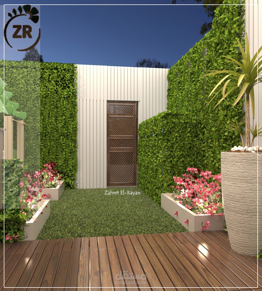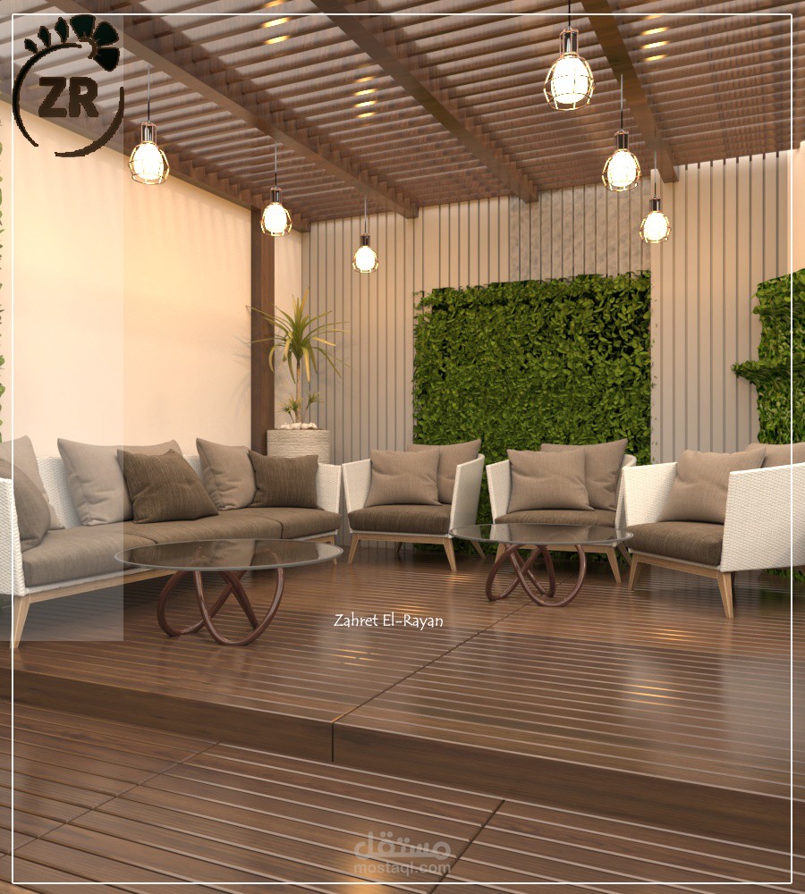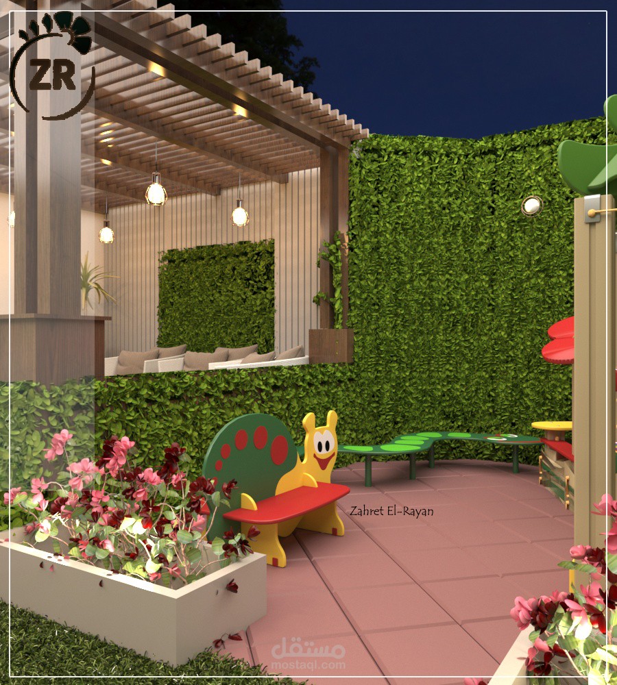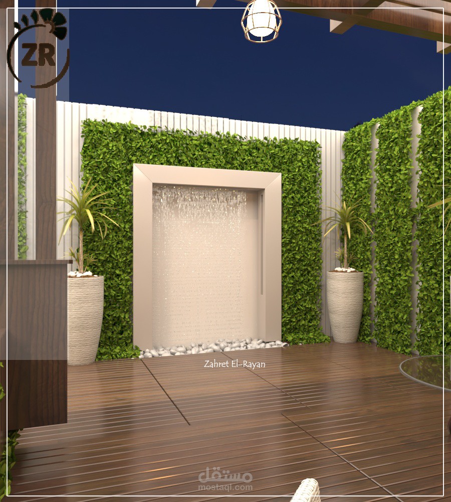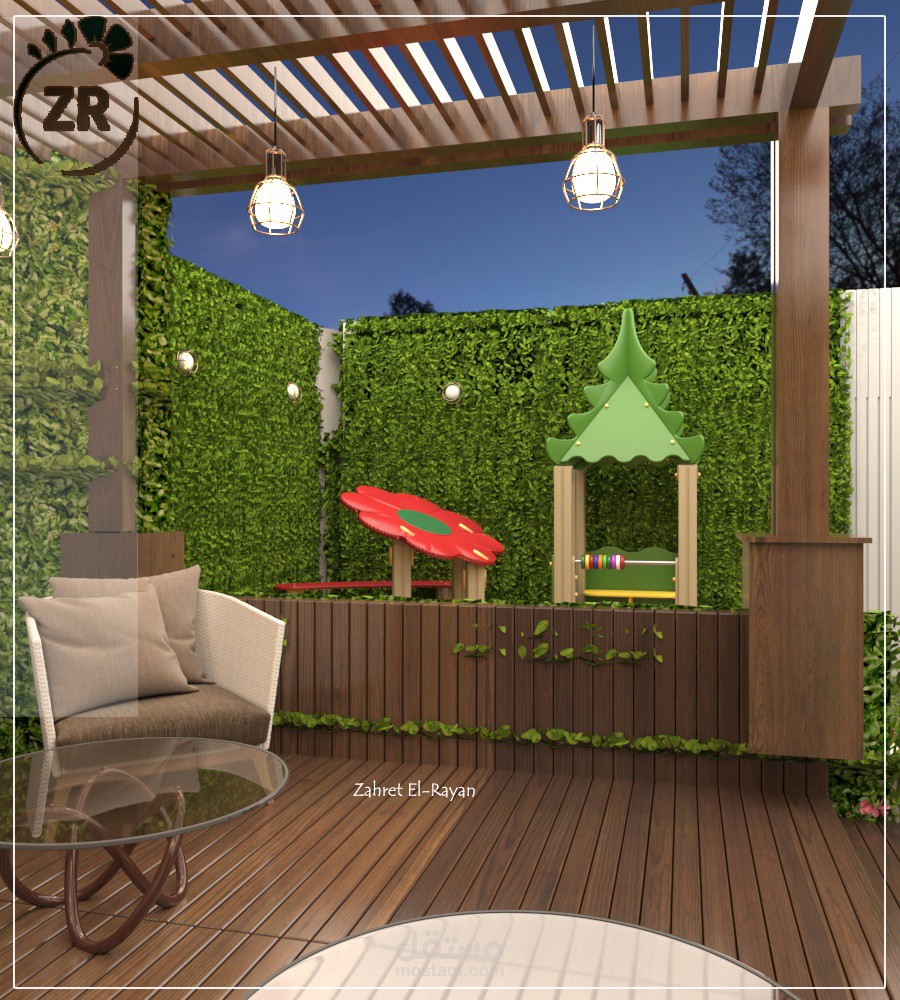 تصميم روف فيلا صغير ليشمل جلسة و شلال مياه ومنطقة لعب أطفال