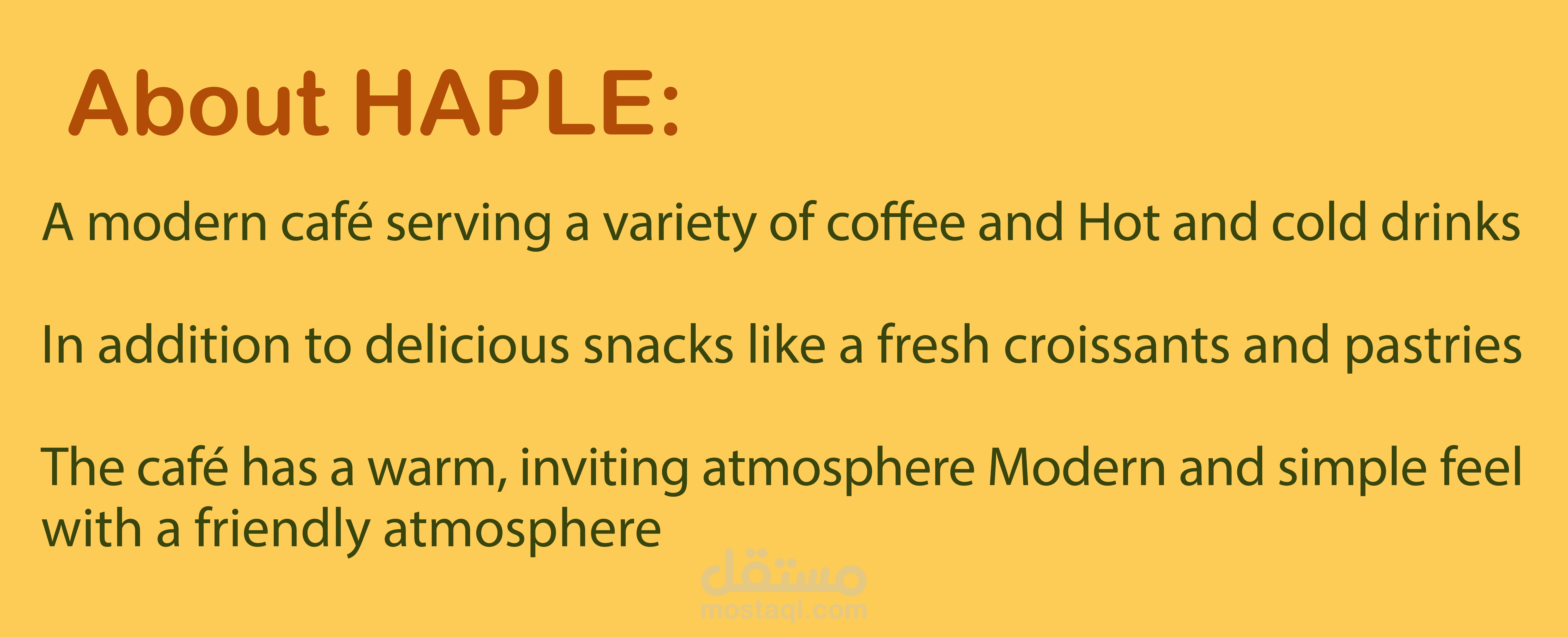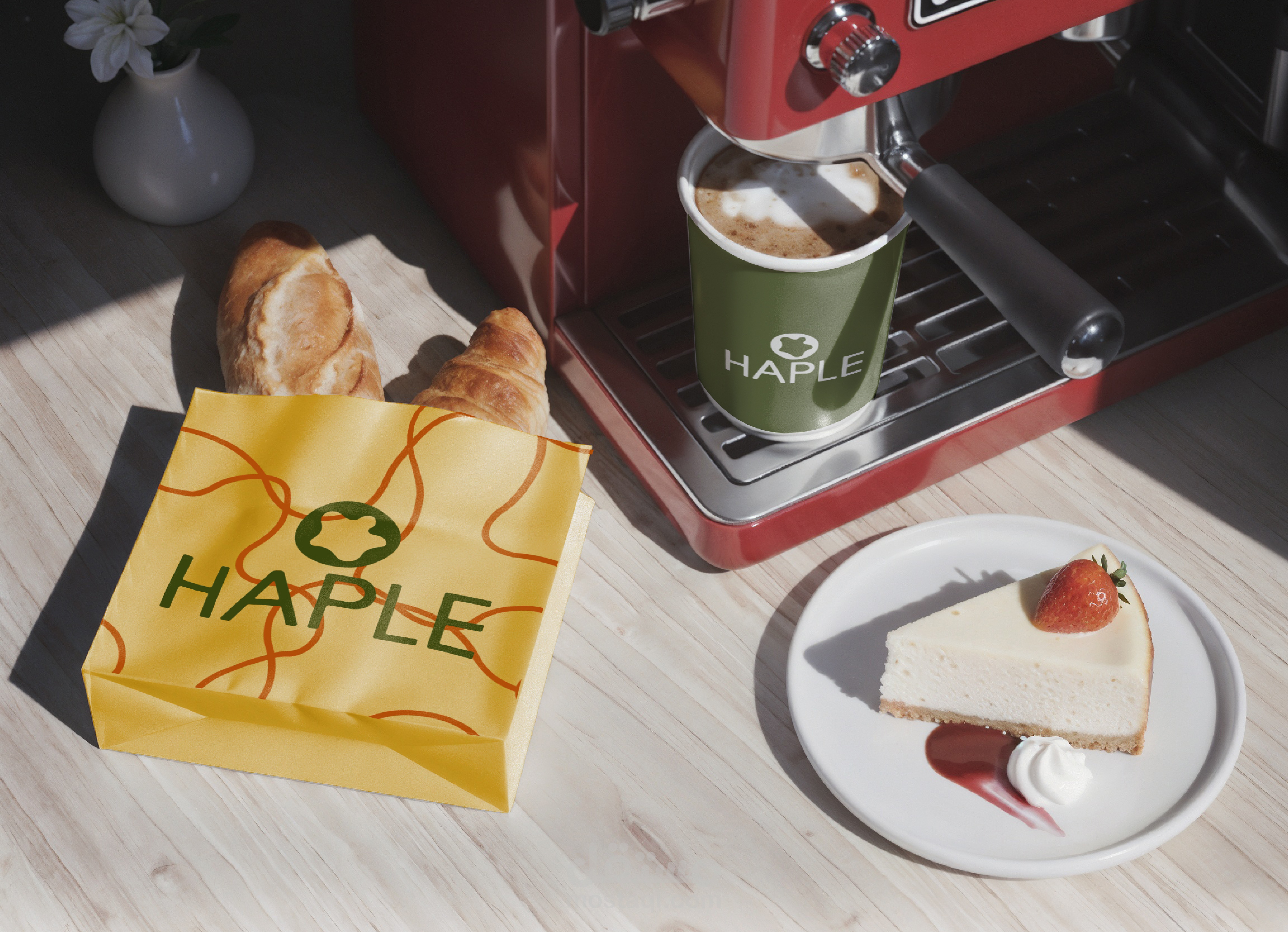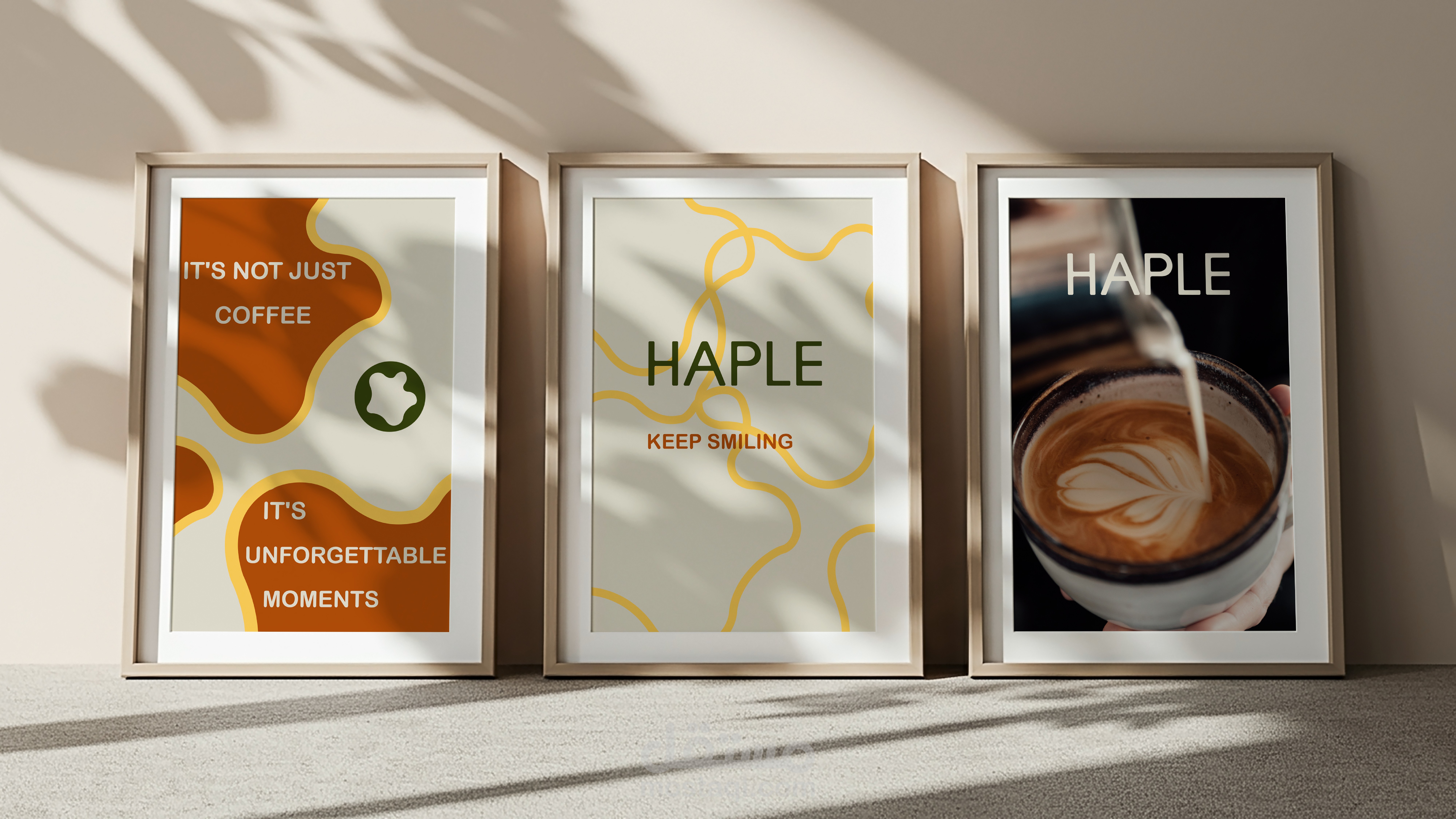 هوية بصرية متكاملة تعكس أجواء دافئة وودّية لمقهى Haple، وتشمل الشعار، الألوان، الخطوط، وتطبيقات السوشيال ميديا، مع الحفاظ على أسلوب بسيط وجذاب يعبر عن شخصية البراند ويقربه من الجمهور.