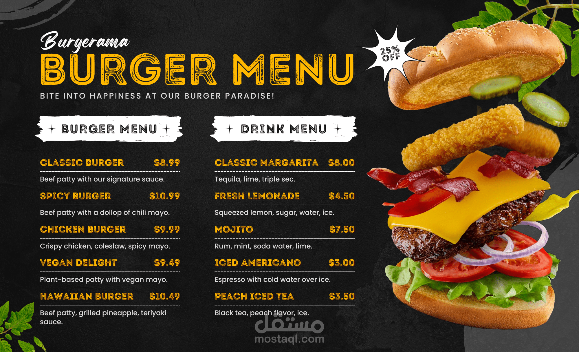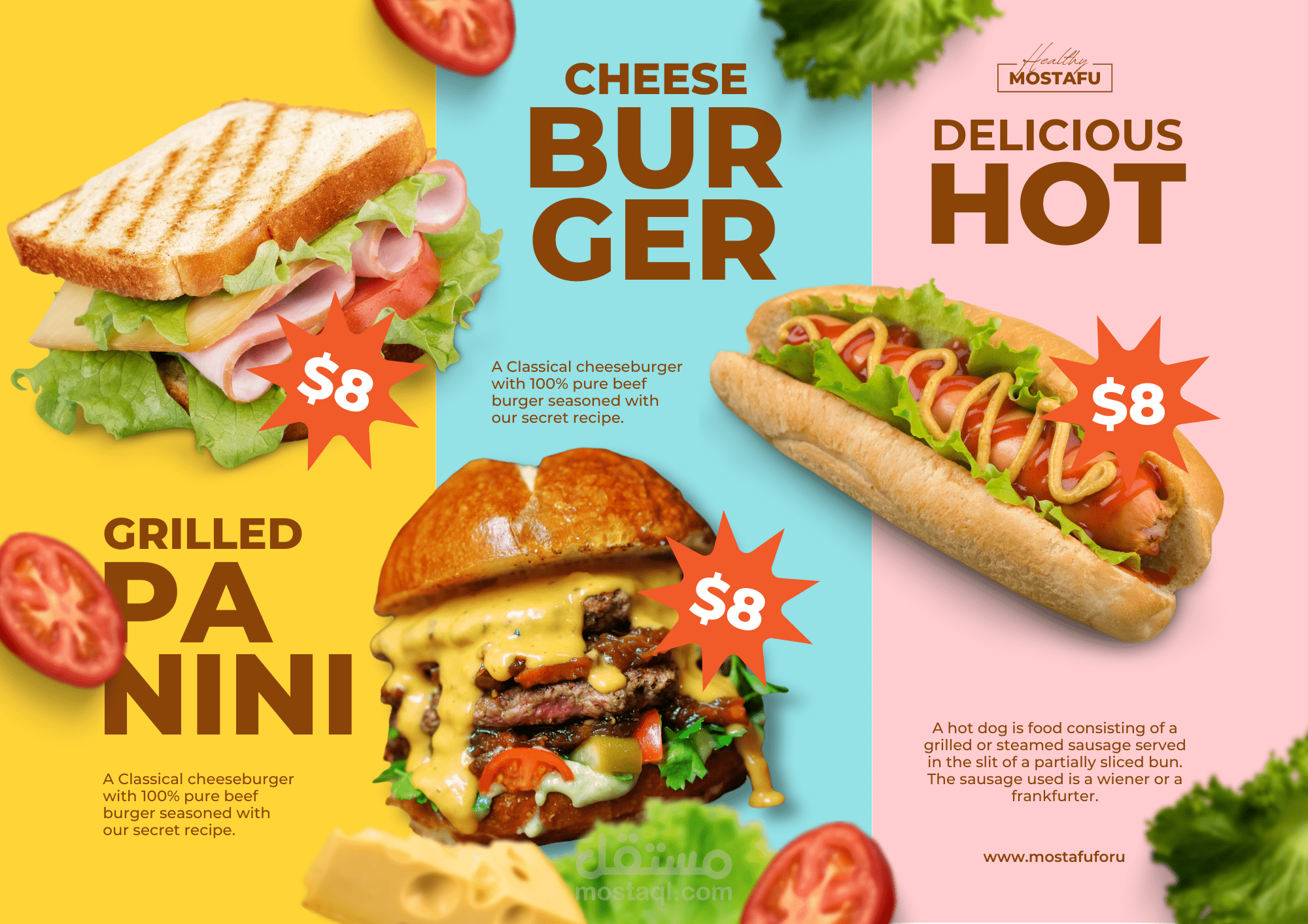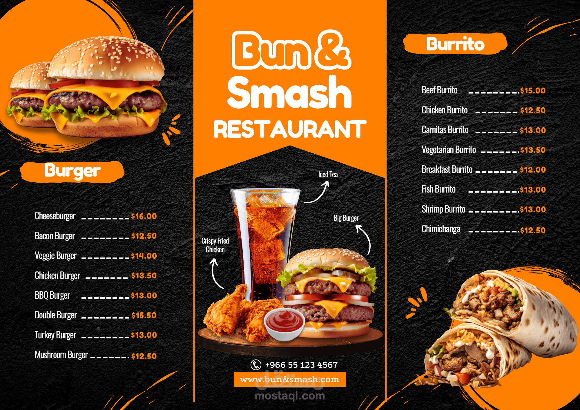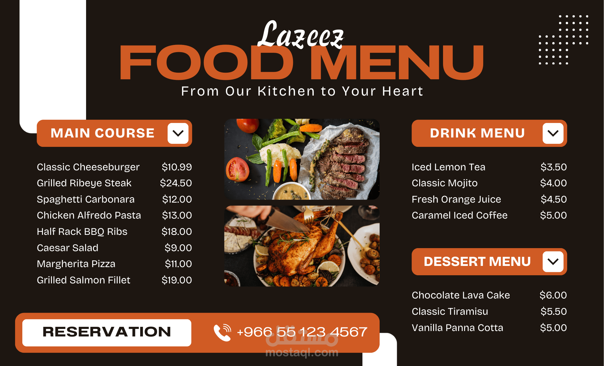 تصميم منيو مطعم احترافي يعكس هوية المكان ويُبرز الأطباق بأسلوب جذاب ومنظم، مع الاهتمام بتناسق الألوان، اختيار الخطوط المناسبة، وترتيب المحتوى لسهولة القراءة. تم إعداد المنيو بشكل يوازن بين الجاذبية البصرية والوضوح، مع جاهزيته للطباعة والاستخدام الرقمي.