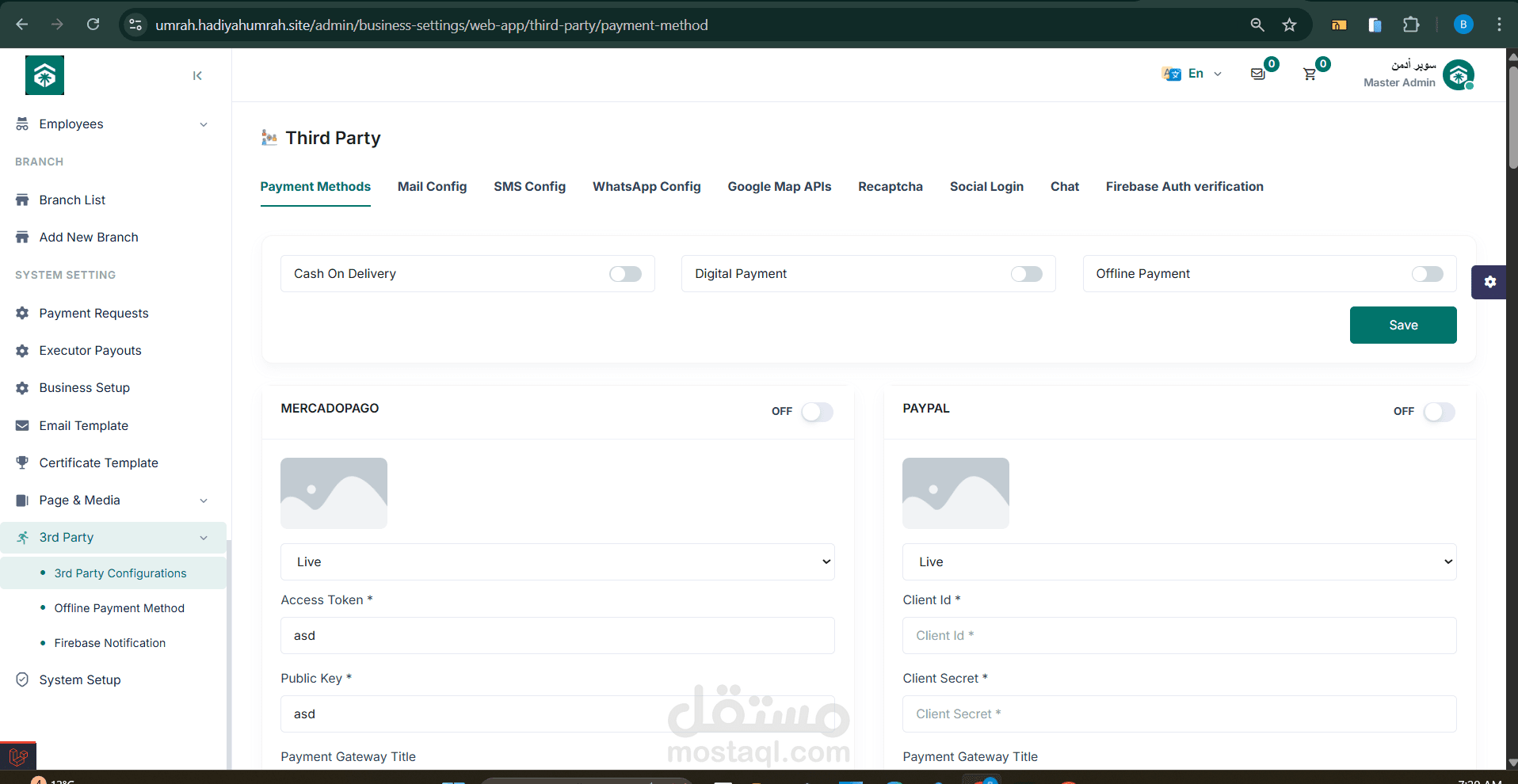 تكامل مع أنظمة دفع وخدمات خارجية: Firebase – Google Maps – Moyser – HyperPay – Odoo