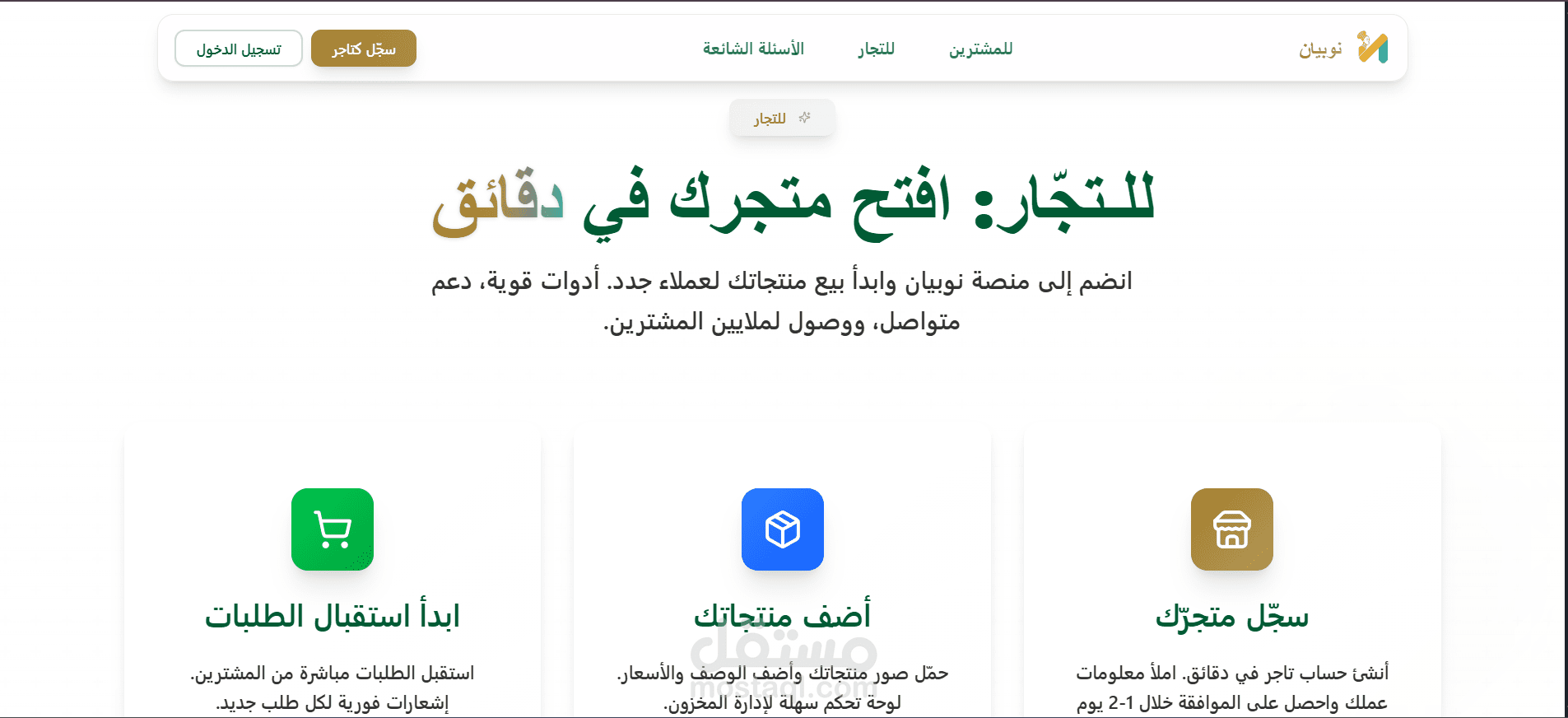 Hero Section: عنوان قوي يوضح فكرة نوبيان + زر دعوة لاتخاذ إجراء (تحميل التطبيق / ابدأ التسوق) مع صورة أو Mockup للتطبيق.