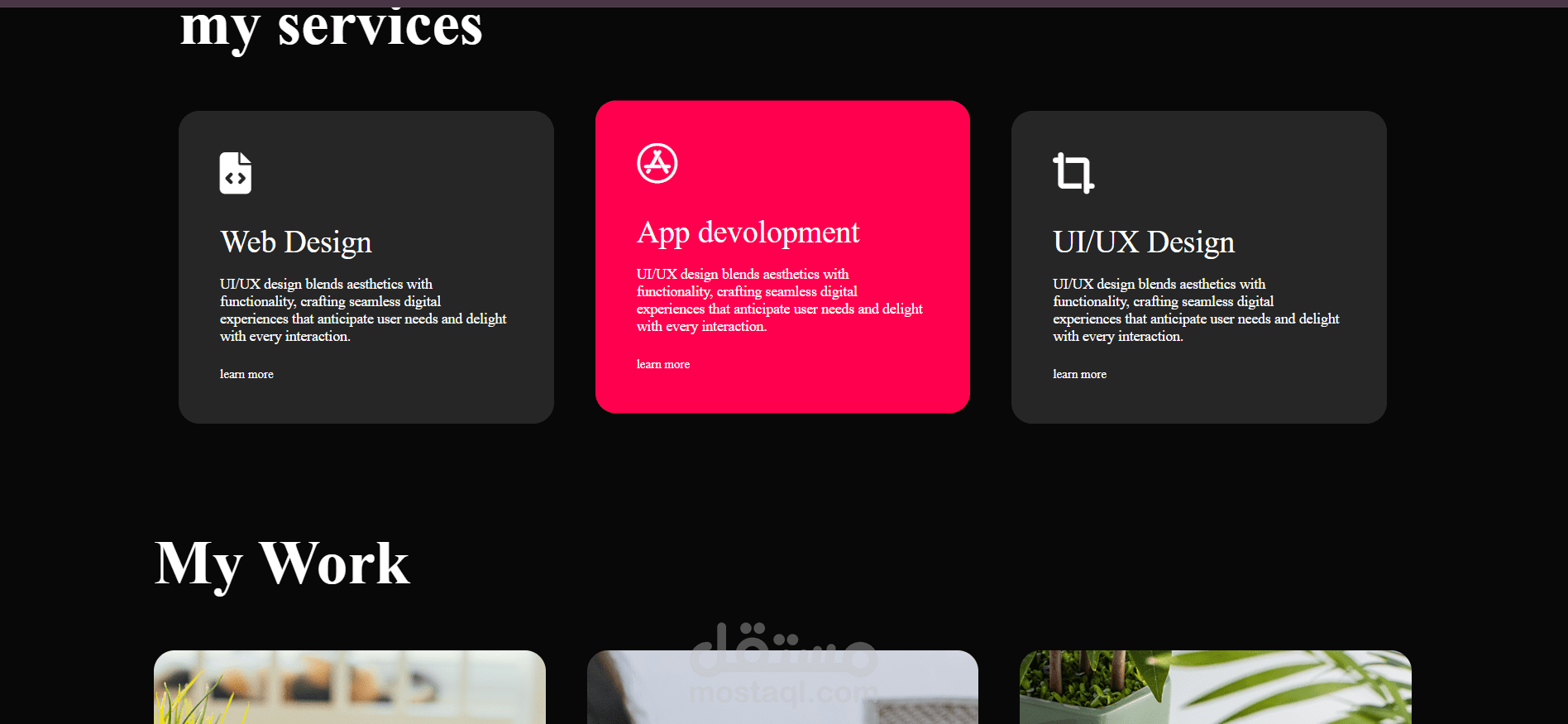 الخدمات (Services): عرض خدمات أساسية مثل تصميم الويب، تطوير التطبيقات، وتصميم واجهات المستخدم مع دعوة لمعرفة المزيد عن كل خدمة.