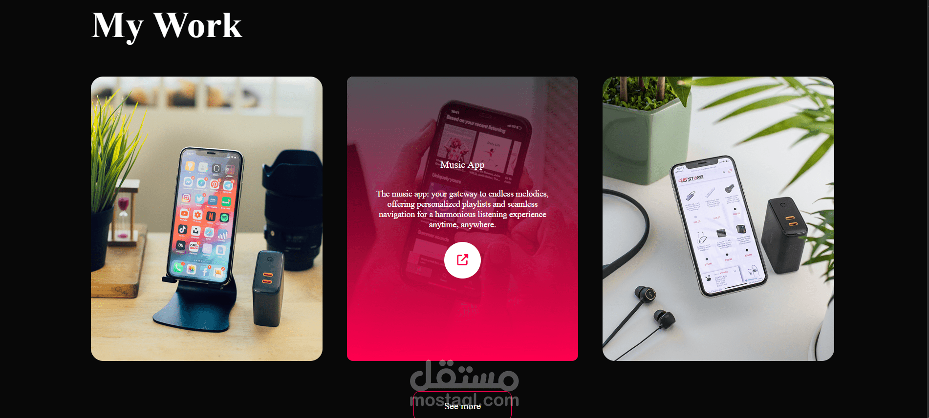 المشاريع (My Work / Portfolio): نماذج أعمال مثل تطبيقات وسائط اجتماعية، تطبيق موسيقى، وموقع متجر، مع صور ووصف مختصر لكل مشروع.