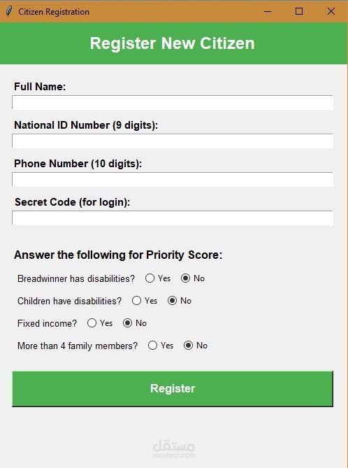 نظام برمجي لإدارة بيانات المواطنين وتحسين آلية توزيع المساعدات في البيئات ذات الموارد المحدودة. تم تطوير المشروع ضمن فريق عمل باستخدام لغة Python، مع التركيز على تنظيم البيانات ودقة المعالجة.