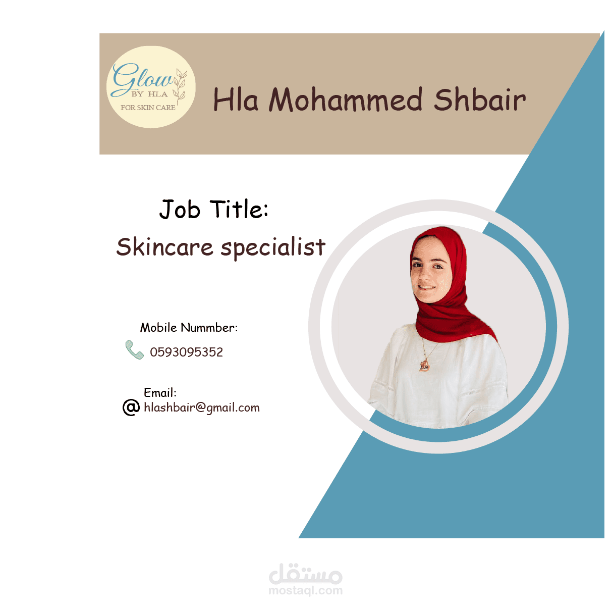بطاقة عمل شخصية ومهنية تُبرز اسم الموظف، المسمى الوظيفي، رقم الهاتف، البريد الإلكتروني، الشعار