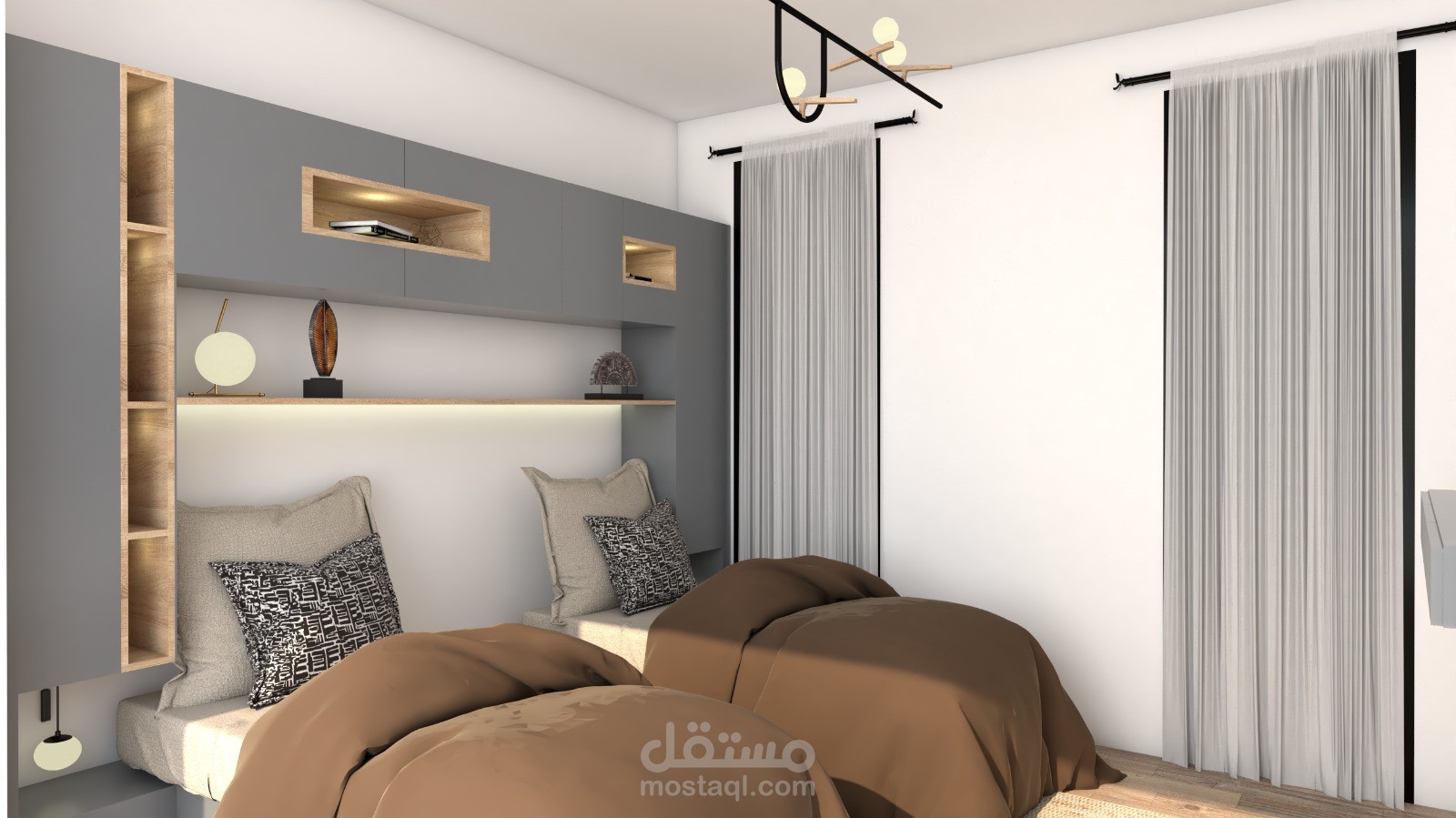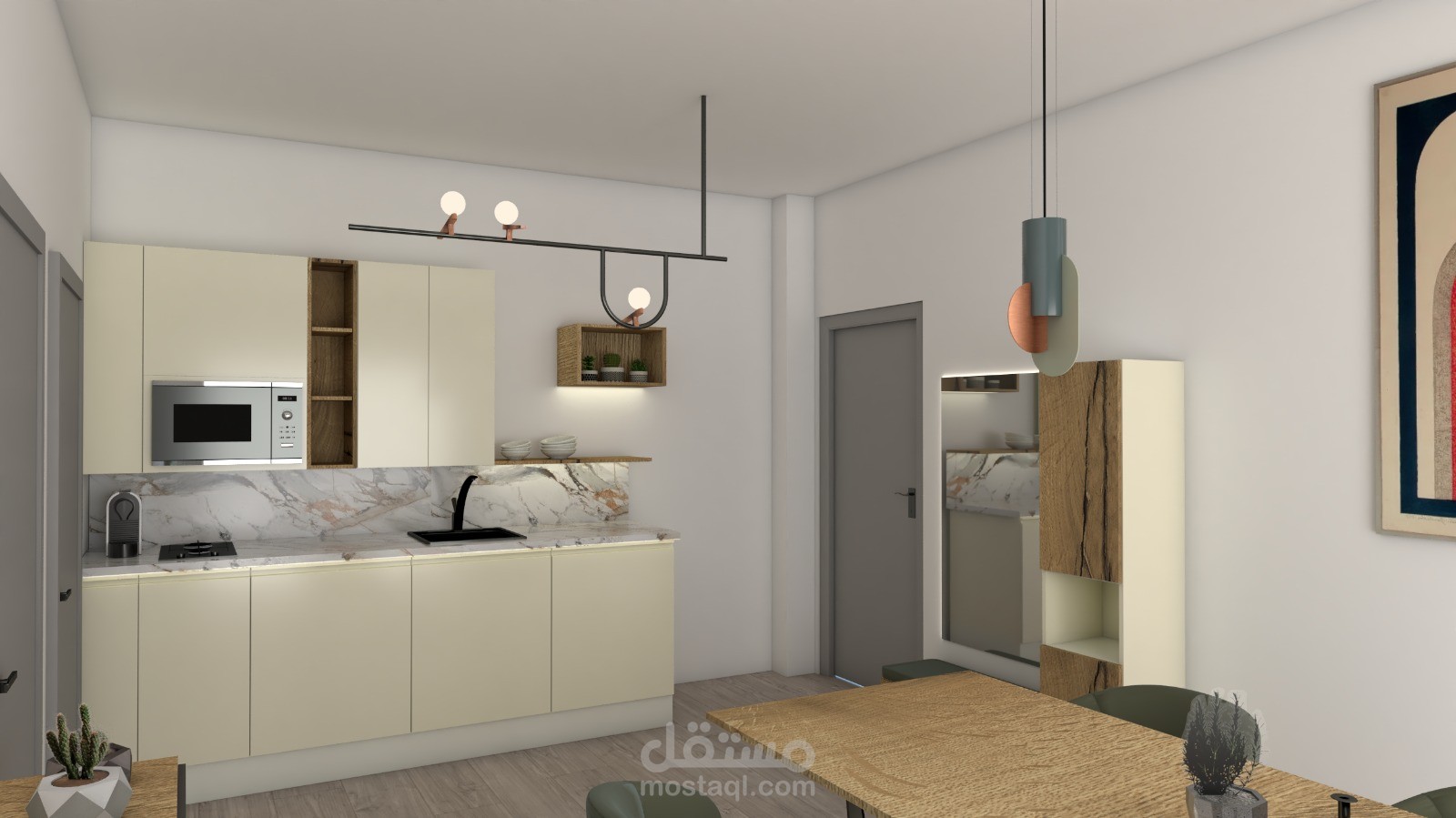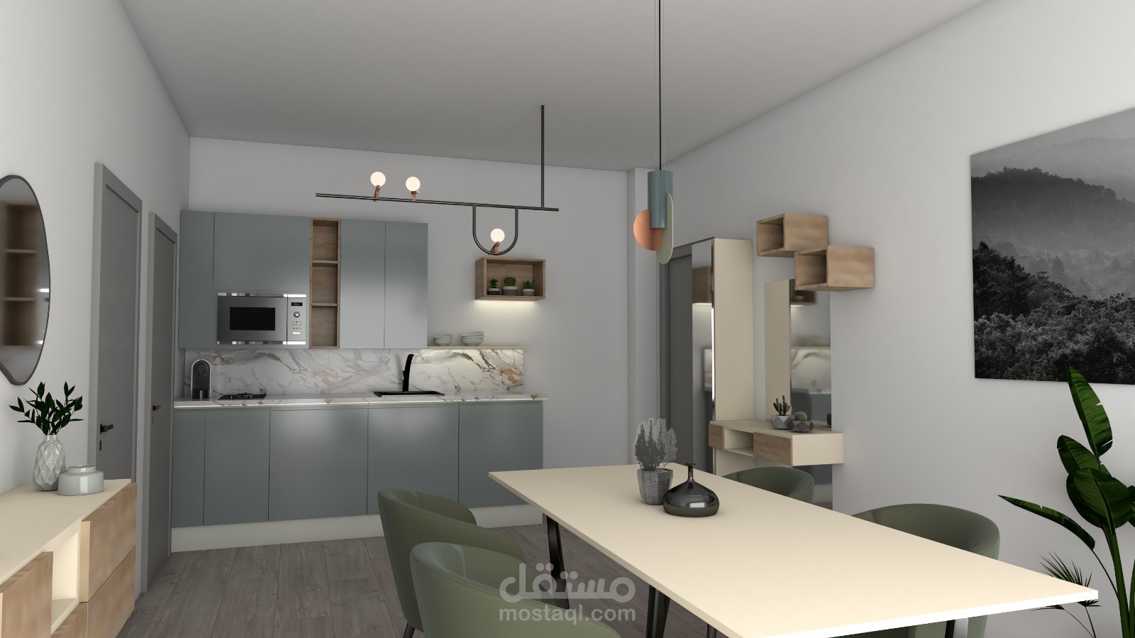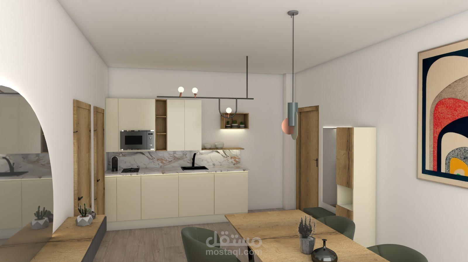 A modern apartment interior designed with a balanced mix of functionality and aesthetics. Clean lines, harmonious colors, and thoughtful lighting create a comfortable, elegant, and practical living space