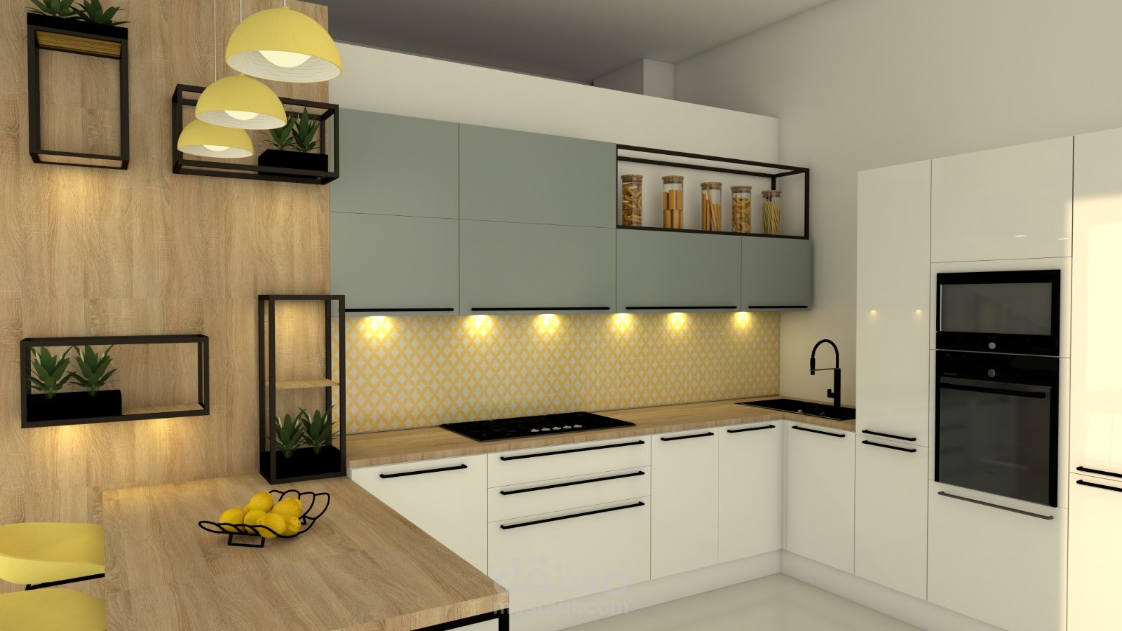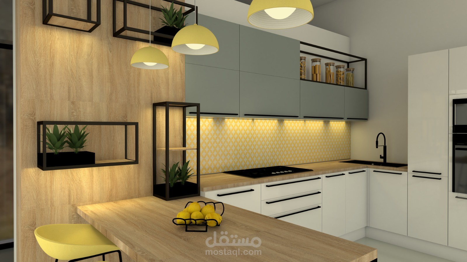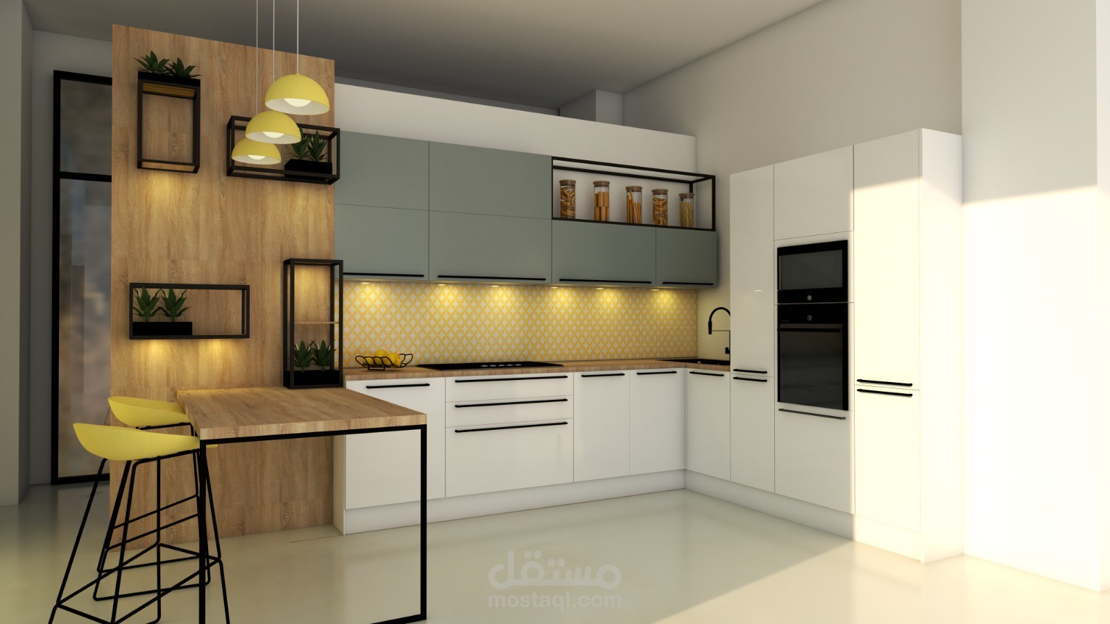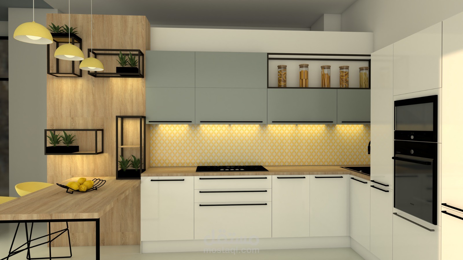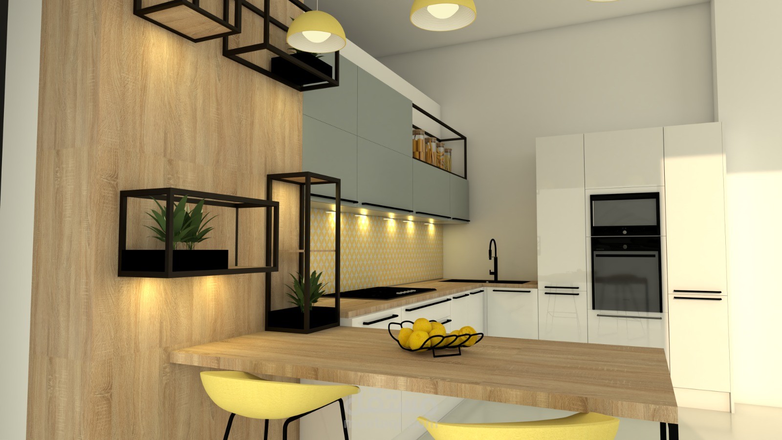 A contemporary kitchen design combining clean lines, warm wood textures, and soft neutral tones. The space is optimized for functionality and comfort, featuring smart storage solutions, integrated lighting, and a balanced use of color to create a bright and welcoming atmosphere
