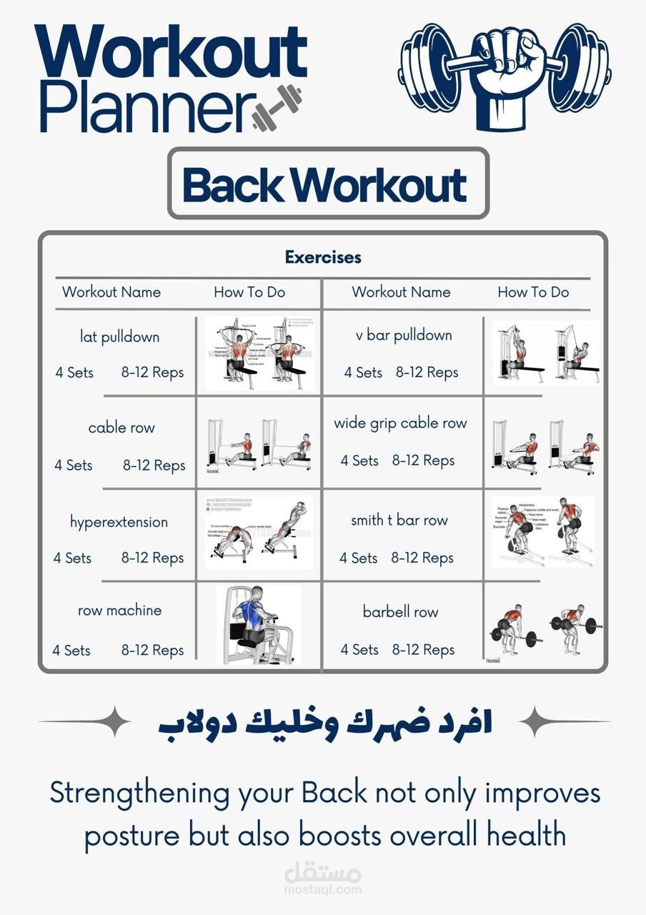 قمت بتصميم مجموعة من خطط التمارين الرياضية (Workout Plans) بشكل منظم وواضح، حيث تم تقسيم التمارين حسب عضلات الجسم المختلفة لتسهيل الاستخدام والمتابعة.