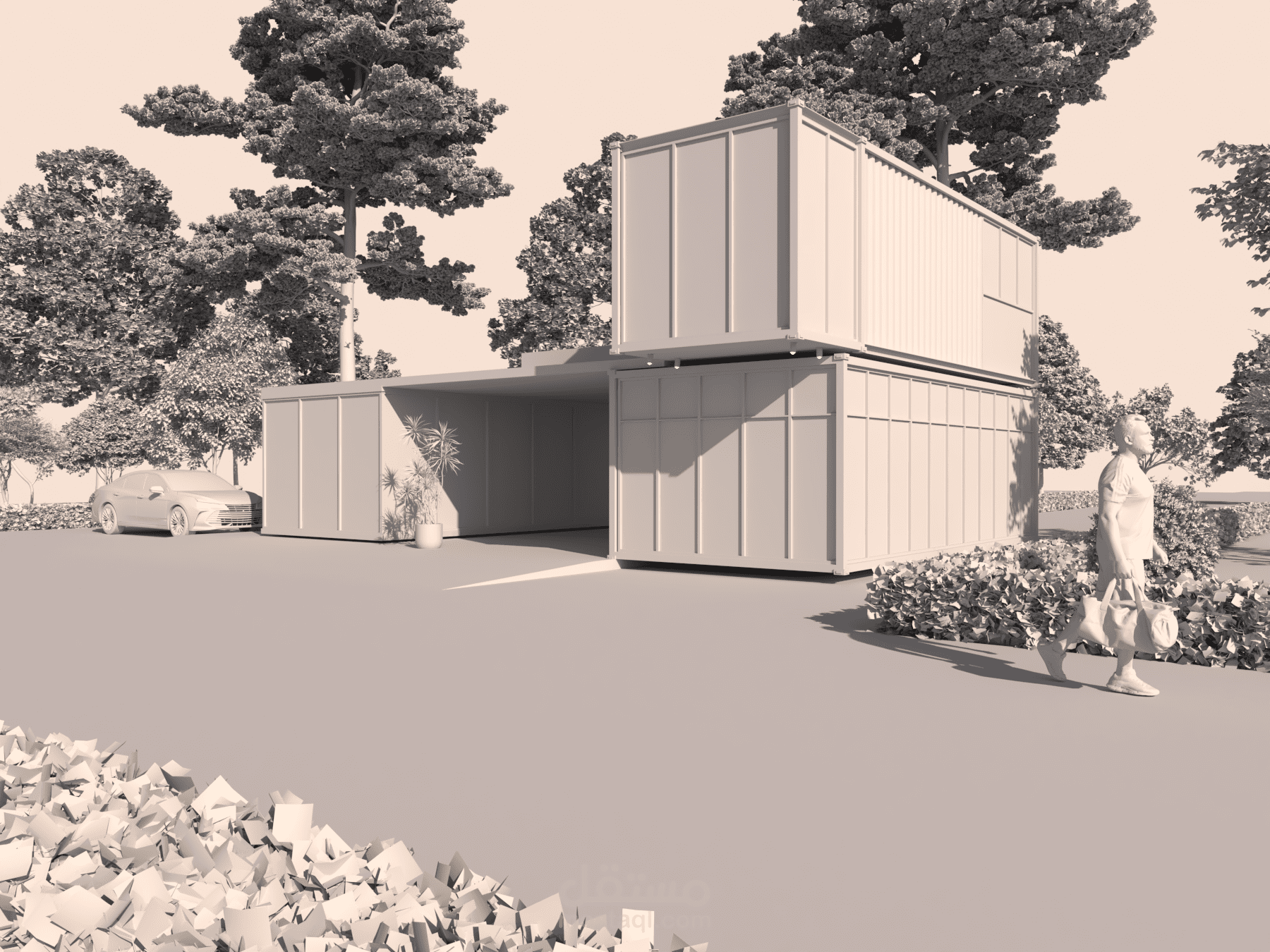 A 3D modeling for an exterior render in Rhino 8 and rendered using V-Ray. This project was a key component of a Rhino and V-Ray masterclass officially authorized by Chaos Group and McNeel.