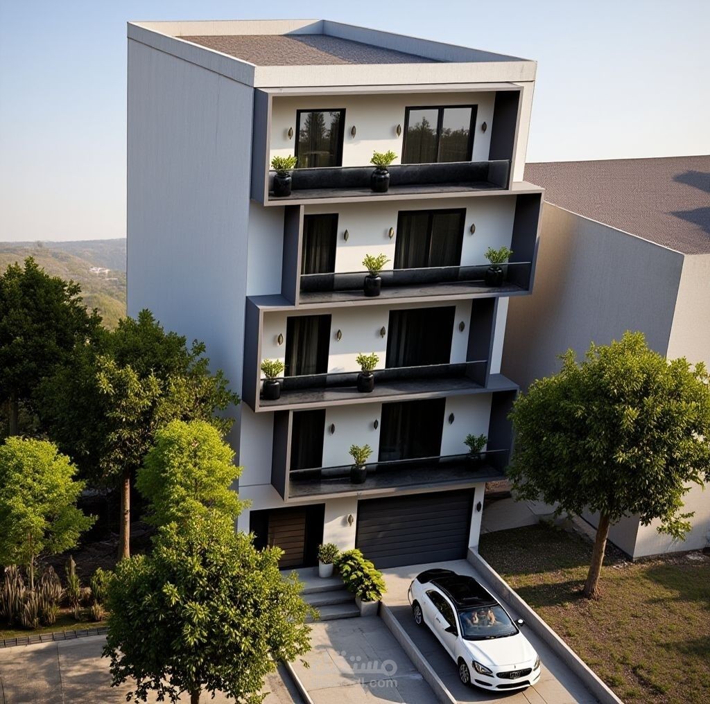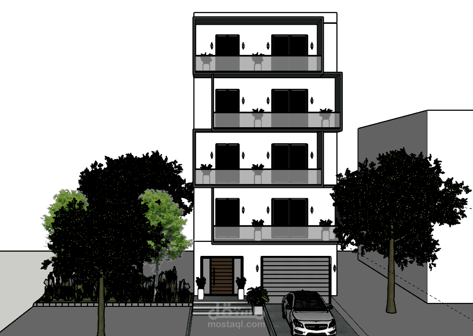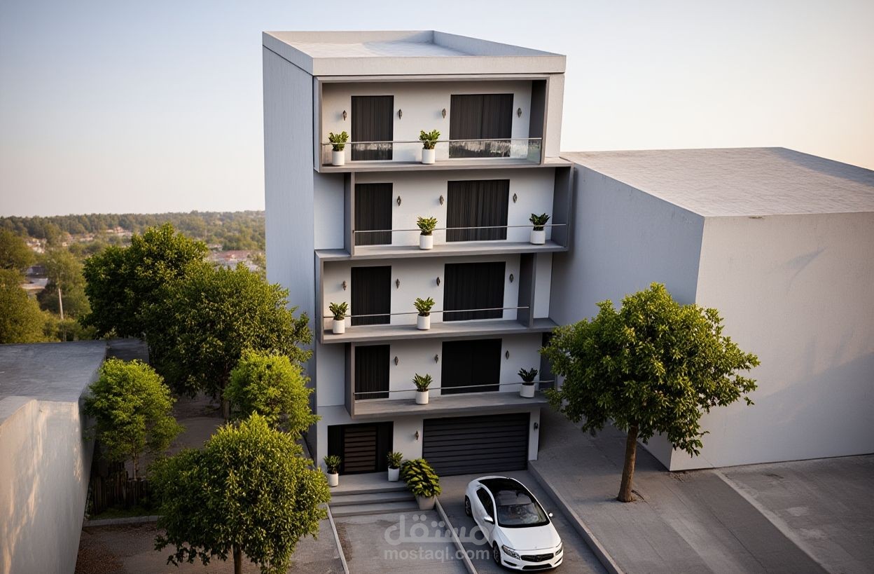 3D exterior modeling and photorealistic rendering of a modern residential building, focusing on clean geometry, balanced proportions, and realistic materials. The scene emphasizes natural daylight, soft shadows, and surrounding context to enhance realism and architectural clarity.