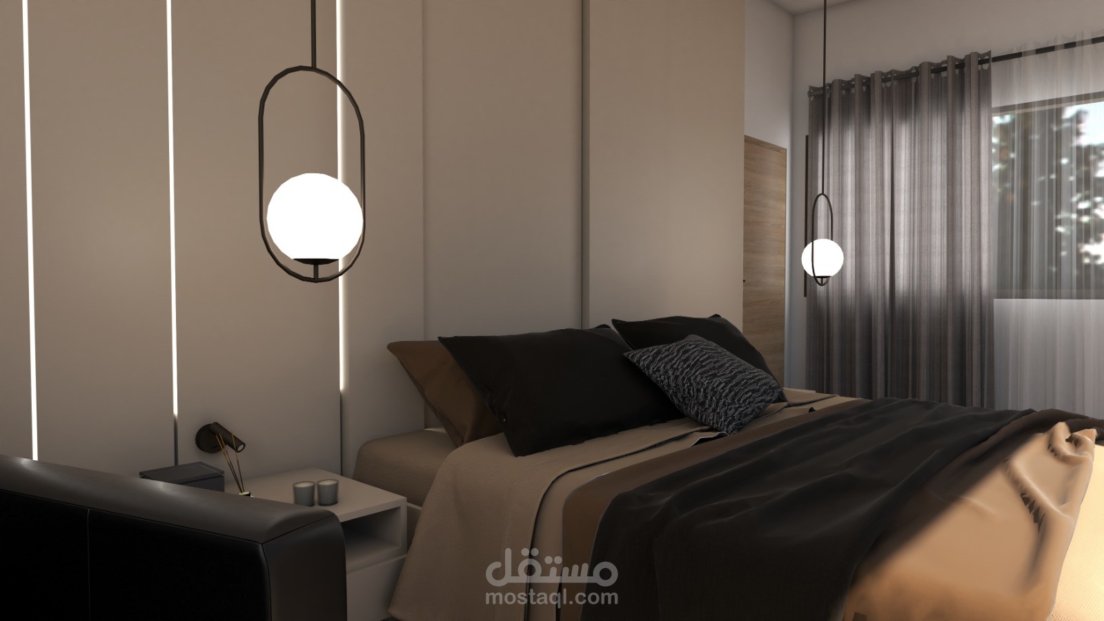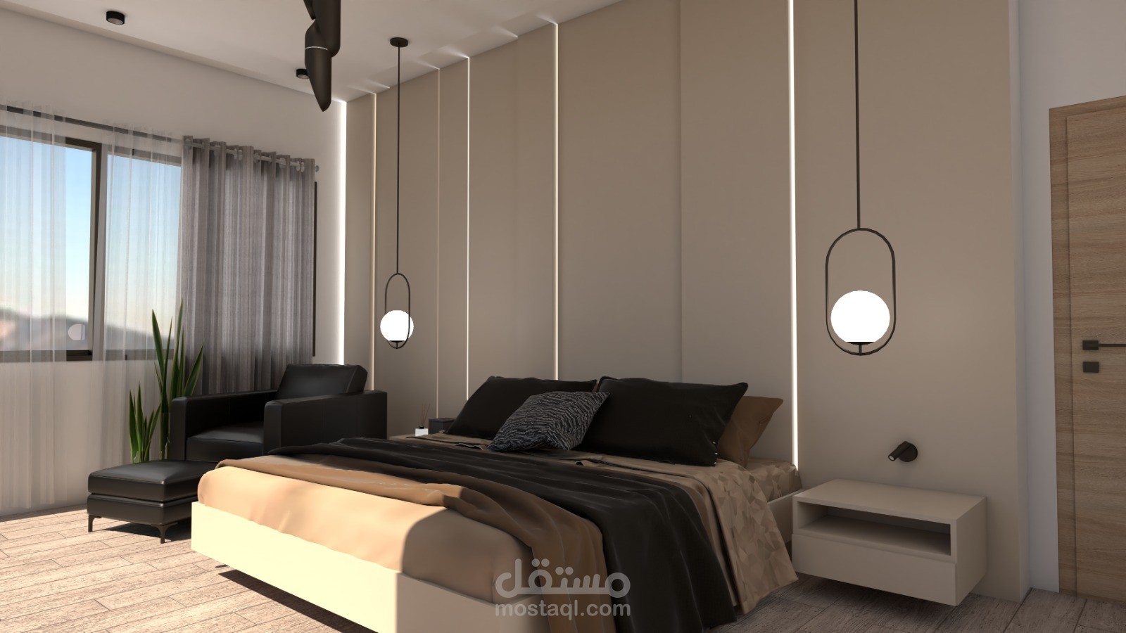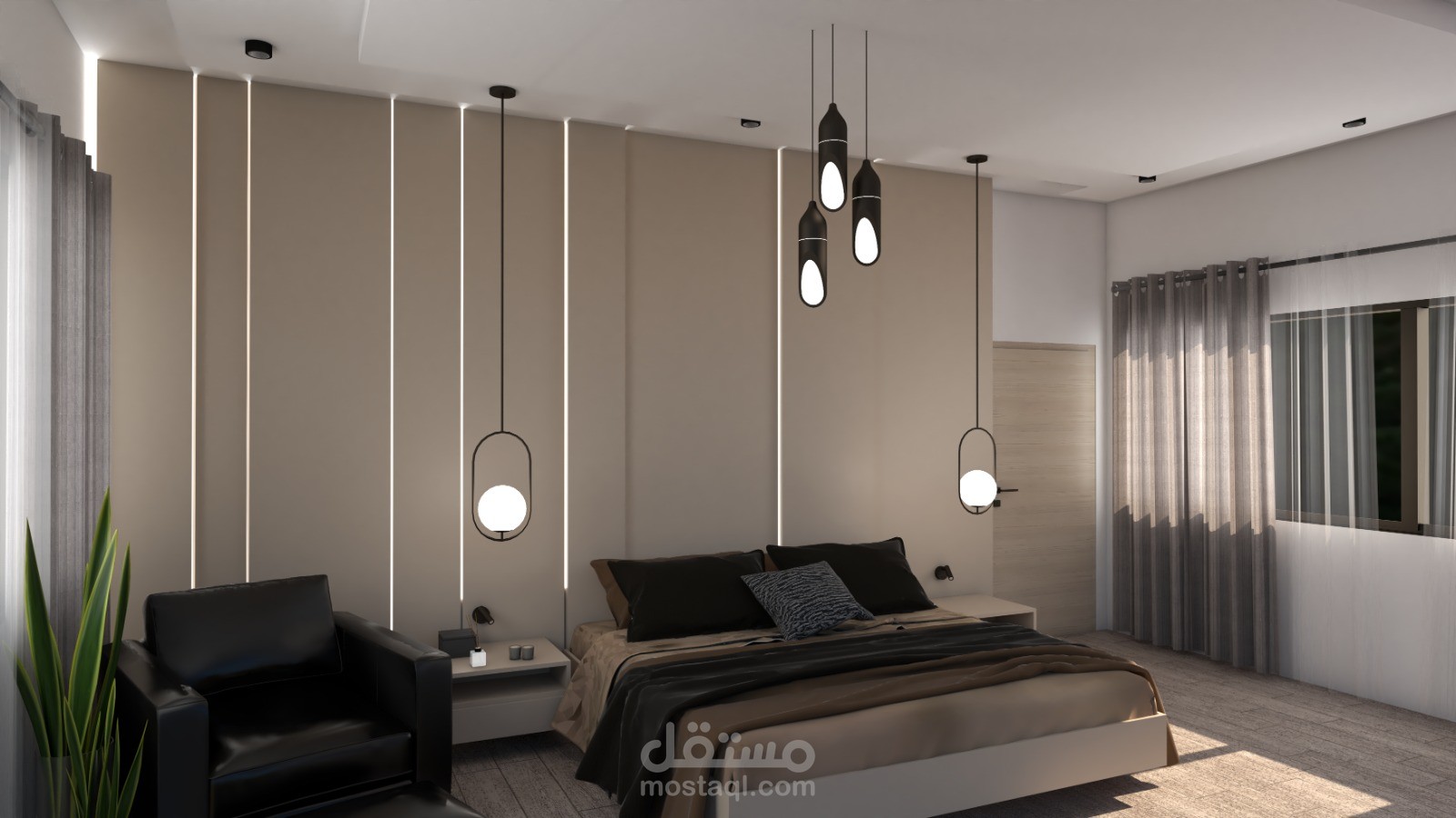 A cozy and warm main bedroom designed with rich brown tones and soft lighting to create a relaxing and intimate atmosphere. The combination of warm materials, balanced lighting, and simple lines enhances comfort while maintaining a refined and modern feel.