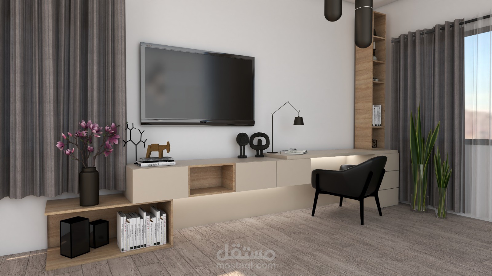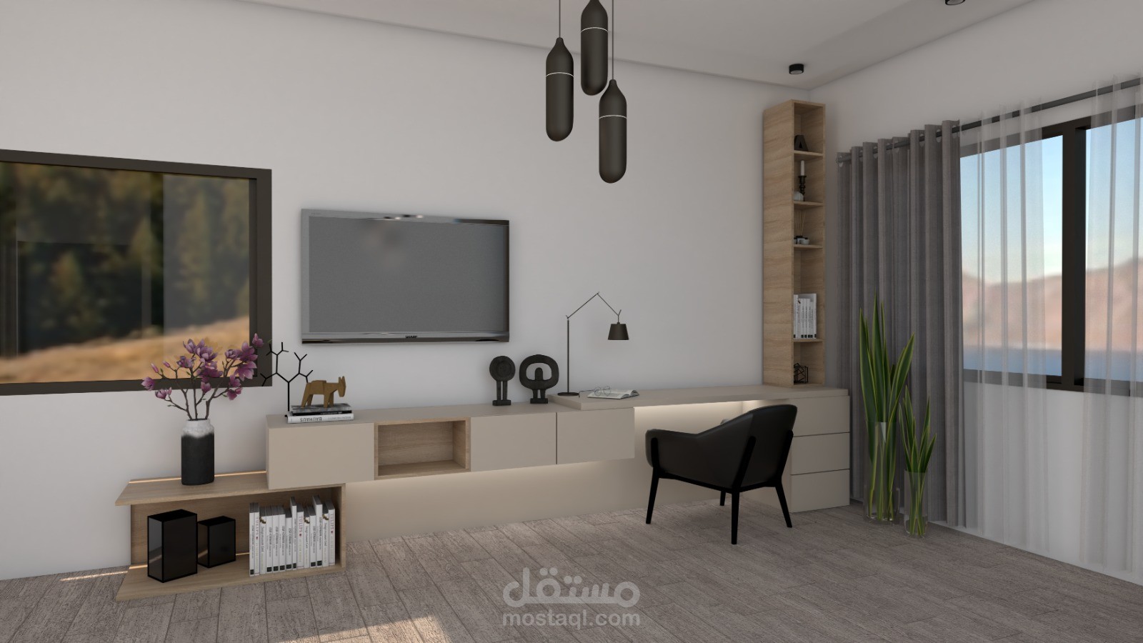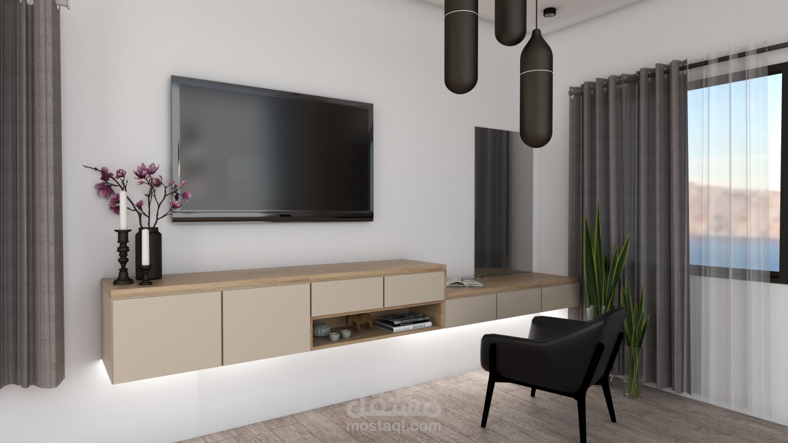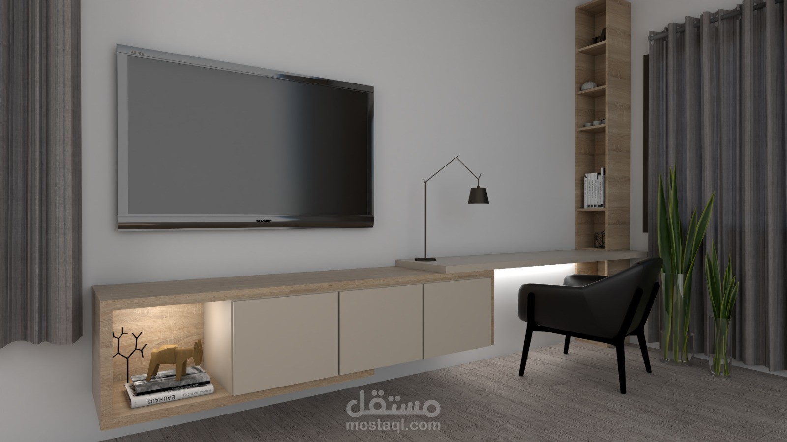 A cozy and warm main bedroom designed with rich brown tones and soft lighting to create a relaxing and intimate atmosphere. The combination of warm materials, balanced lighting, and simple lines enhances comfort while maintaining a refined and modern feel.