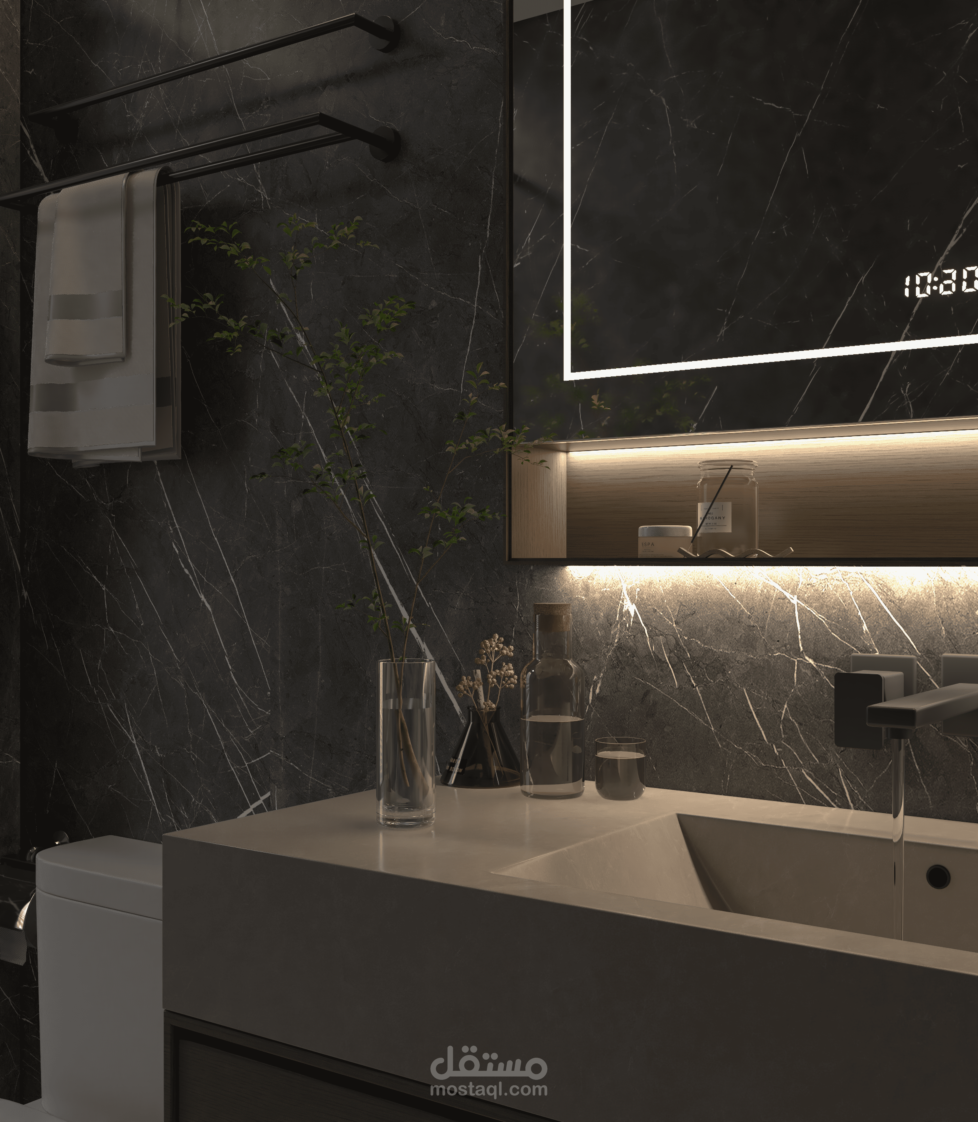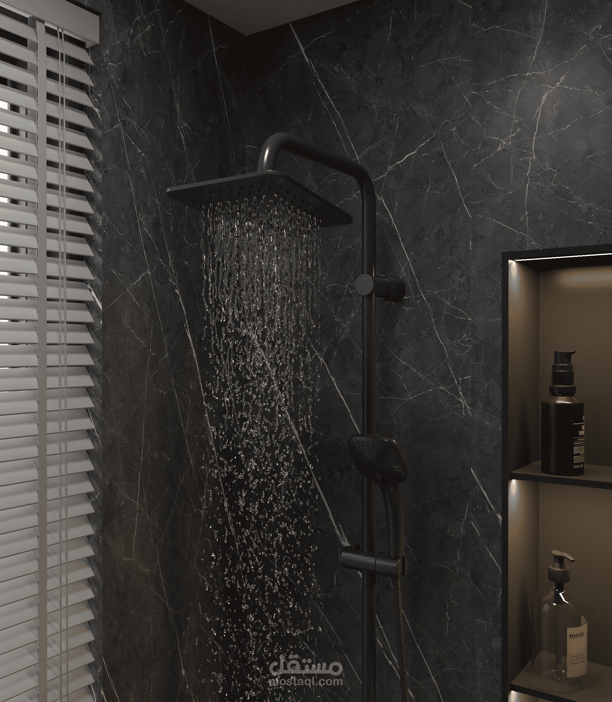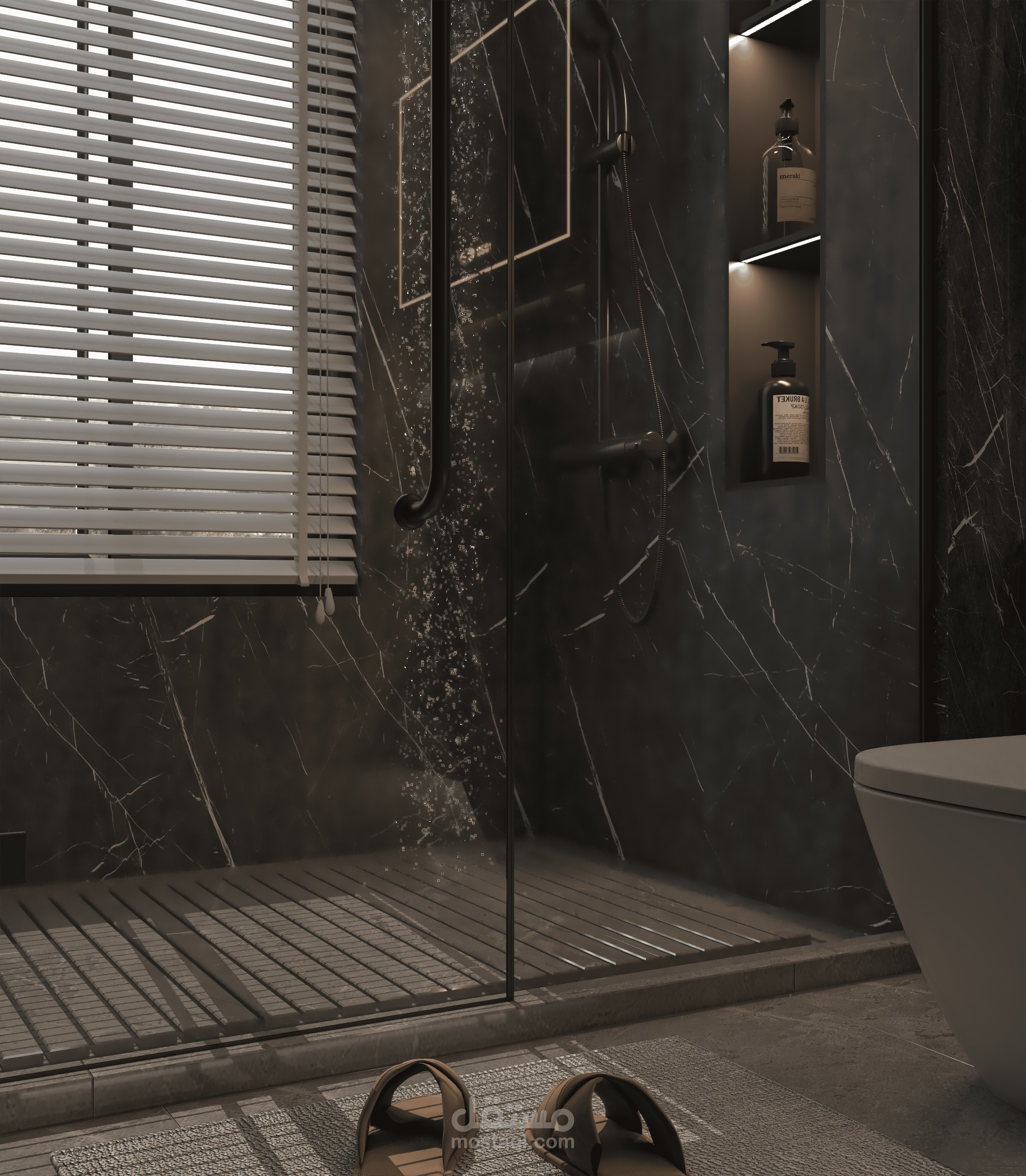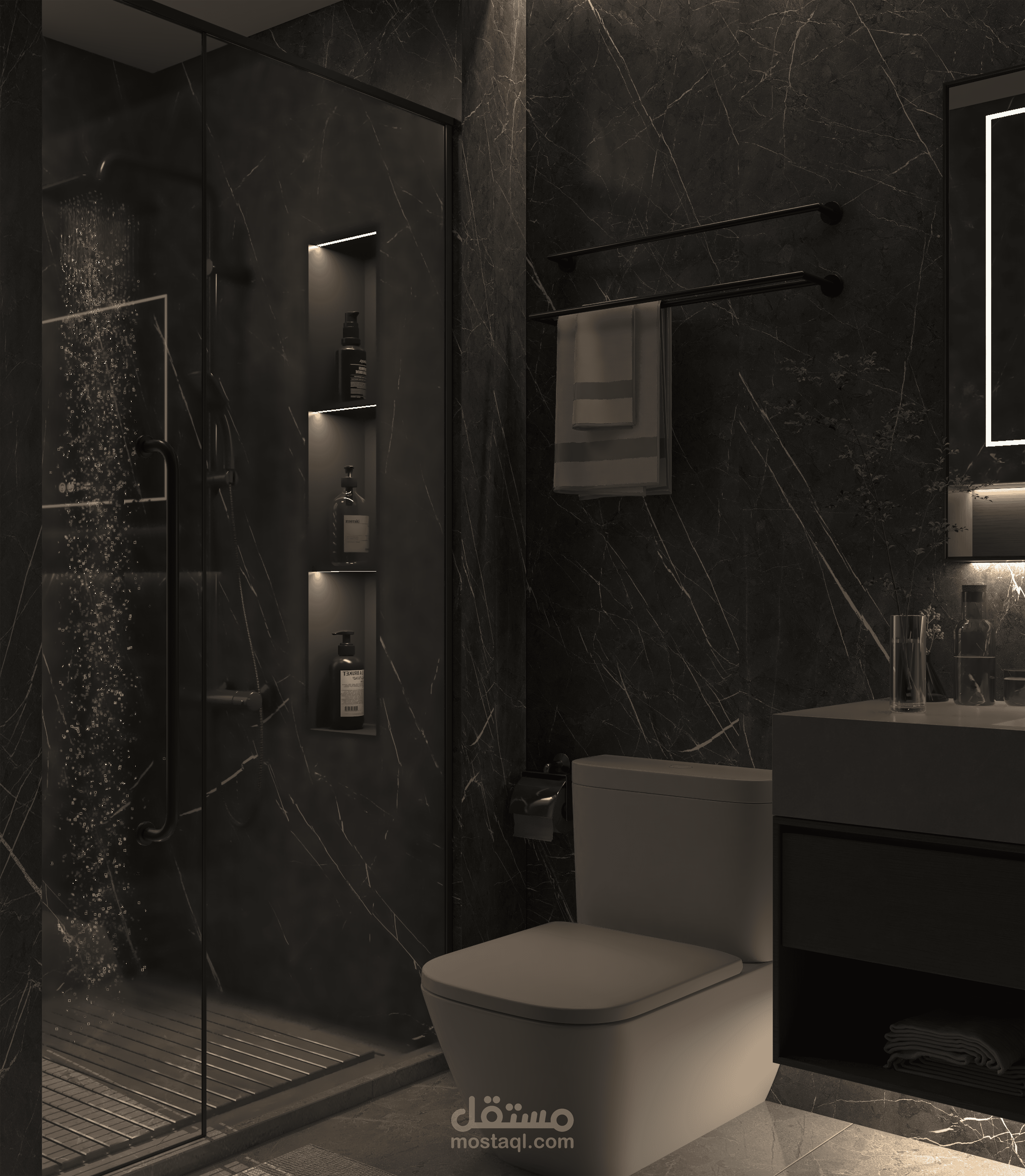 Highlights: Dark marble elegance, warm ambient lighting, matte black accents, and a minimalist spa-inspired vibe.