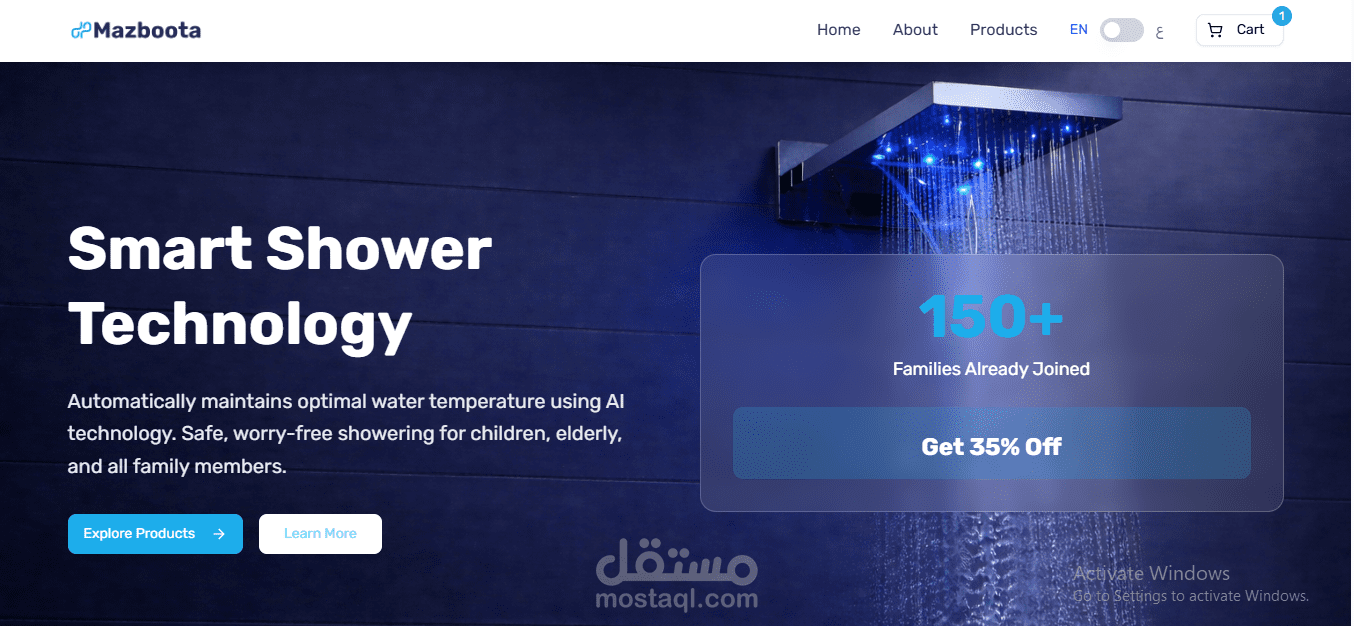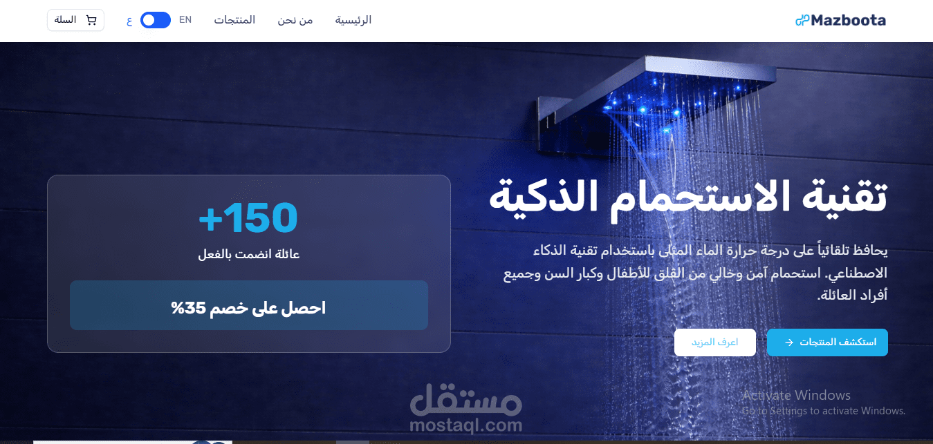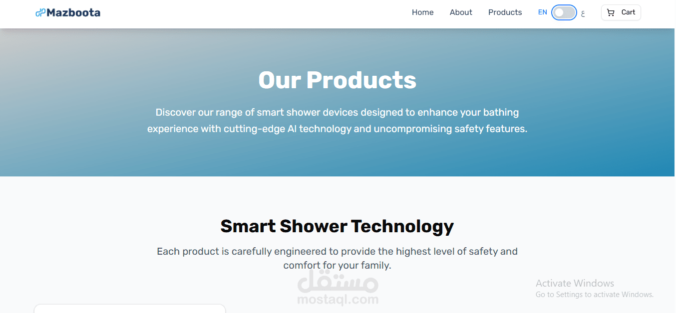 Mazboota is a modern, bilingual (Arabic & English) e-commerce website built with React. It showcases and sells smart shower products, allowing users to browse, learn more, and purchase directly from the site.