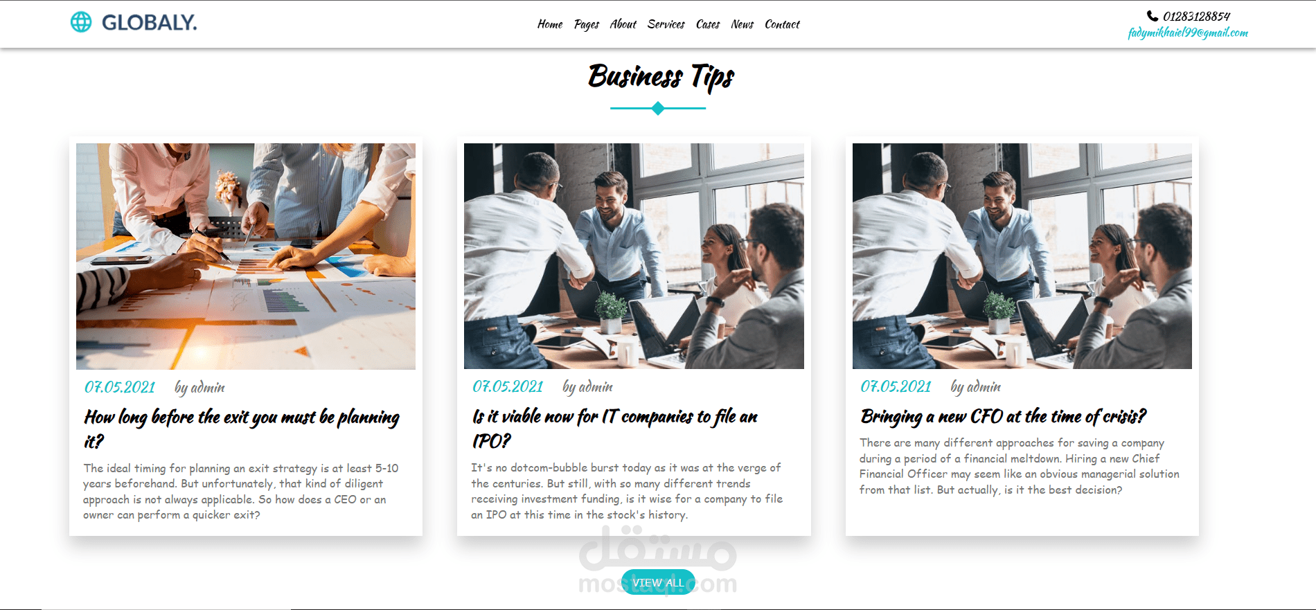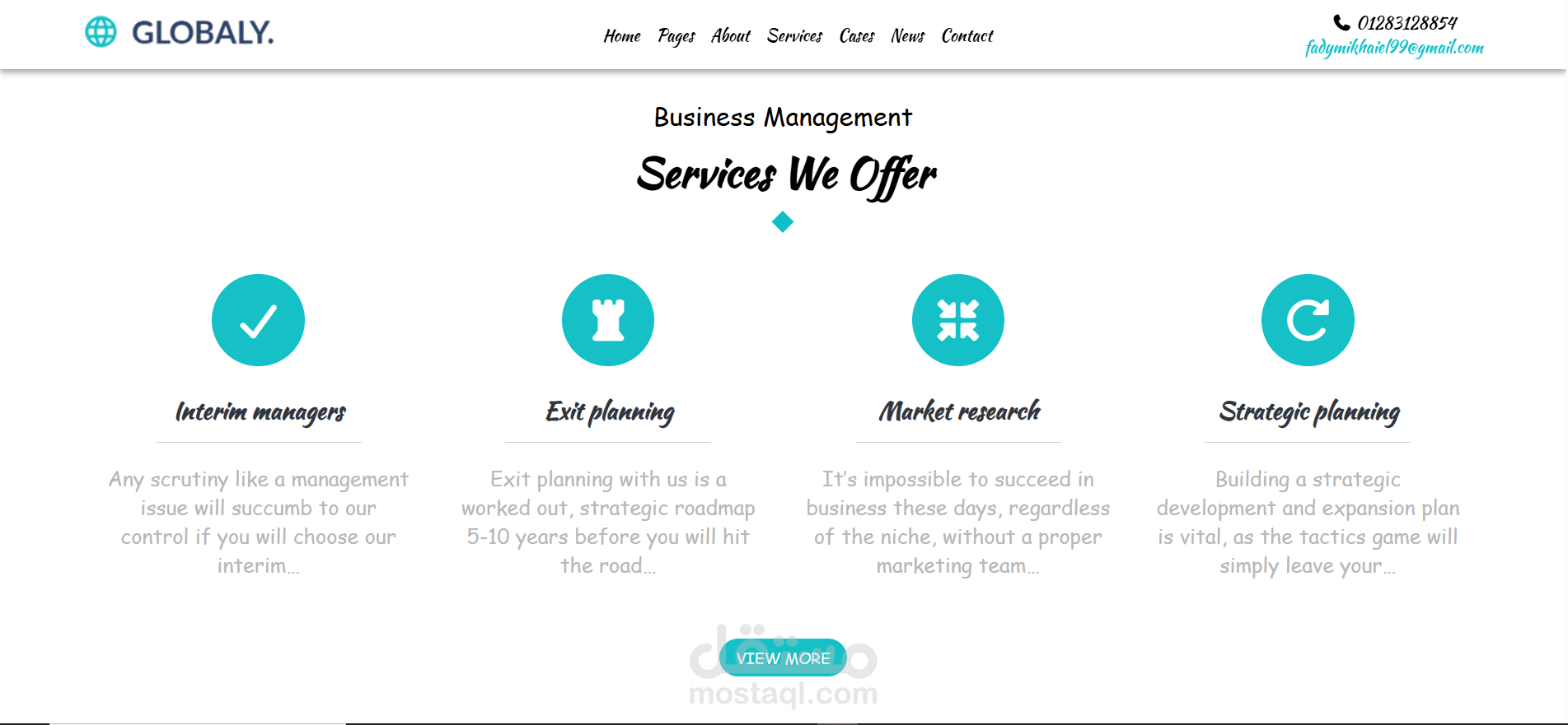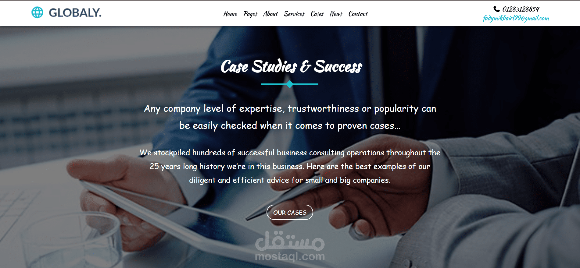 The Globaly site is a professional business service landing page showcasing comprehensive business management solutions, including interim management, market research, strategic planning, and consulting services. The homepage features sections on services offered, case studies, business tips, and client testimonials, all presented in a clean, responsive layout designed to highlight expertise in helping companies improve performance and achieve growth