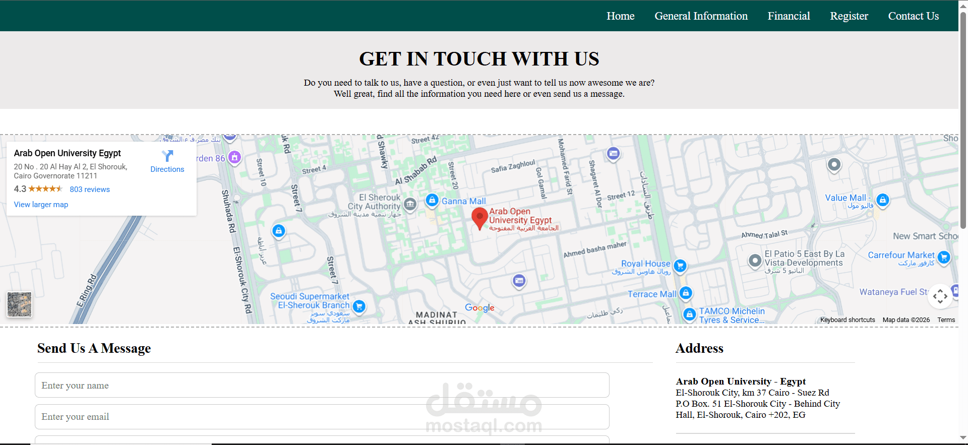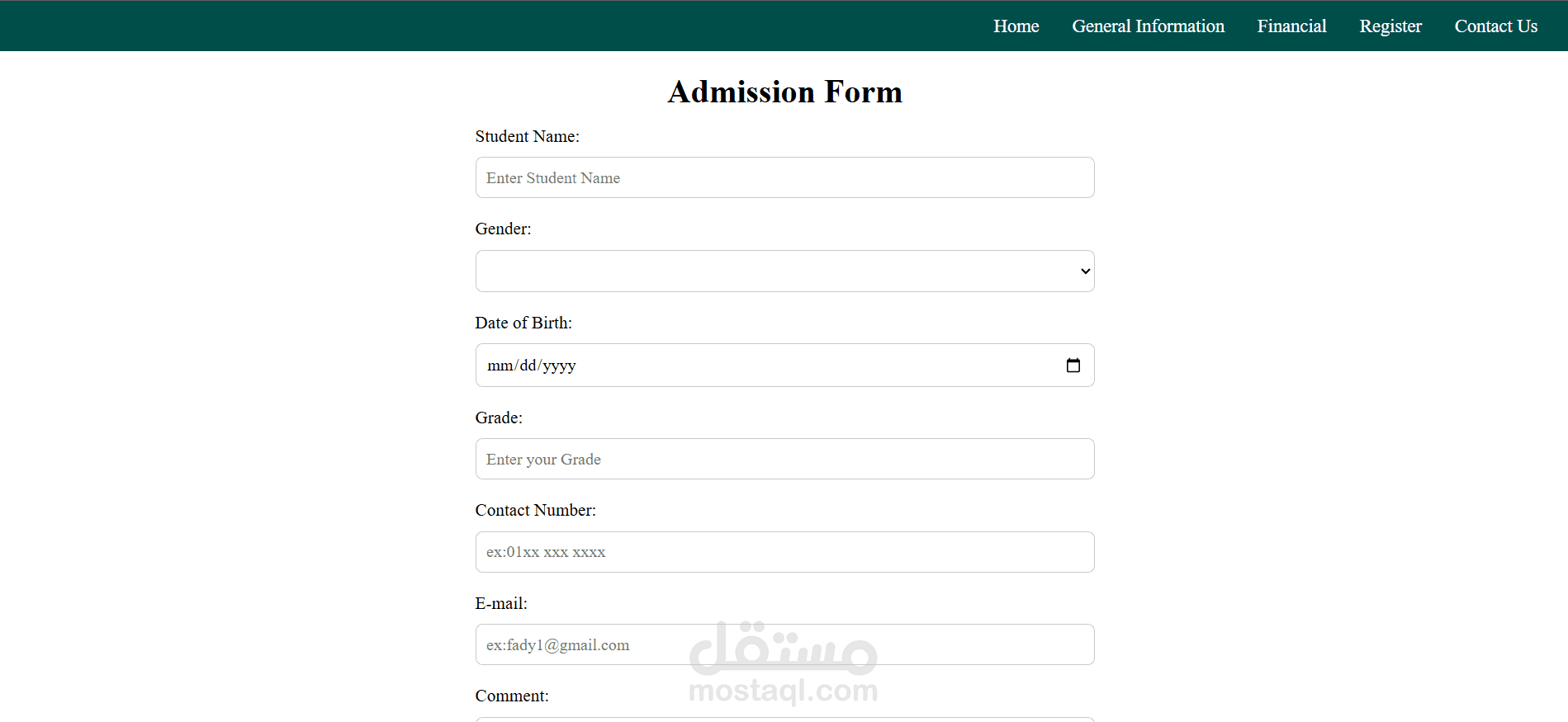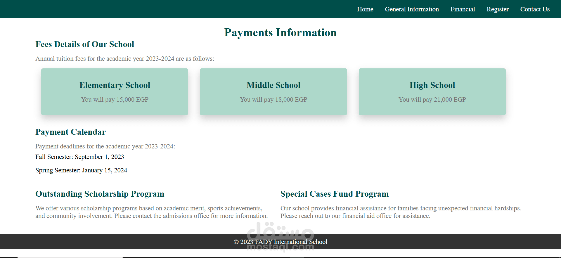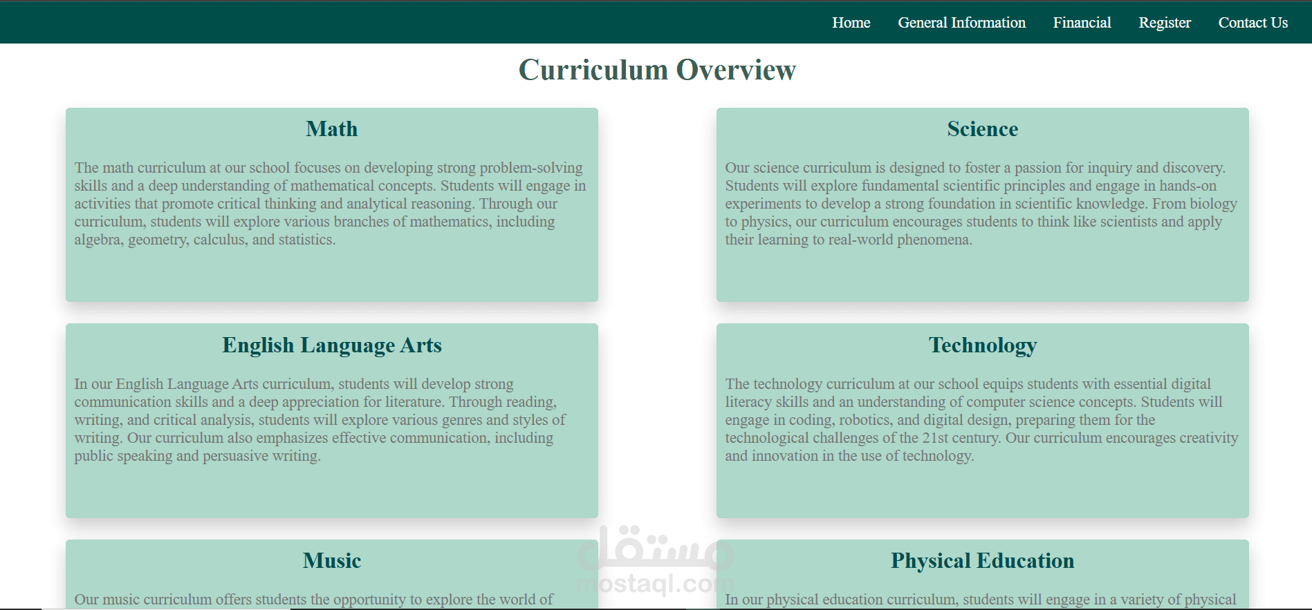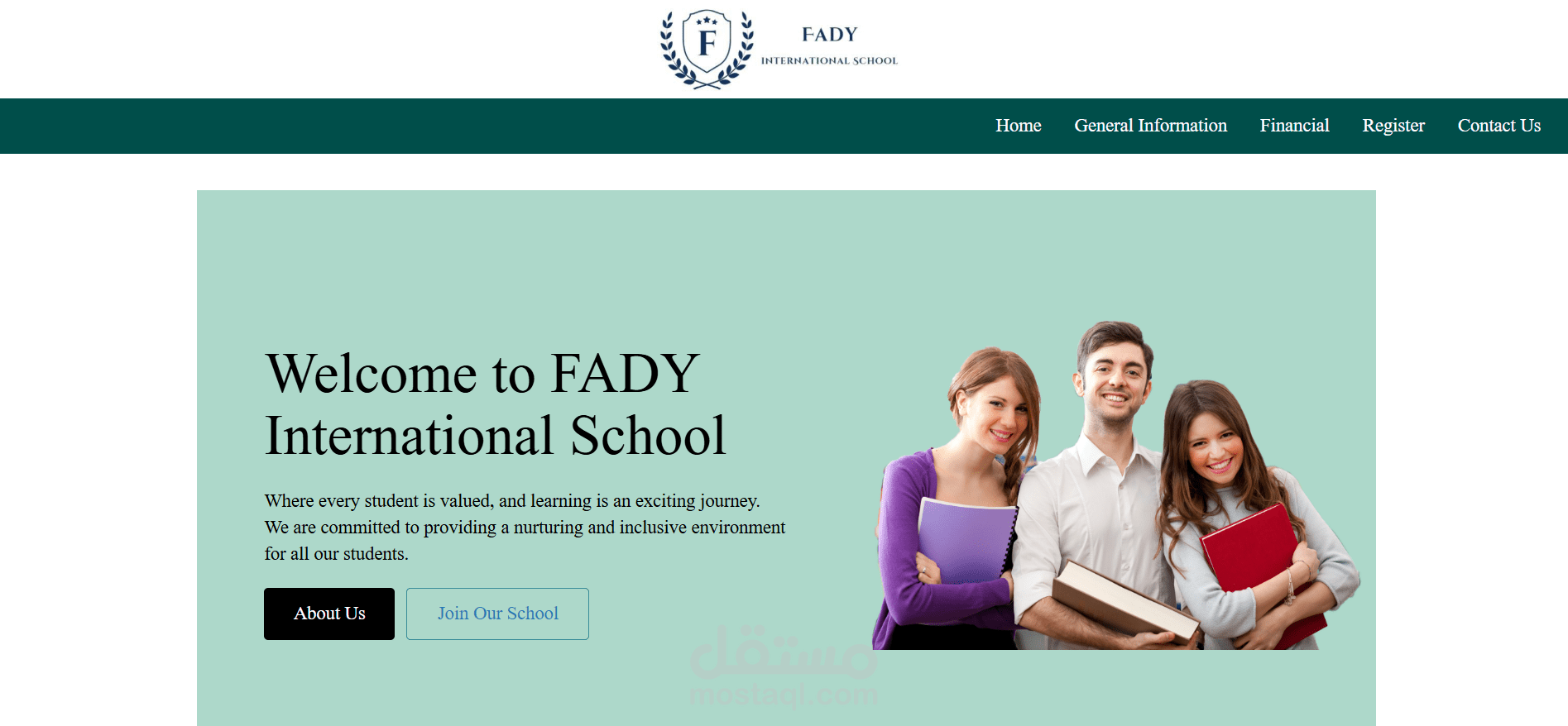 موقع ويب تعريفي لمدرسة دولية تم تصميمه وتطويره لعرض معلومات المدرسة بشكل منظم واحترافي. يشمل الموقع صفحات أساسية مثل الصفحة الرئيسية، معلومات عامة عن المدرسة، قسم مالي، صفحة تواصل، ونموذج تسجيل إلكتروني للطلاب.
