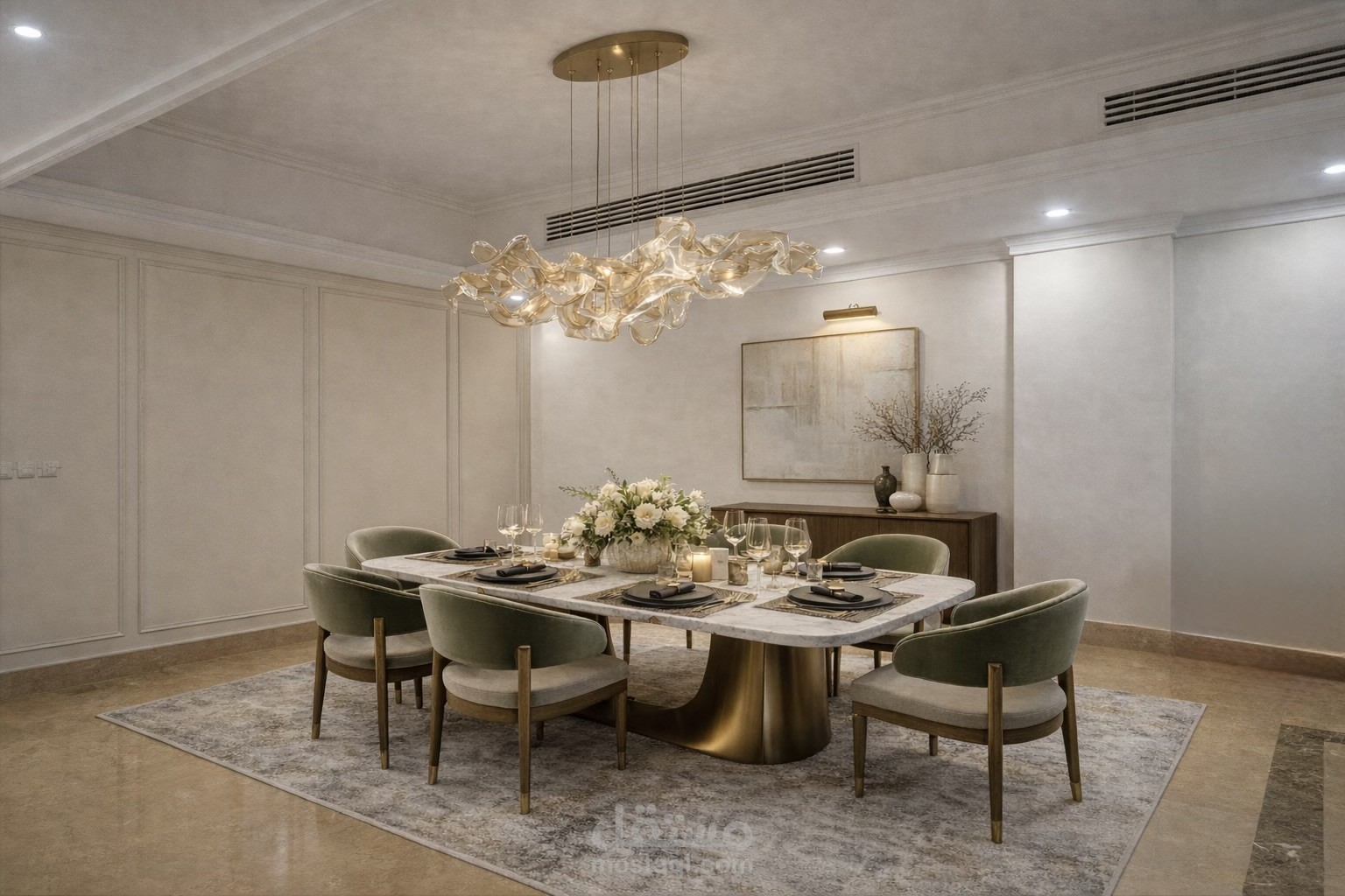 الإضاءة المدروسة تضيف عمقًا ودفئًا للمساحة، لتخلق أجواء هادئة ومتناغمة تناسب الحياة اليومية والاستقبال بذوق راقٍ