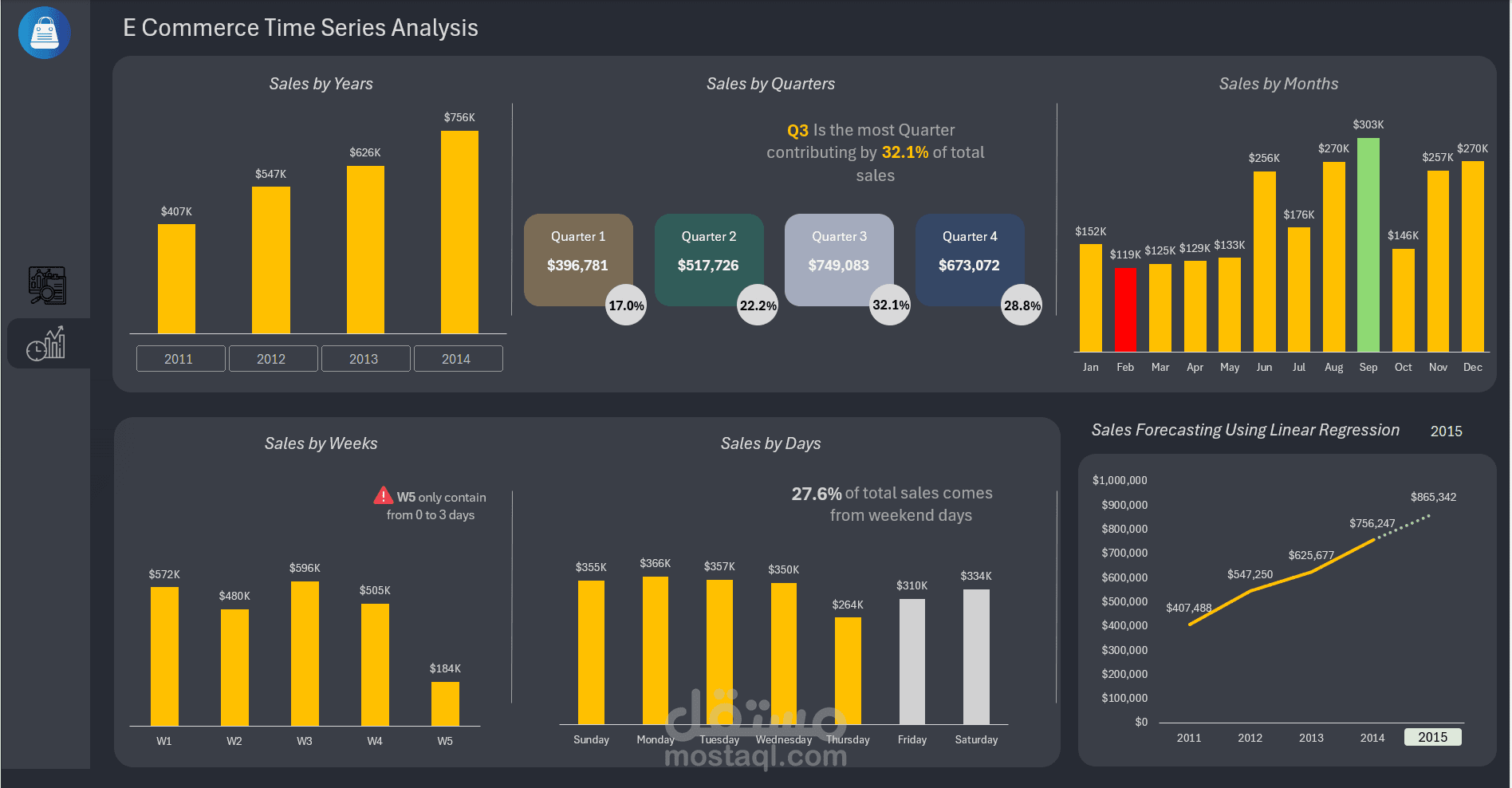 عملت تحليل متكامل لبيانات مبيعات E-Commerce باستخدام أدوات الإكسل المتقدمة، عشان نقيم الأداء ونعرف السوق رايح فين، وكمان نتوقع المبيعات اللي جاية.