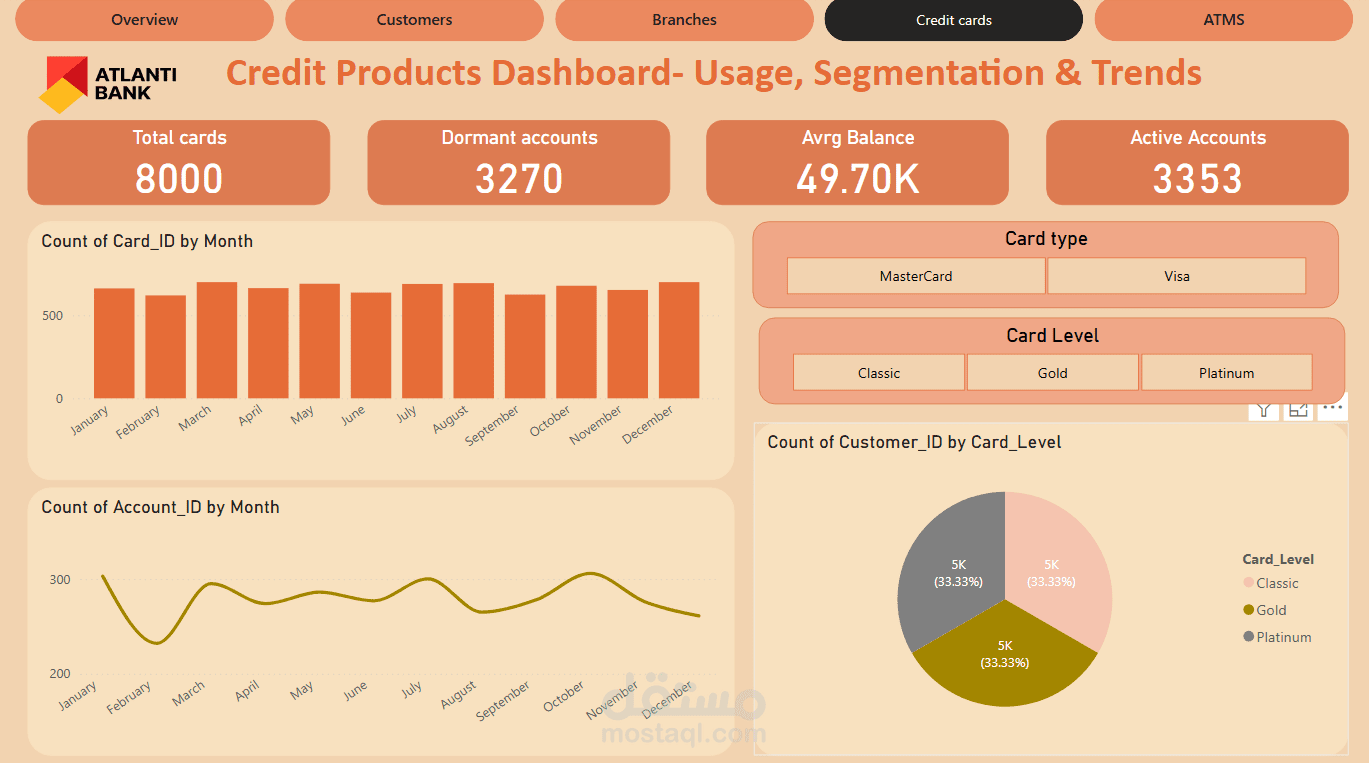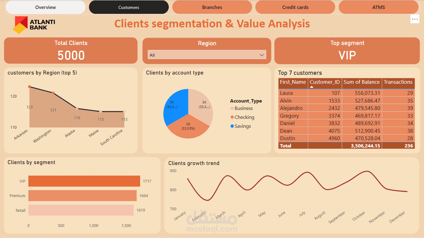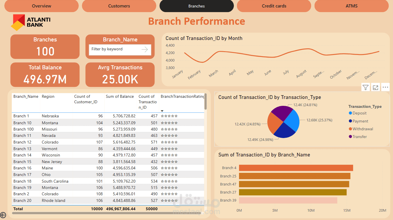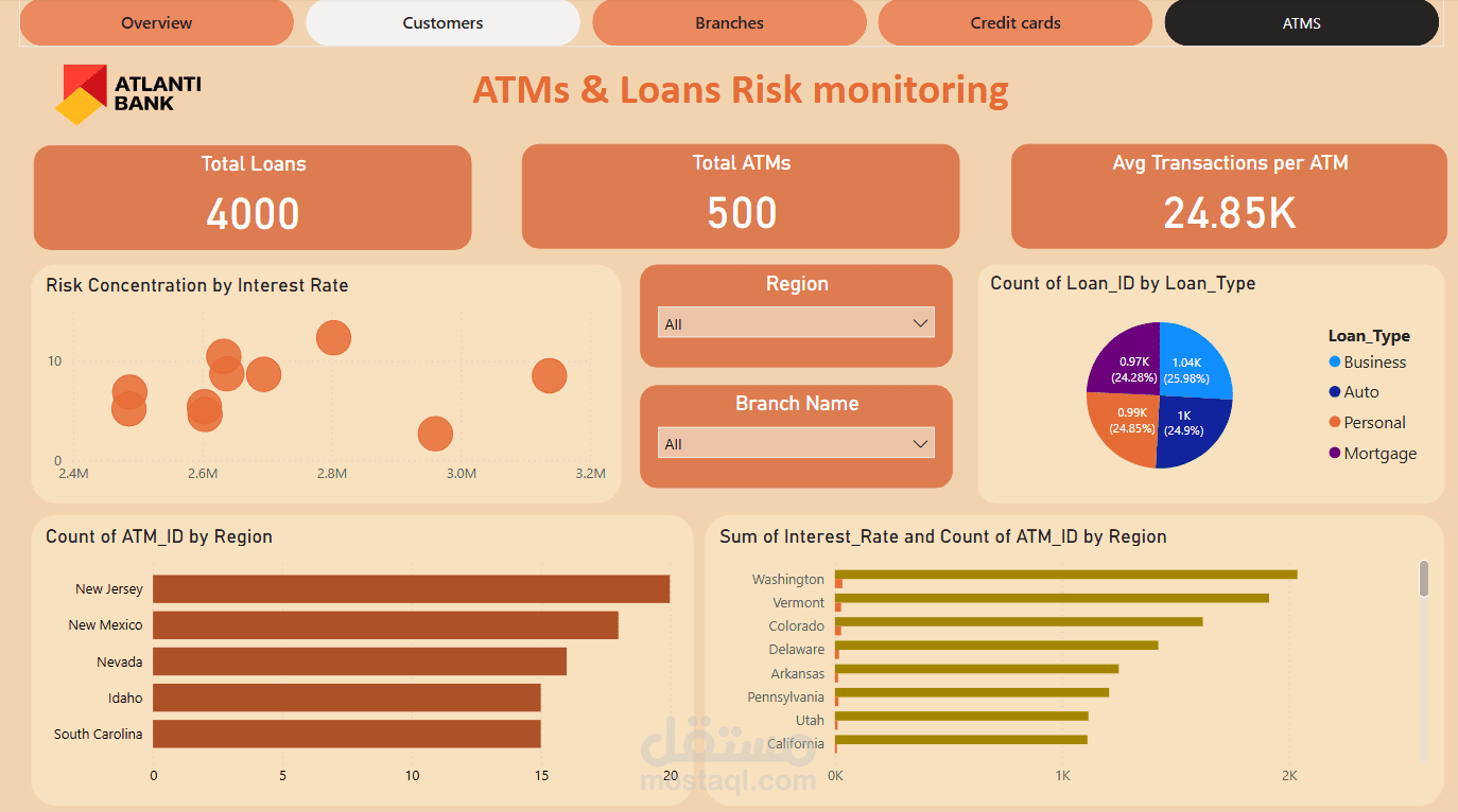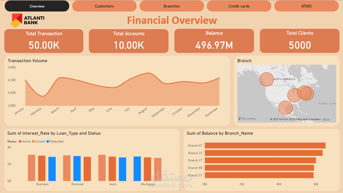 لوحة تحكم تفاعلية تم تطويرها باستخدام Power BI لعرض الأداء المالي لبنك ATLANTI. تشمل مؤشرات رئيسية مثل عدد المعاملات، عدد الحسابات، إجمالي الرصيد، وعدد العملاء. تحتوي اللوحة على رسوم بيانية تحليلية لحجم المعاملات شهريًا، توزيع الفروع جغرافيًا، وتحليل أسعار الفائدة حسب نوع القرض وحالة الحساب. تهدف اللوحة إلى دعم اتخاذ القرار وتحسين كفاءة العمليات البنكية.
