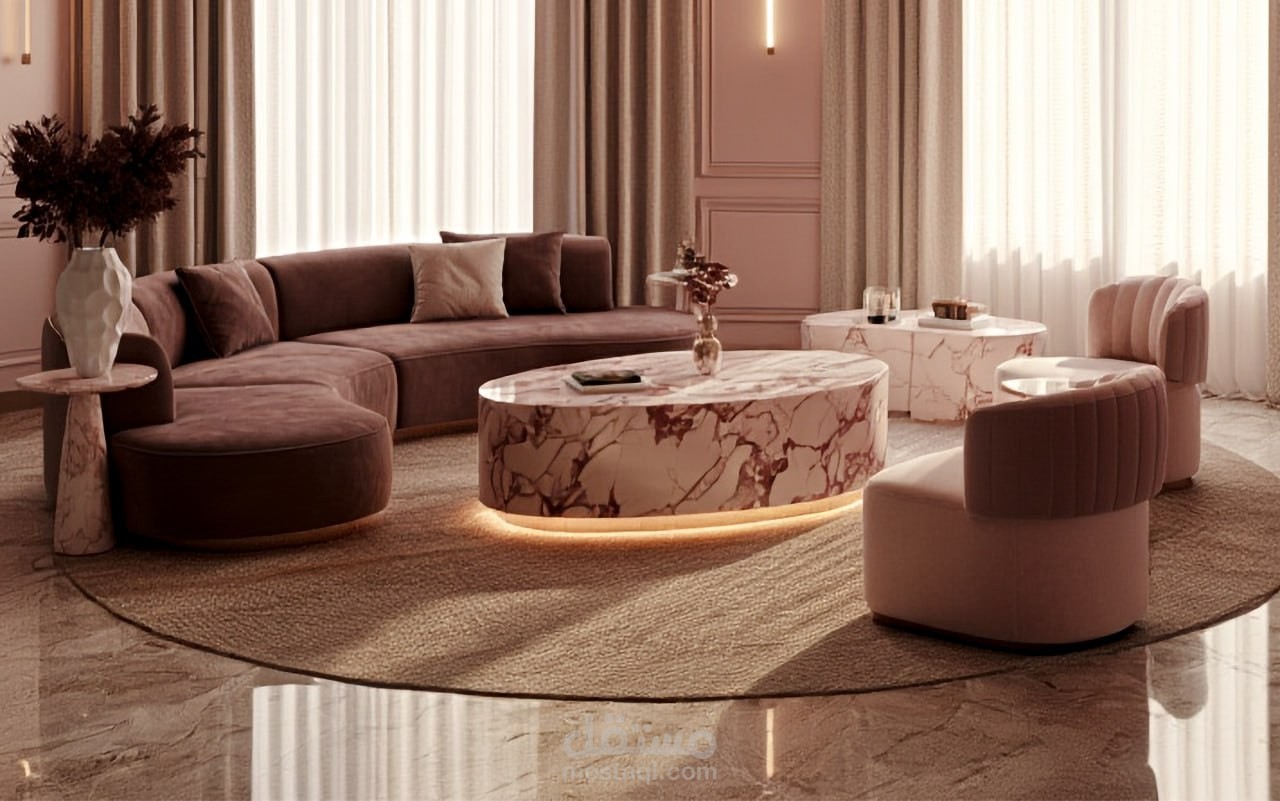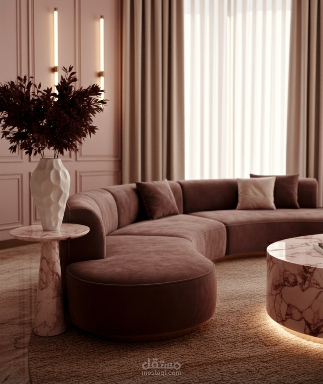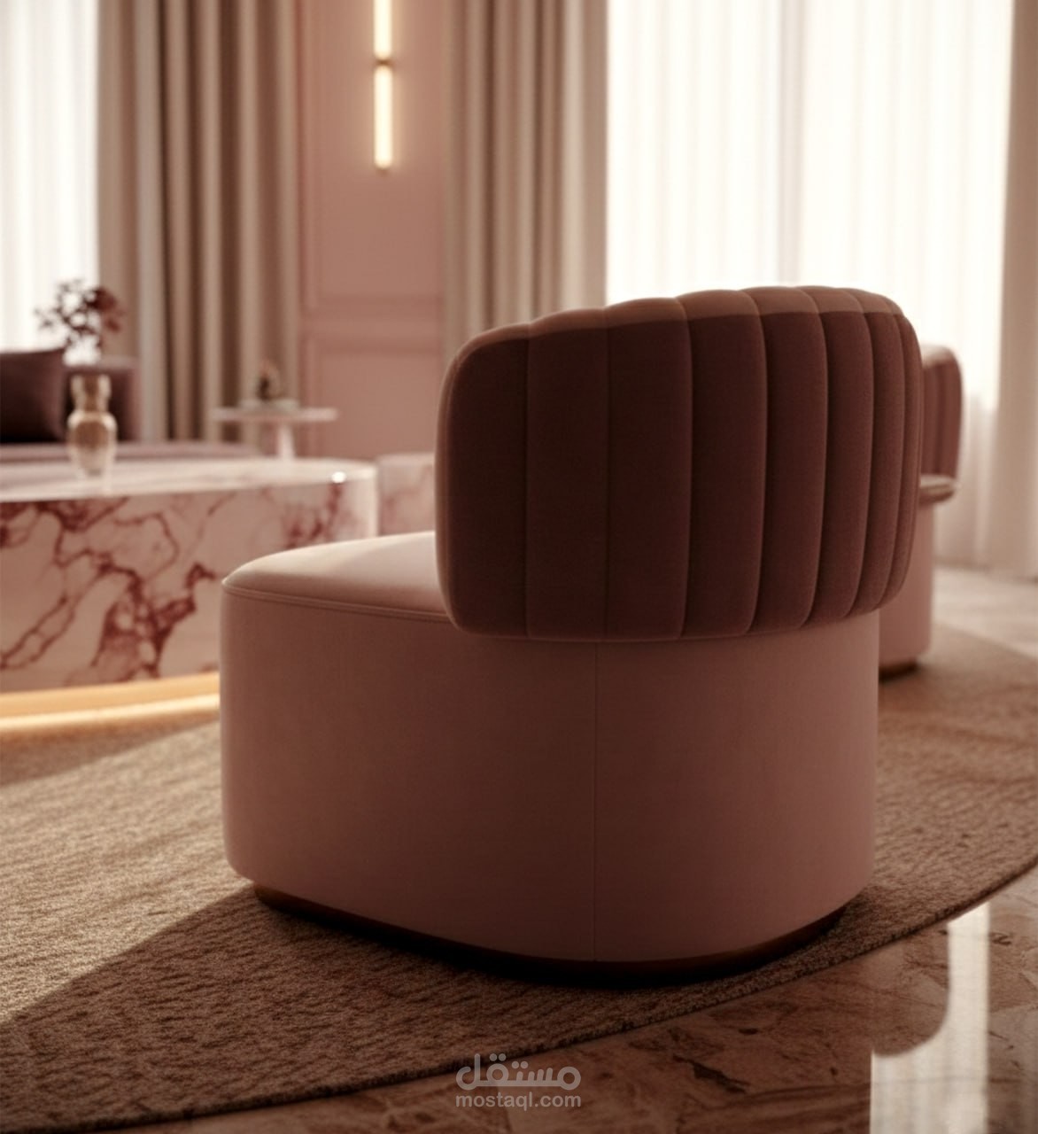 ROSE QUARTZ – Soft Luxury Lounge is a celebration of warm, cinematic elegance expressed through a rich, boutique-inspired interior. Designed to feel like a private penthouse retreat, the space blends soft feminine curves, blush quartz surfaces, champagne-gold accents, and layered ambient lighting to create a calm yet luxurious atmosphere. Every material—velvet upholstery, polished stone, sculptural metalwork—was chosen to highlight texture, depth, and quiet sophistication. The result is a warm, rich lounge crafted with precision and softness, offering an intimate luxury experience without visual noise—just pure, refined comfort.