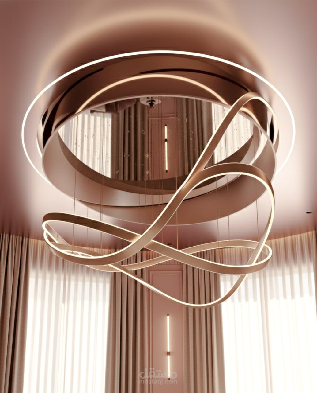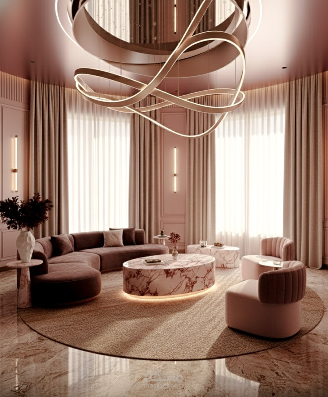 Highlights: Sculptural ribbon chandelier, pink quartz surfaces, warm layered lighting, rich textures, curved furniture, boutique-inspired mood.