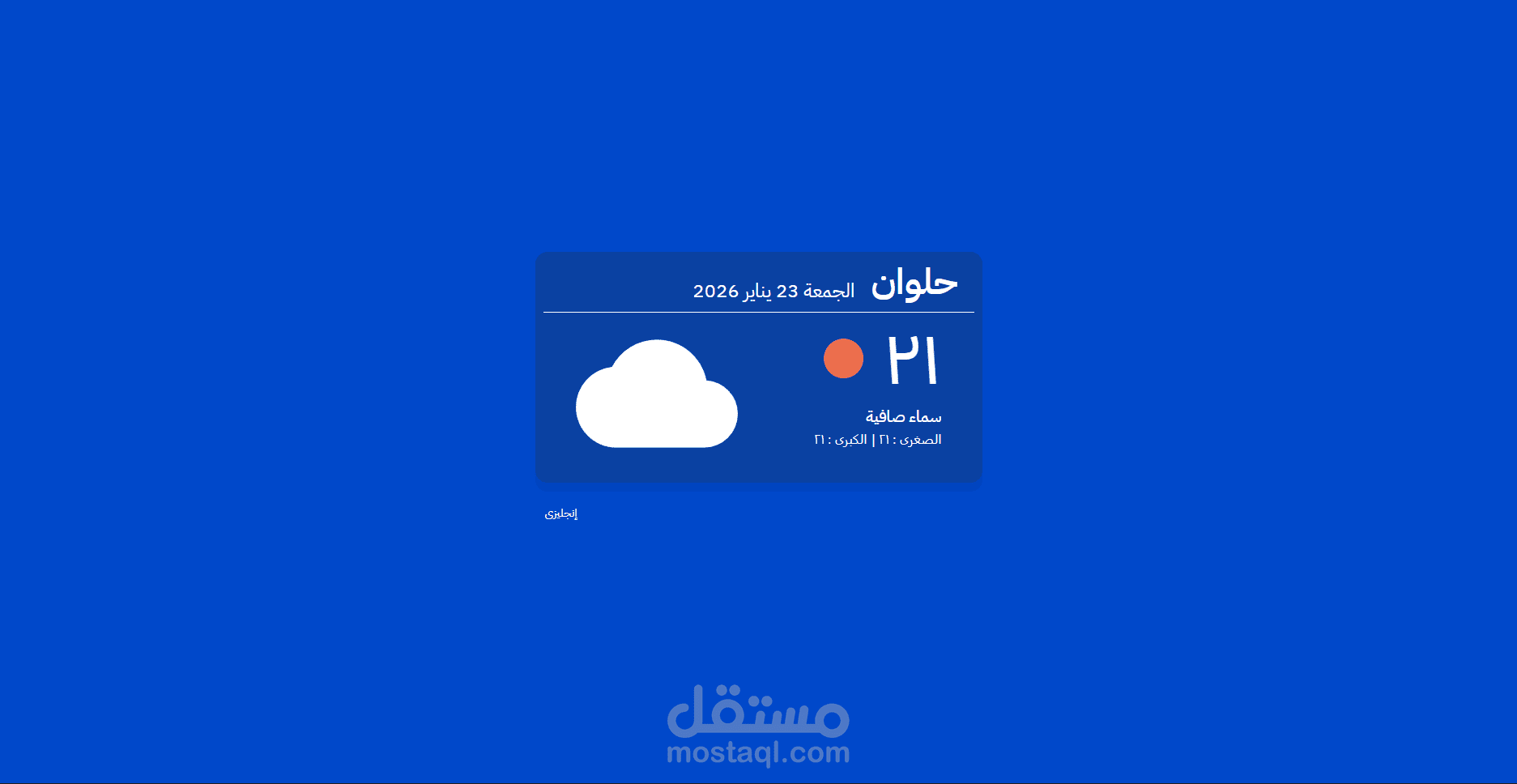 تم تطوير تطبيق طقس ديناميكي يوفّر معلومات الطقس في الوقت الحقيقي اعتمادًا على موقع المستخدم، مع تجربة استخدام سهلة ومُحلية تدعم تعدد اللغات وعرضًا دقيقًا للبيانات.