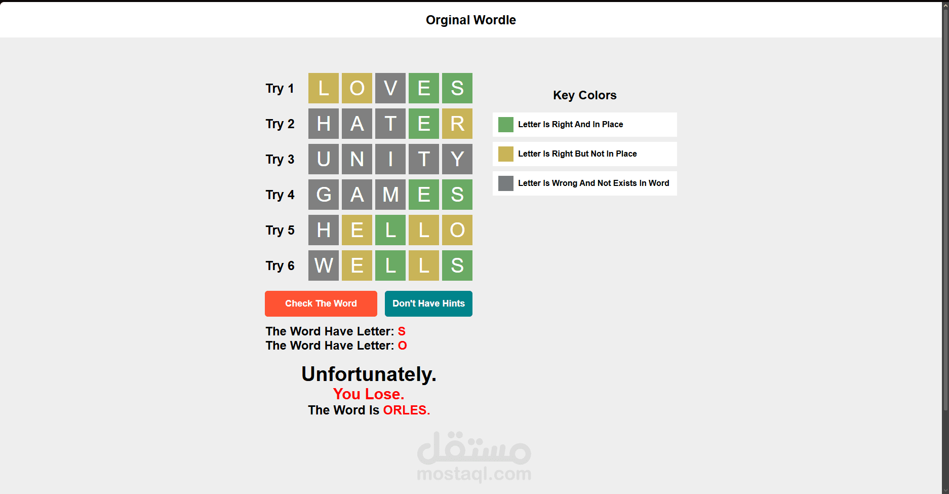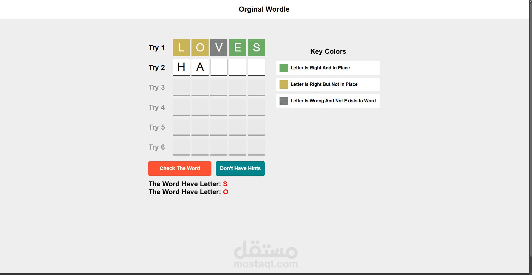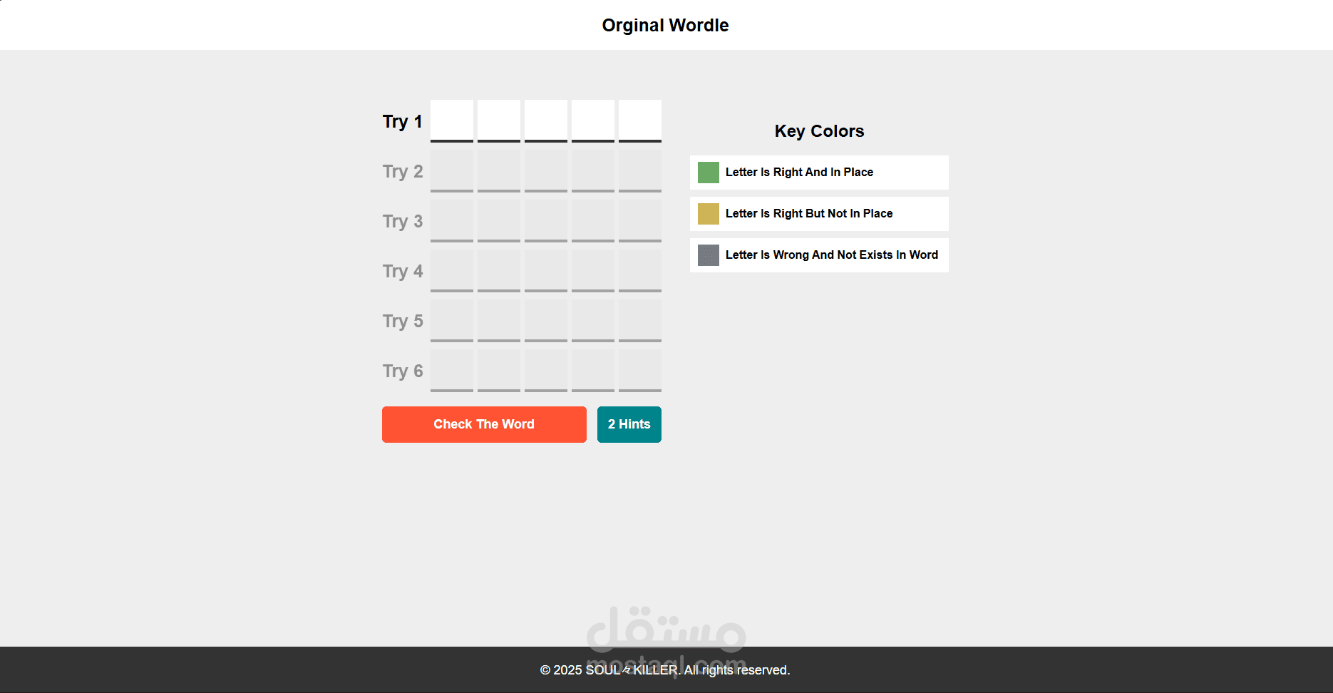 قمت بتطوير لعبة Wordle تفاعلية باستخدام HTML وCSS وJavaScript فقط، حيث تحاكي تجربة اللعبة الأصلية مع واجهة بسيطة وسهلة الاستخدام. تم تصميم الواجهة بالكامل بالـ CSS مع الاهتمام بالتنسيق والاستجابة لمختلف أحجام الشاشات، بينما تم تنفيذ منطق اللعبة والتحقق من صحة الكلمات وتلوين الحروف حسب حالتها باستخدام JavaScript. يتيح المشروع للمستخدم إدخال المحاولات، الحصول على تلميحات لونية توضّح ما إذا كان الحرف في المكان الصحيح أو موجود بمكان آخر أو غير موجود بالكلمة، مما يوفّر تجربة لعب ممتعة وسلسة دون الاعتماد على أي مكتبات خارجية.