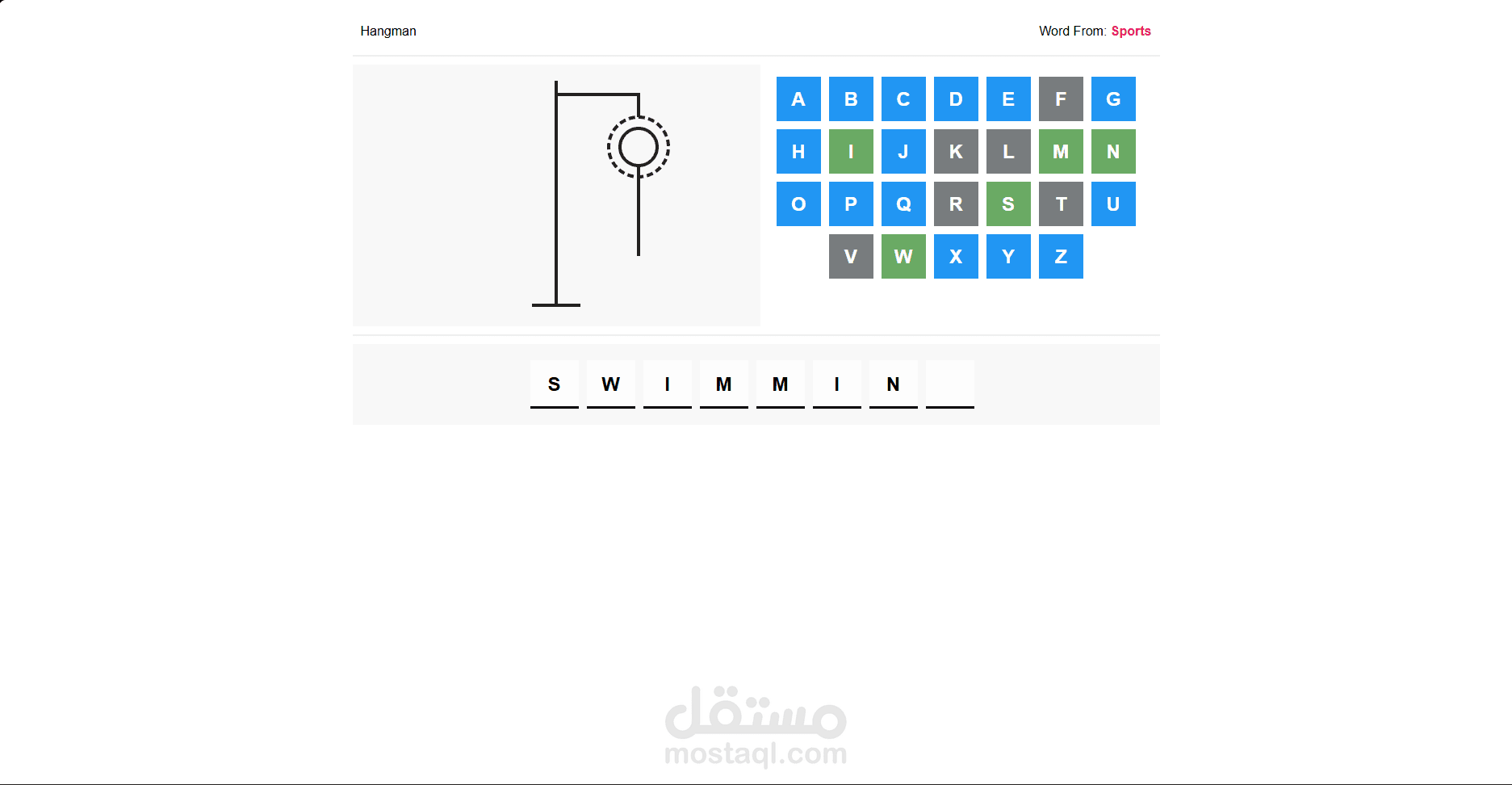 قمت بتطوير لعبة Hangman تفاعلية باستخدام HTML وCSS وJavaScript فقط، تحاكي أسلوب اللعبة الكلاسيكي مع واجهة بسيطة وسهلة الاستخدام. تم تصميم شكل الواجهة ورسم مراحل الرجل المشنوق باستخدام CSS، بينما تم تنفيذ منطق اللعبة بالكامل بالـ JavaScript، بما في ذلك اختيار كلمة عشوائية، تتبّع المحاولات الخاطئة، إظهار الحروف الصحيحة في أماكنها، وتعطيل الحروف التي تم اختيارها. كما تتضمن اللعبة لوحة أحرف تفاعلية، رسائل فوز وخسارة، وزر لإعادة اللعب، مما يوفّر تجربة ممتعة وسلسة دون الاعتماد على أي مكتبات أو أطر عمل خارجية.