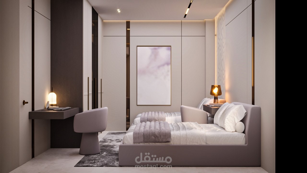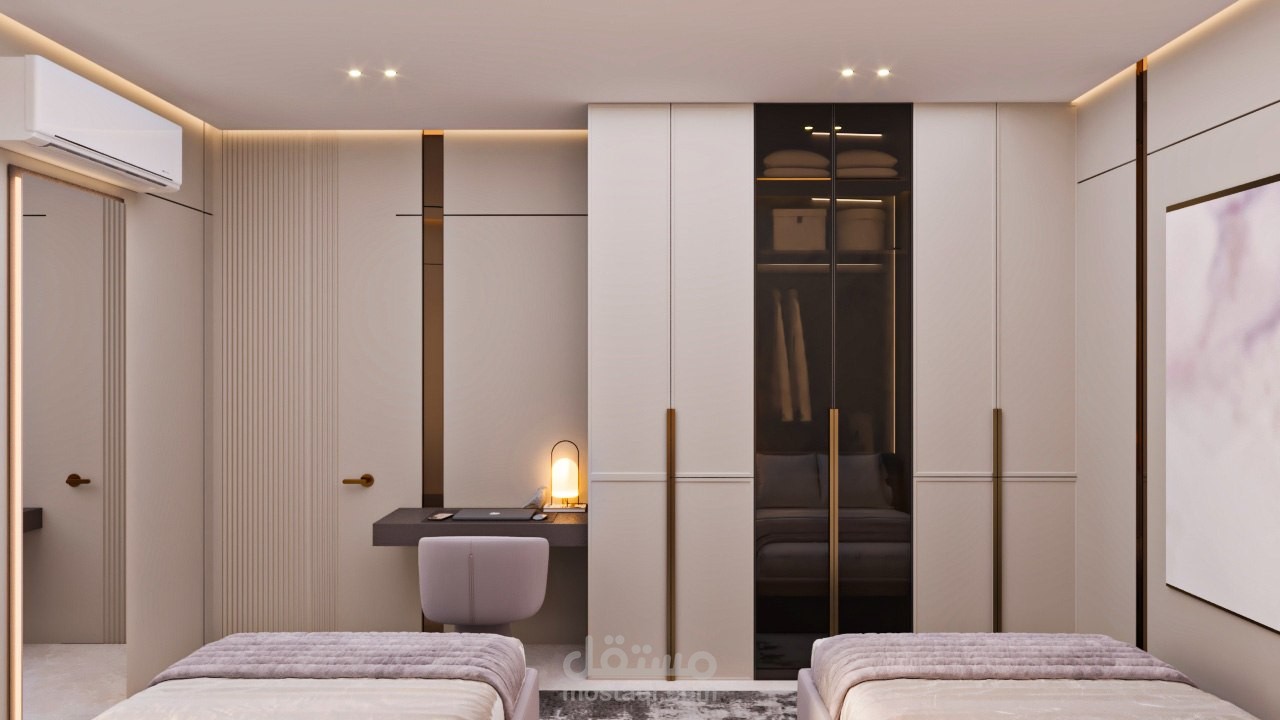 A simple and soft-designed room for two girls, reflecting their personalities and daily needs. The room uses calm colors to create a cozy and comfortable atmosphere, with each element carefully designed for both beauty and functionality.