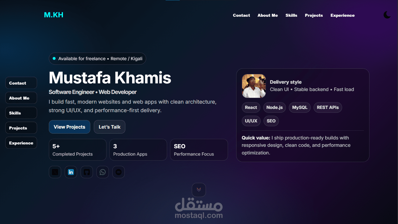 موقع Portfolio شخصي يعرض مهاراتي وأعمالي كمطوّر ويب، تم تصميمه ليكون سريعاً ومتجاوباً مع جميع الأجهزة. يحتوي على أقسام لعرض نبذة تعريفية، المهارات التقنية، ونماذج من المشاريع السابقة، مع التركيز على بساطة التصميم وسهولة التصفح.