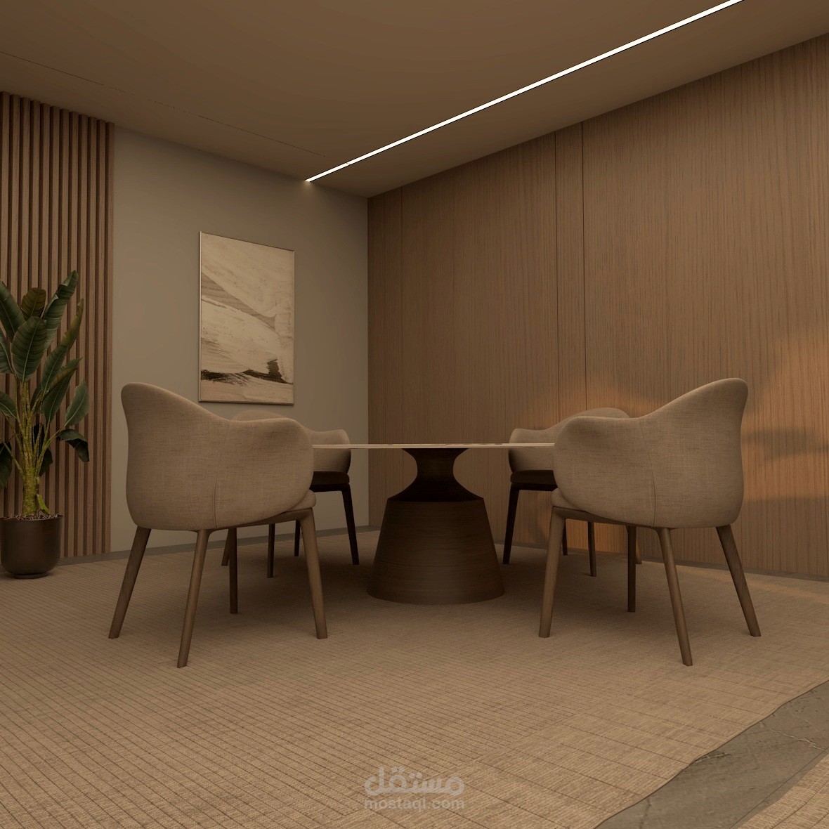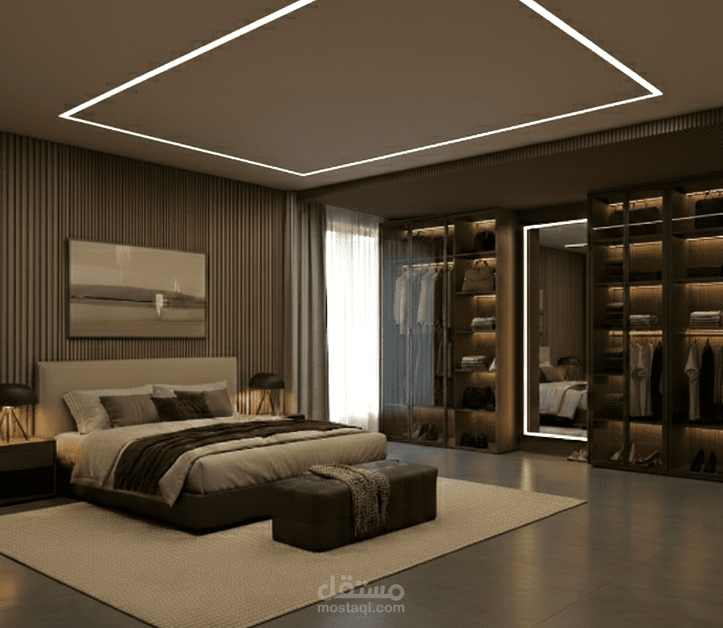 كنت مسؤولاً عن التصميم الداخلي الكامل، وتخطيط المساحات، والنمذجة ثلاثية الأبعاد، واختيار المواد، وإعداد الإضاءة، والإخراج باستخدام برنامجي 3ds Max وV-Ray.