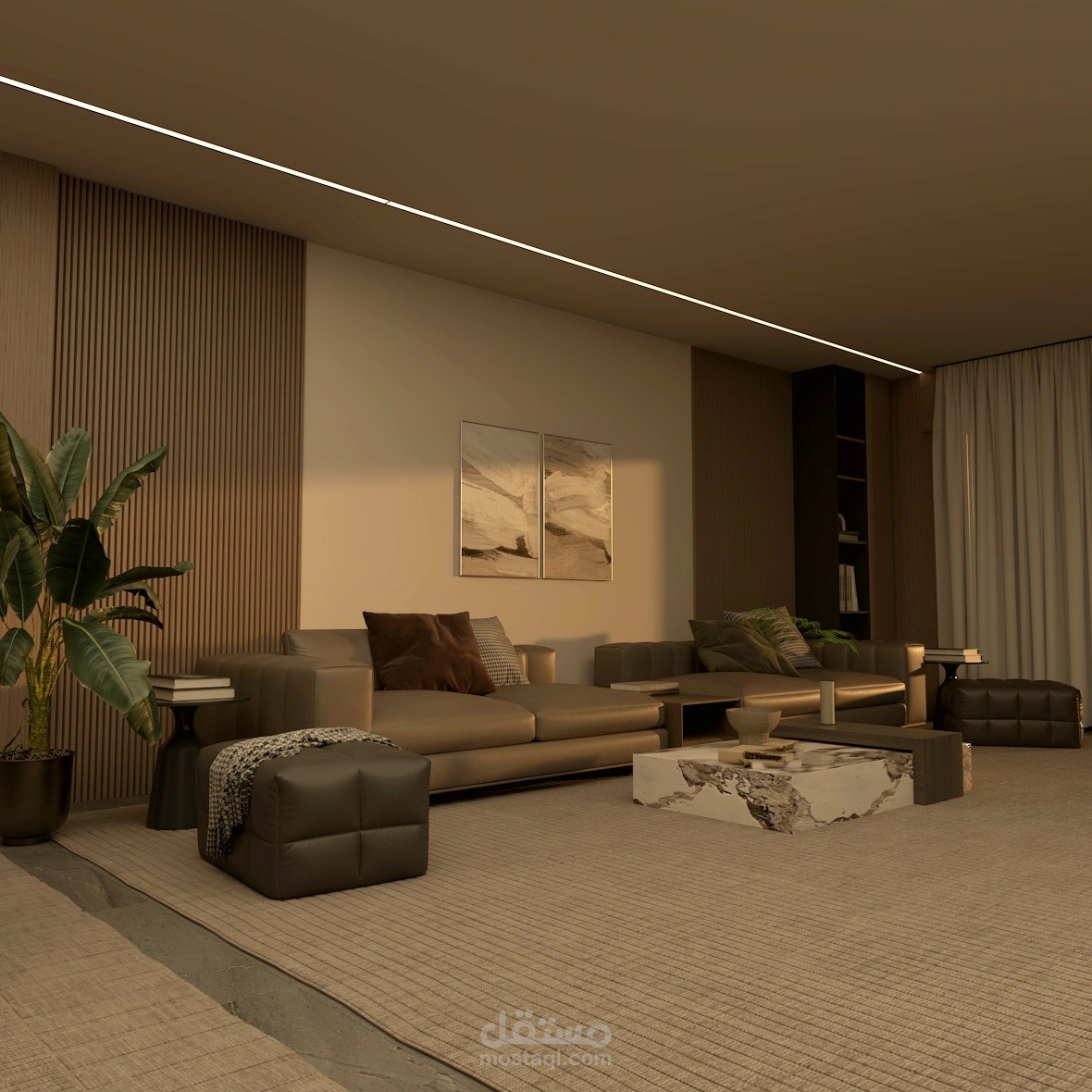 كان الهدف هو خلق مساحة معيشة هادئة وأنيقة وعملية باستخدام خطوط نظيفة وإضاءة ناعمة ومواد طبيعية.