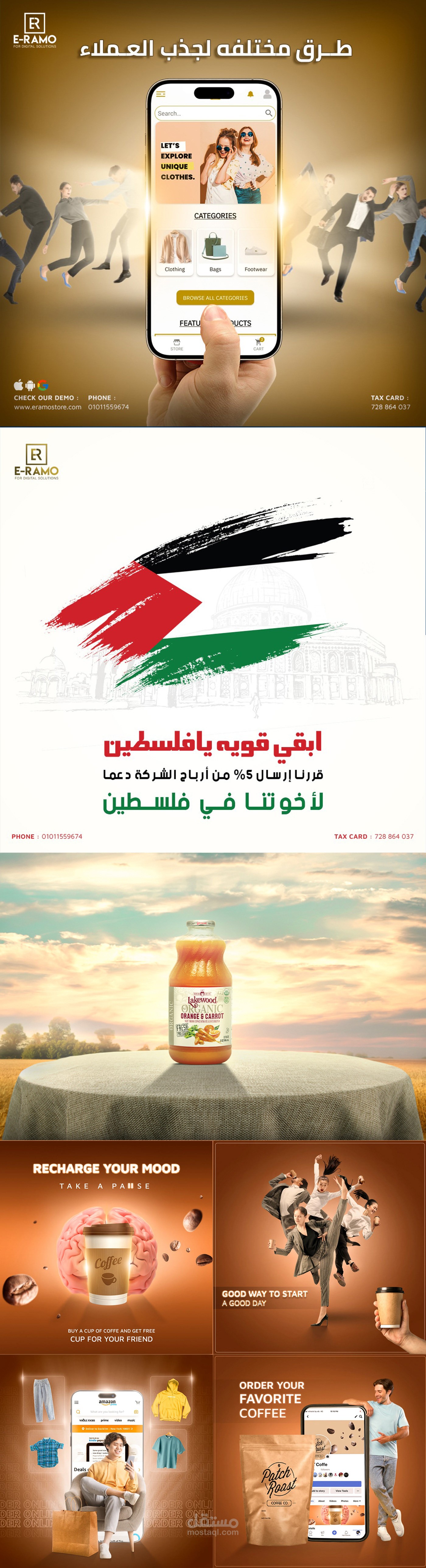 تصميم مجموعة من الإعلانات البصرية الإبداعية لعلامات تجارية ومشاريع مختلفة، مع التركيز على إبراز الهوية البصرية لكل مشروع وتوصيل الرسالة التسويقية بشكل واضح وجذاب.