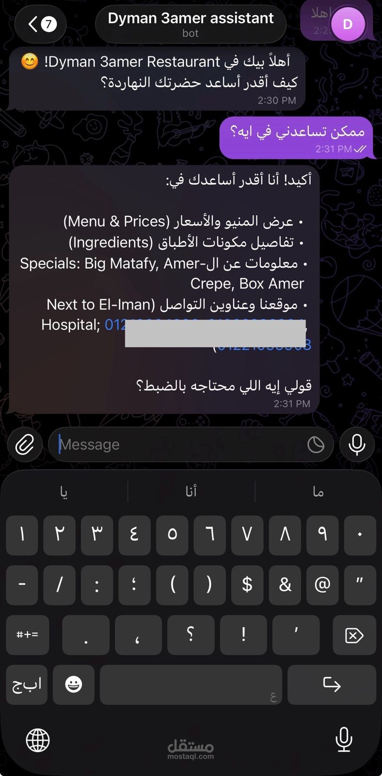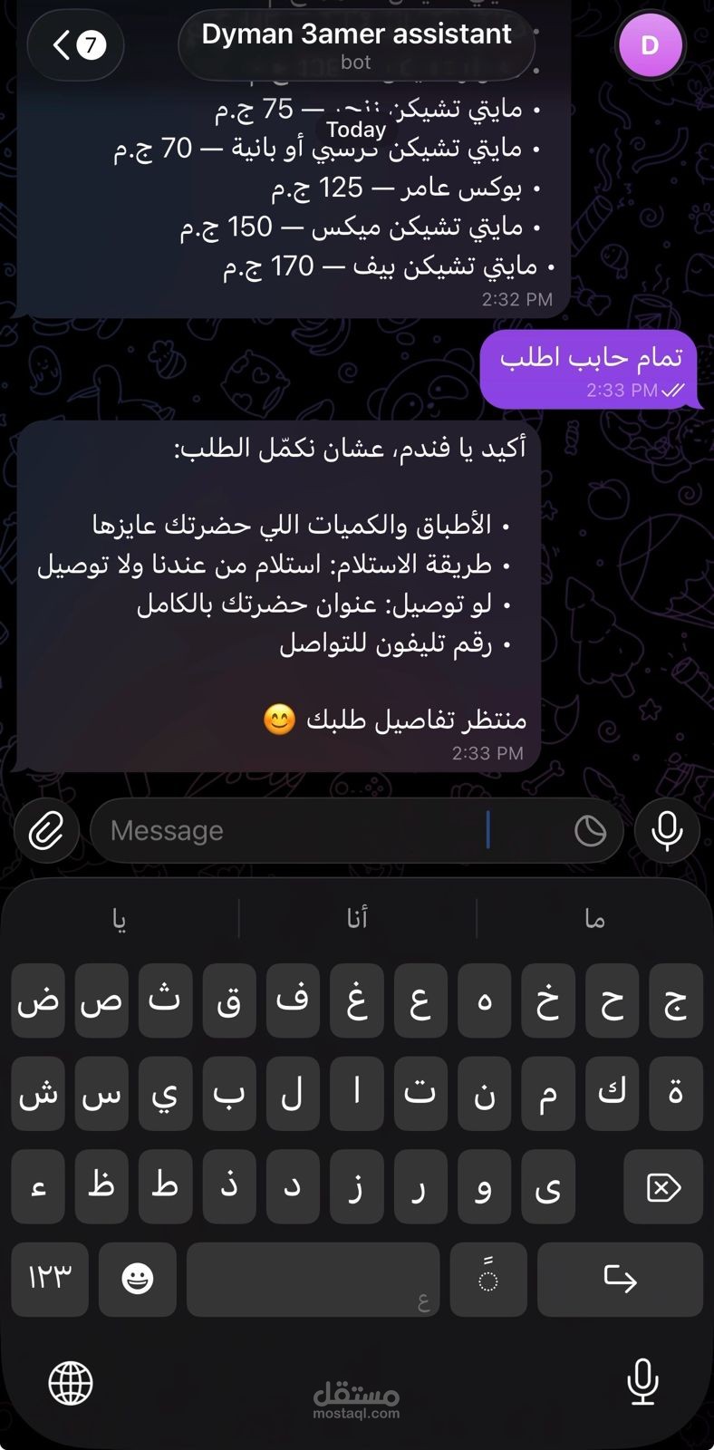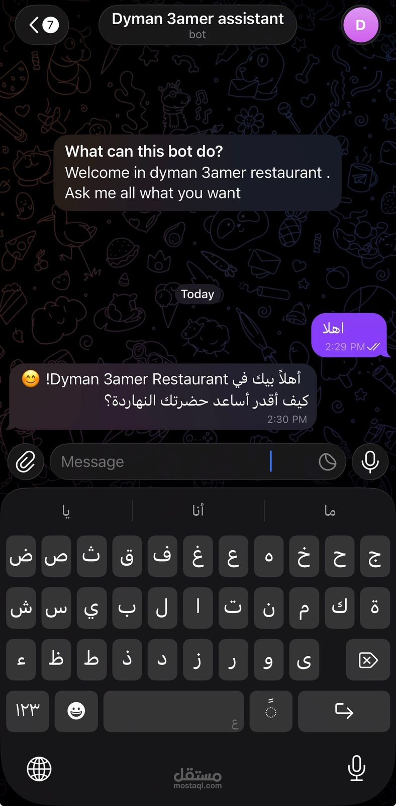 قمت بتصميم وتطوير بوت تليجرام متكامل لمطعم "Dyman 3amer"، يهدف إلى أتمتة عملية طلب الطعام وتحسين تجربة العملاء من خلال واجهة محادثة ذكية وسلسة. البوت يعمل كمساعد افتراضي (Virtual Assistant) يقوم بالرد الفوري على استفسارات الزبائن وتوجيههم حتى إتمام الطلب.