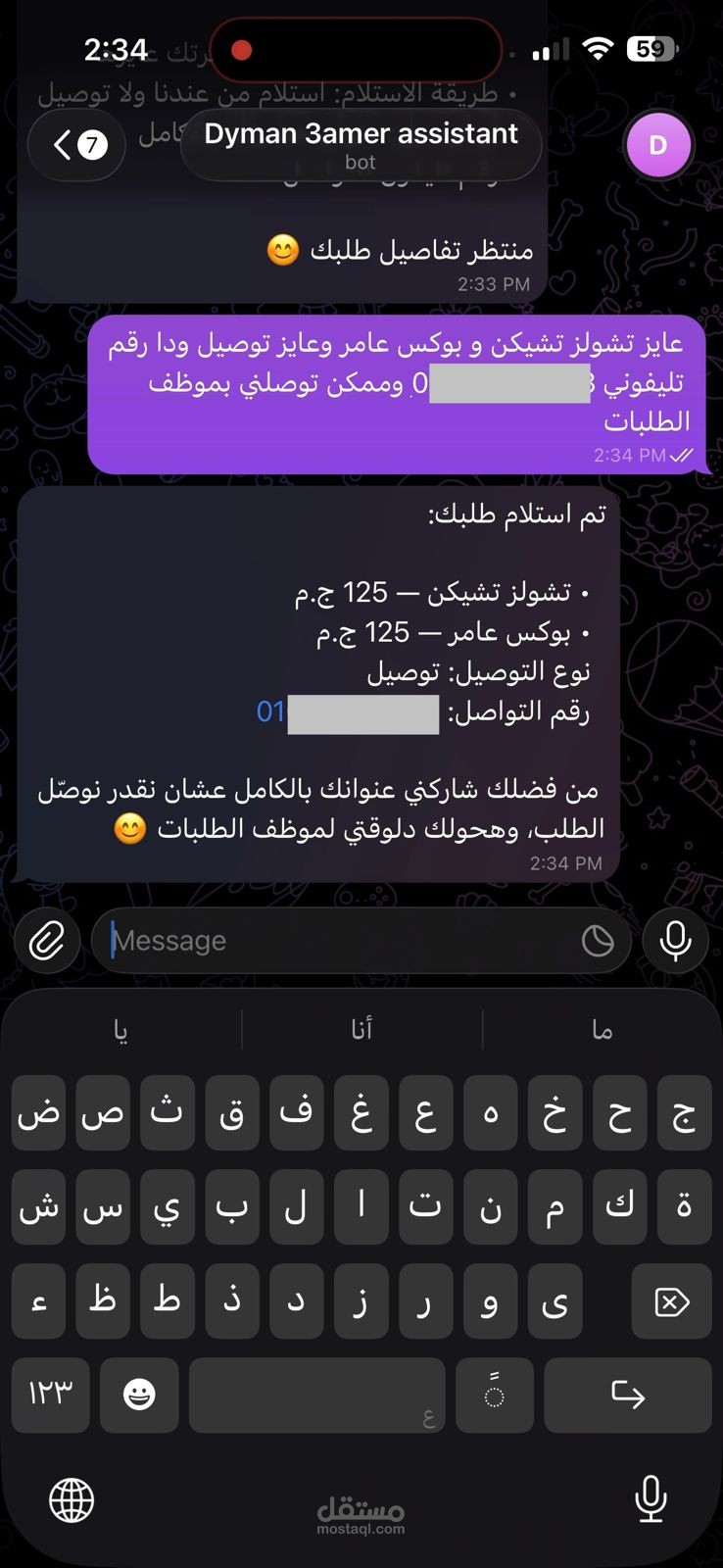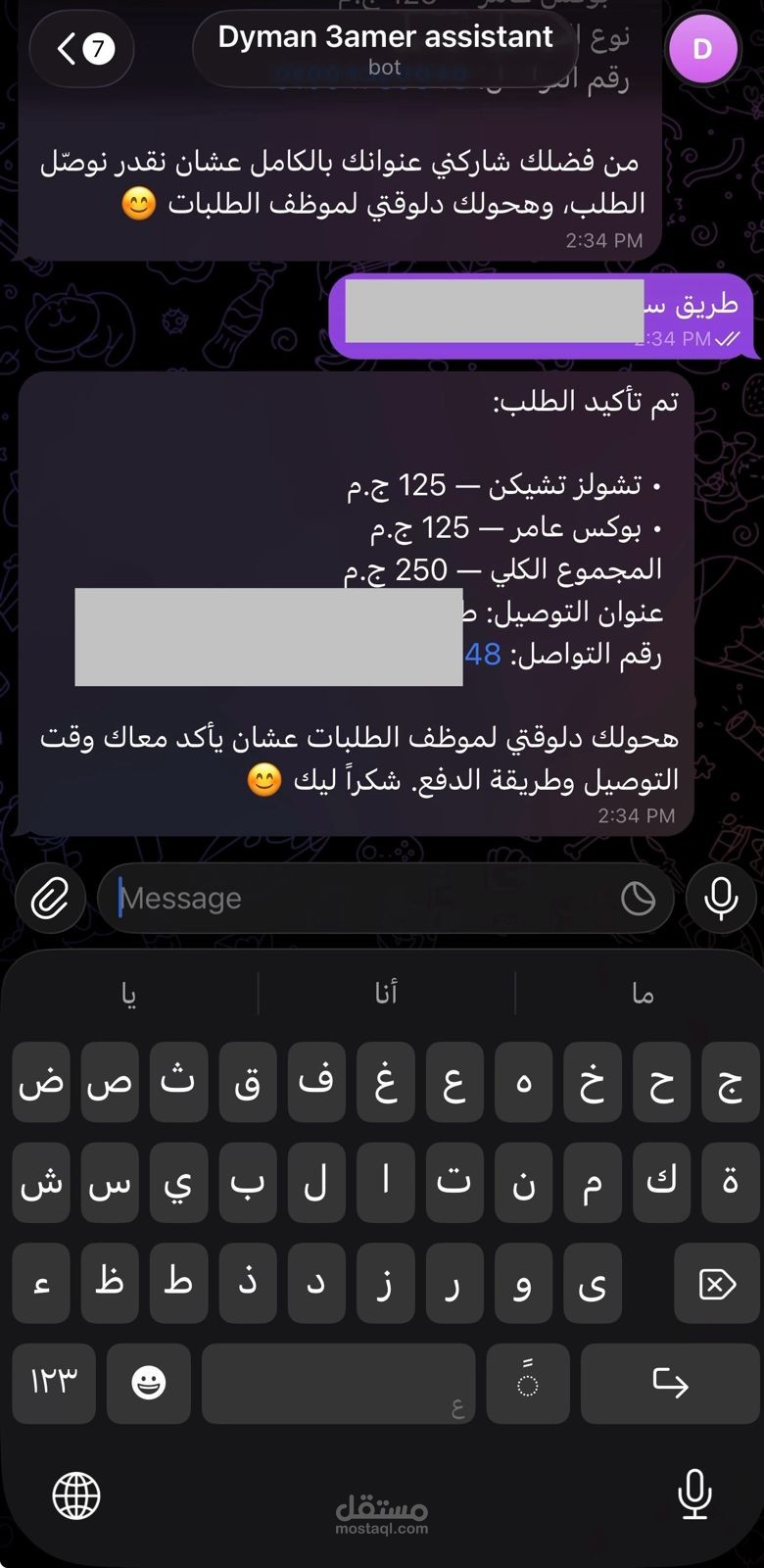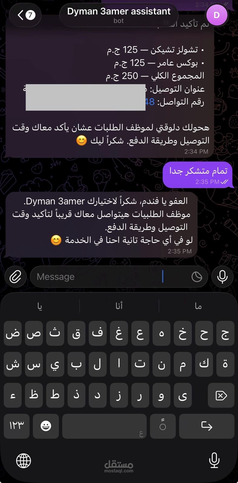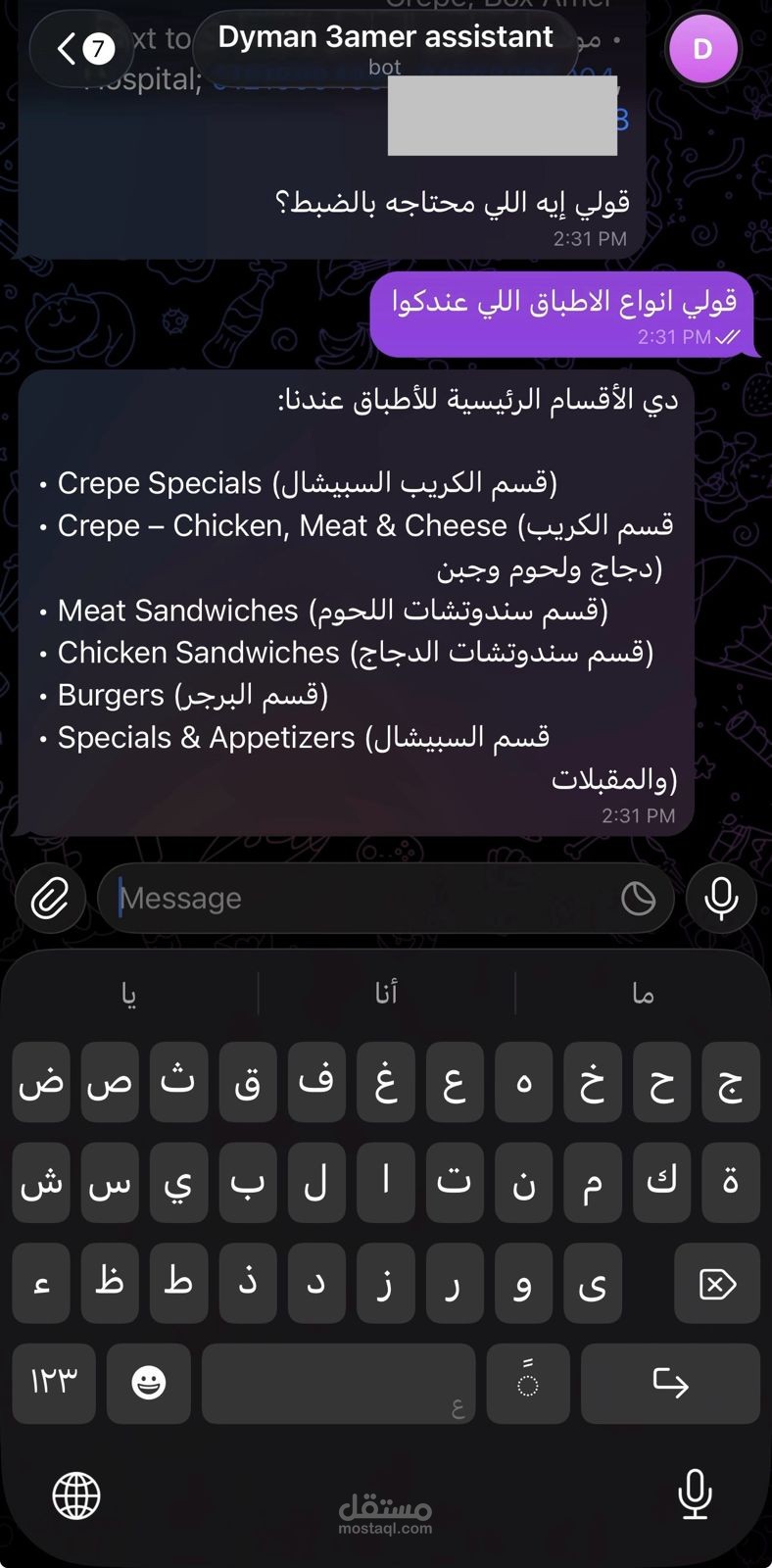 قمت بتصميم وتطوير بوت تليجرام متكامل لمطعم "Dyman 3amer"، يهدف إلى أتمتة عملية طلب الطعام وتحسين تجربة العملاء من خلال واجهة محادثة ذكية وسلسة. البوت يعمل كمساعد افتراضي (Virtual Assistant) يقوم بالرد الفوري على استفسارات الزبائن وتوجيههم حتى إتمام الطلب.