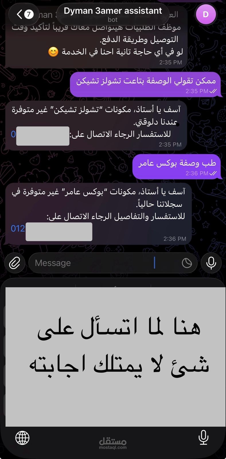 يمكنني عمل بوت اعقد واكبر من هذا حسب البيزنس الخاص بك او بوت واتس او ماسنجر ايا كان حسب طلبك