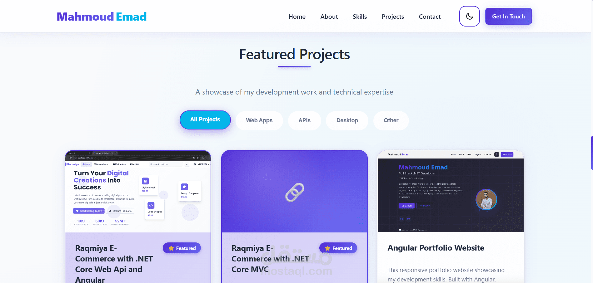 موقع شخصي (Portfolio) يعرض أعمالي وخبرتي كمطور .NET، ويهدف إلى تقديم صورة واضحة عن مهاراتي التقنية والمشاريع التي قمت بتنفيذها في مجال تطوير تطبيقات الويب وتطبيقات سطح المكتب.