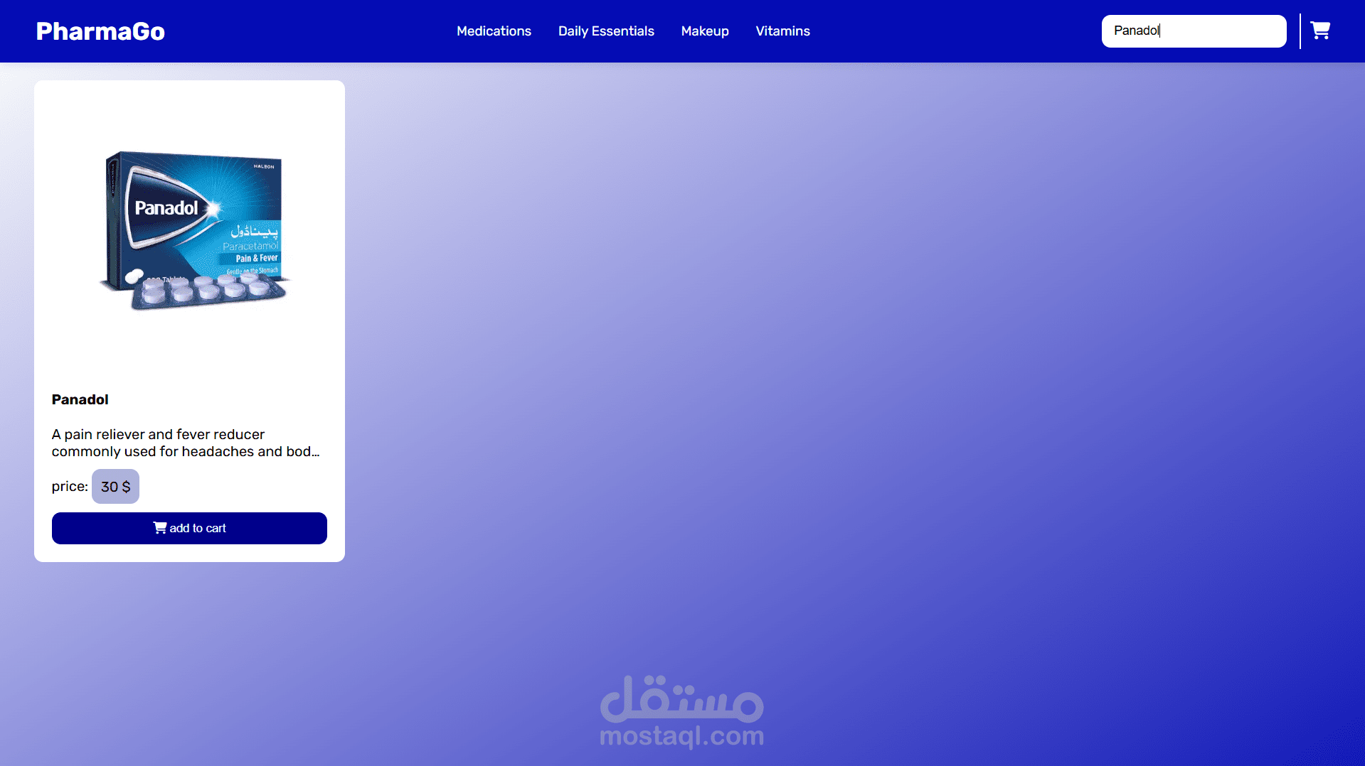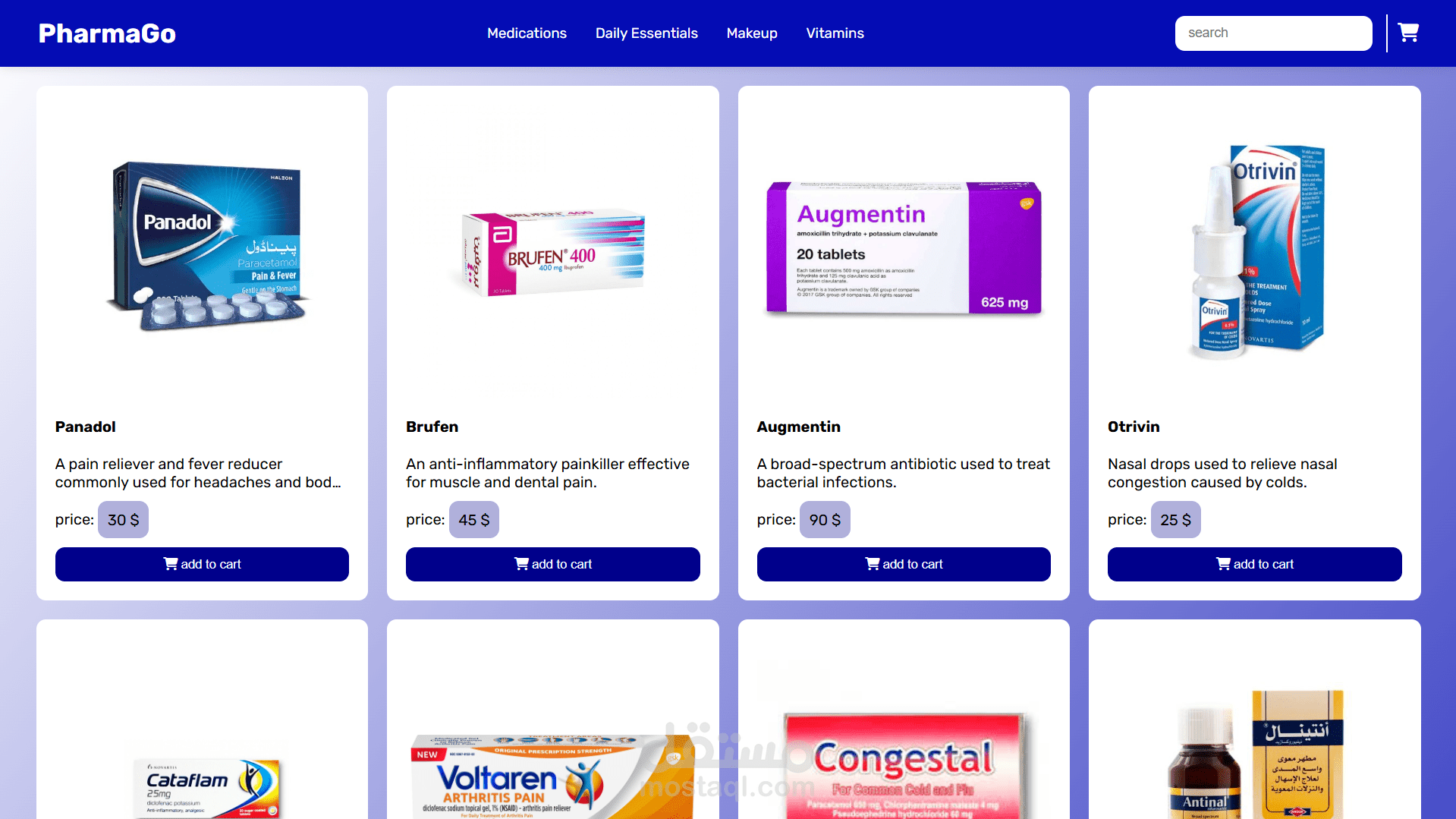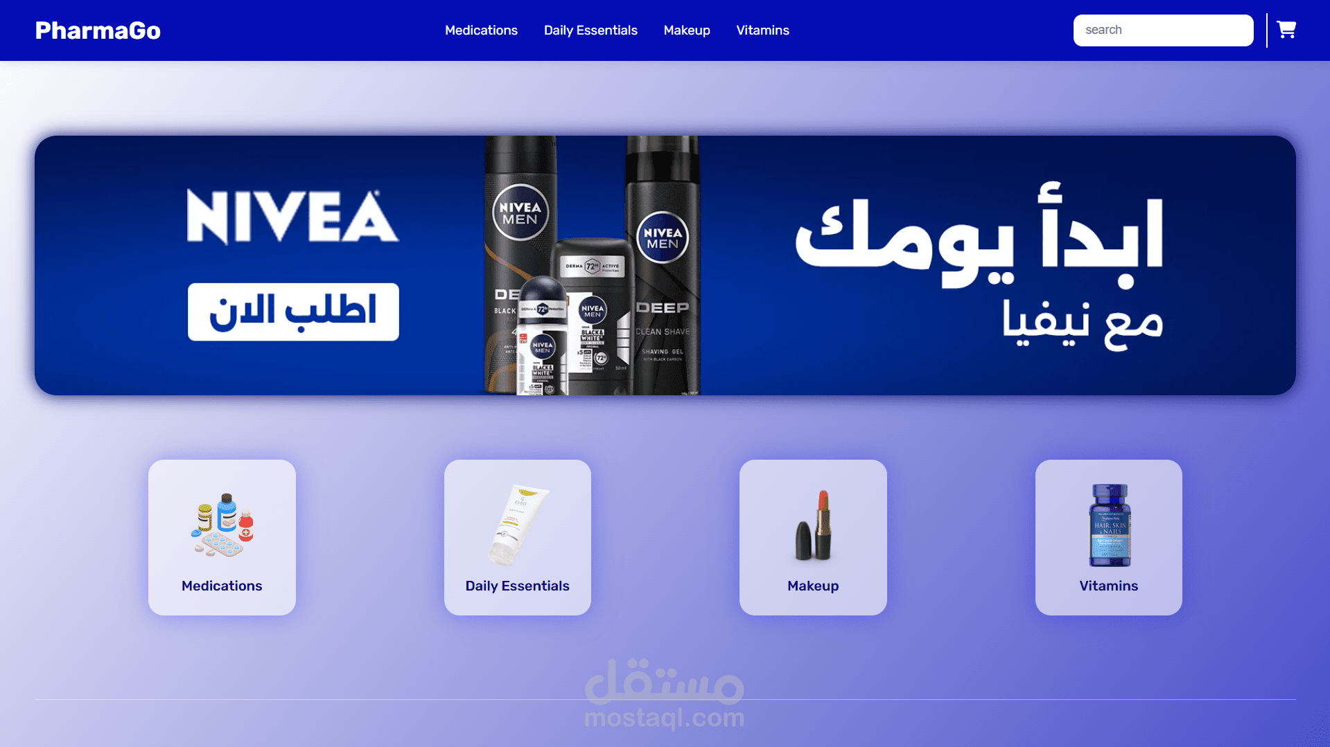 PharmaGo هو موقع صيدلية إلكترونية حديث بيقدّم تجربة تصفّح سهلة وسريعة لمنتجات الأدوية والمستلزمات اليومية. الموقع مصمم بشكل جذّاب ومتجاوب (Responsive) علشان يشتغل كويس على الموبايل والتابلت واللابتوب، وبيوفّر نظام عرض منتجات مرتب بأقسام مختلفة.
