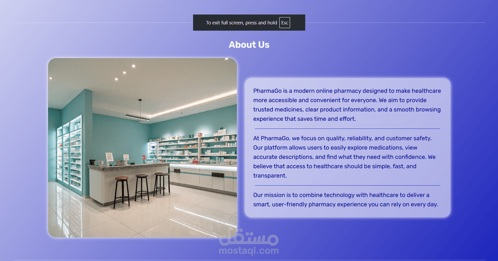 ⦿ قسم About Us لعرض فكرة ورسالة الصيدلية.