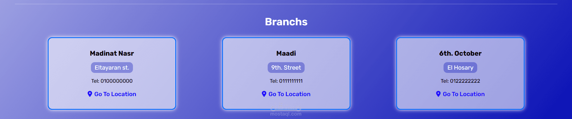 ⦿ قسم Branches فيه فروع الصيدلية وعناوينها وأرقام الهاتف.