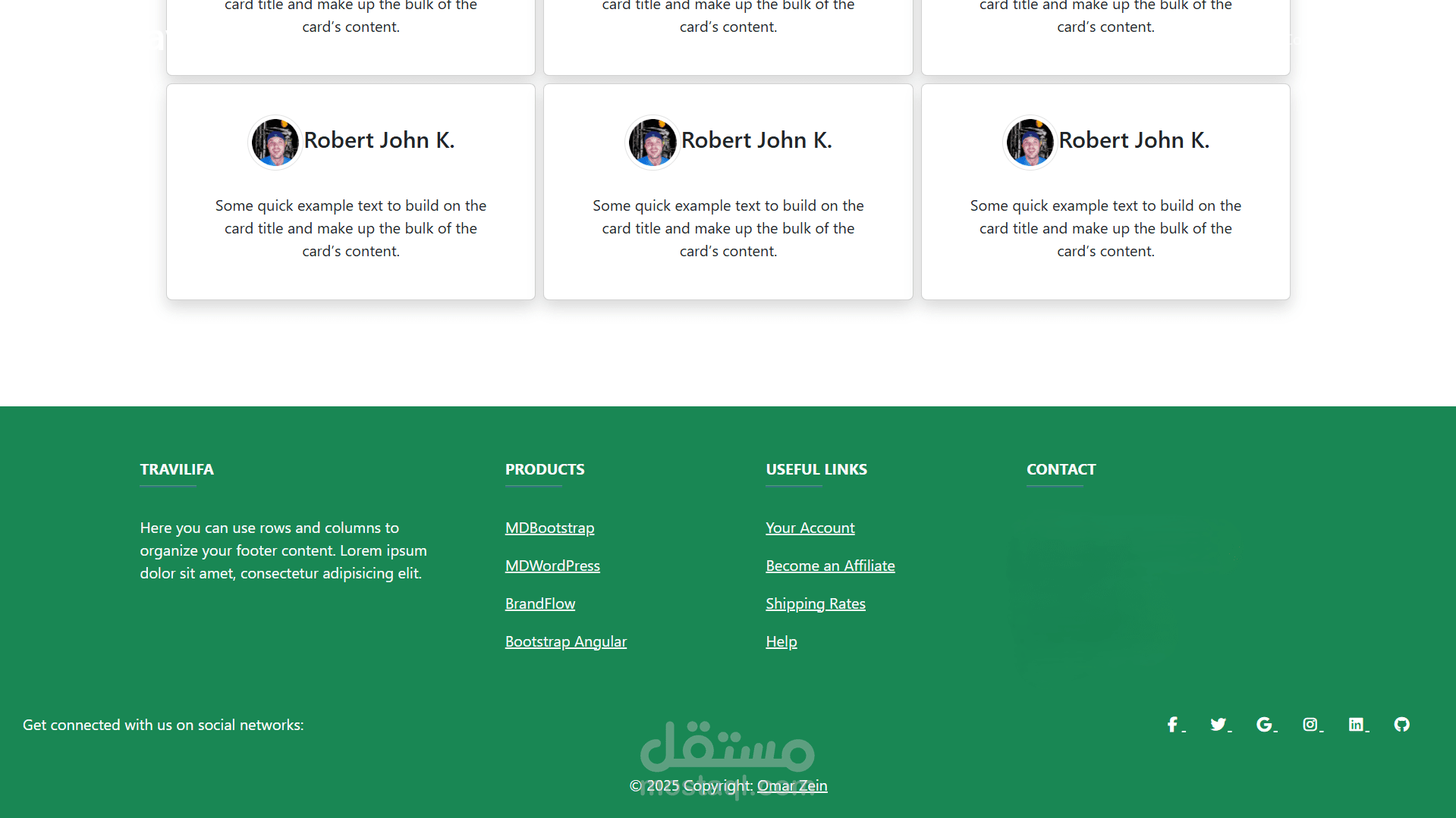 ⦿ أقسام بتستخدم Cards وتنسيق Bootstrap لعرض المحتوى بشكل مرتب واحترافي.