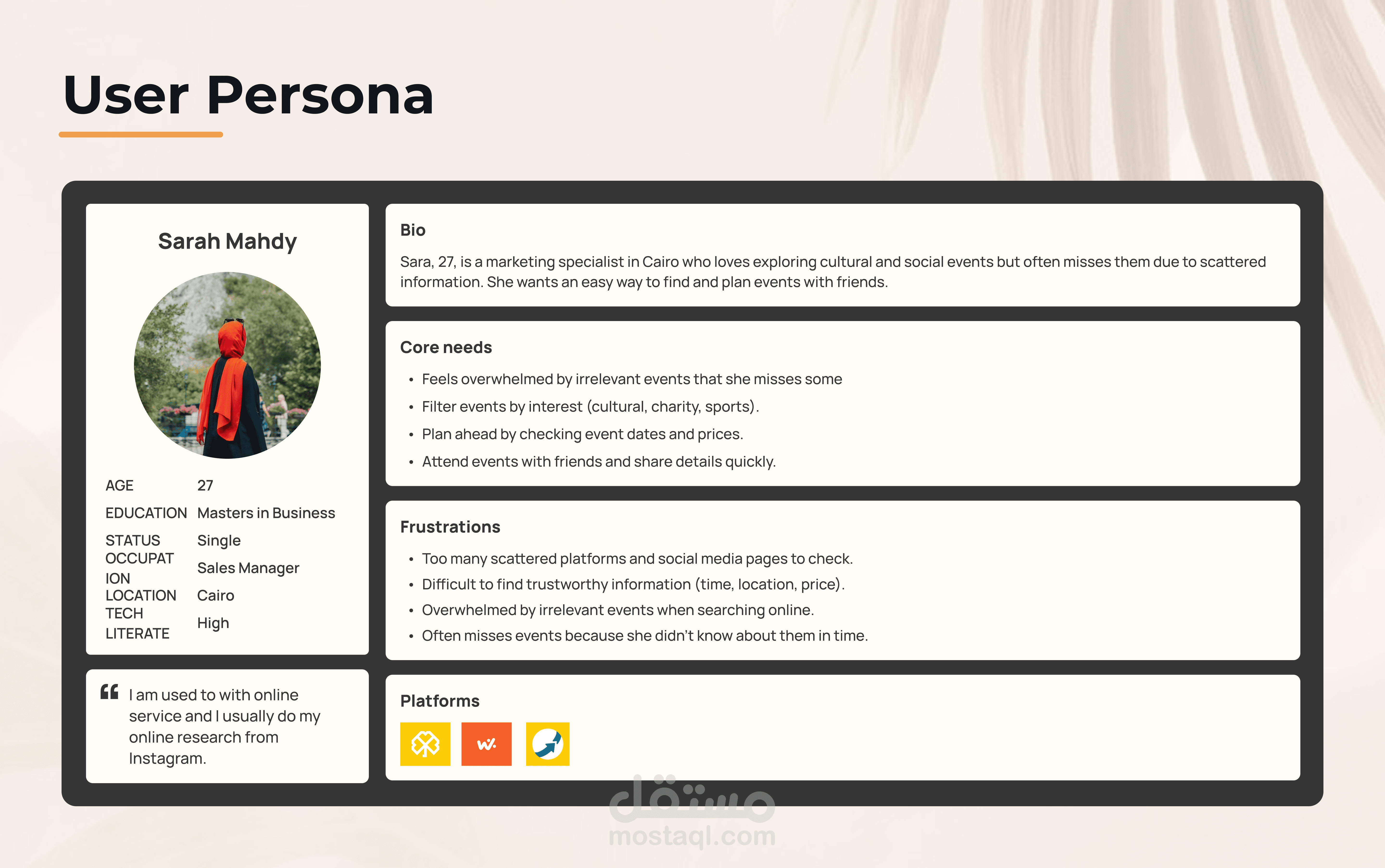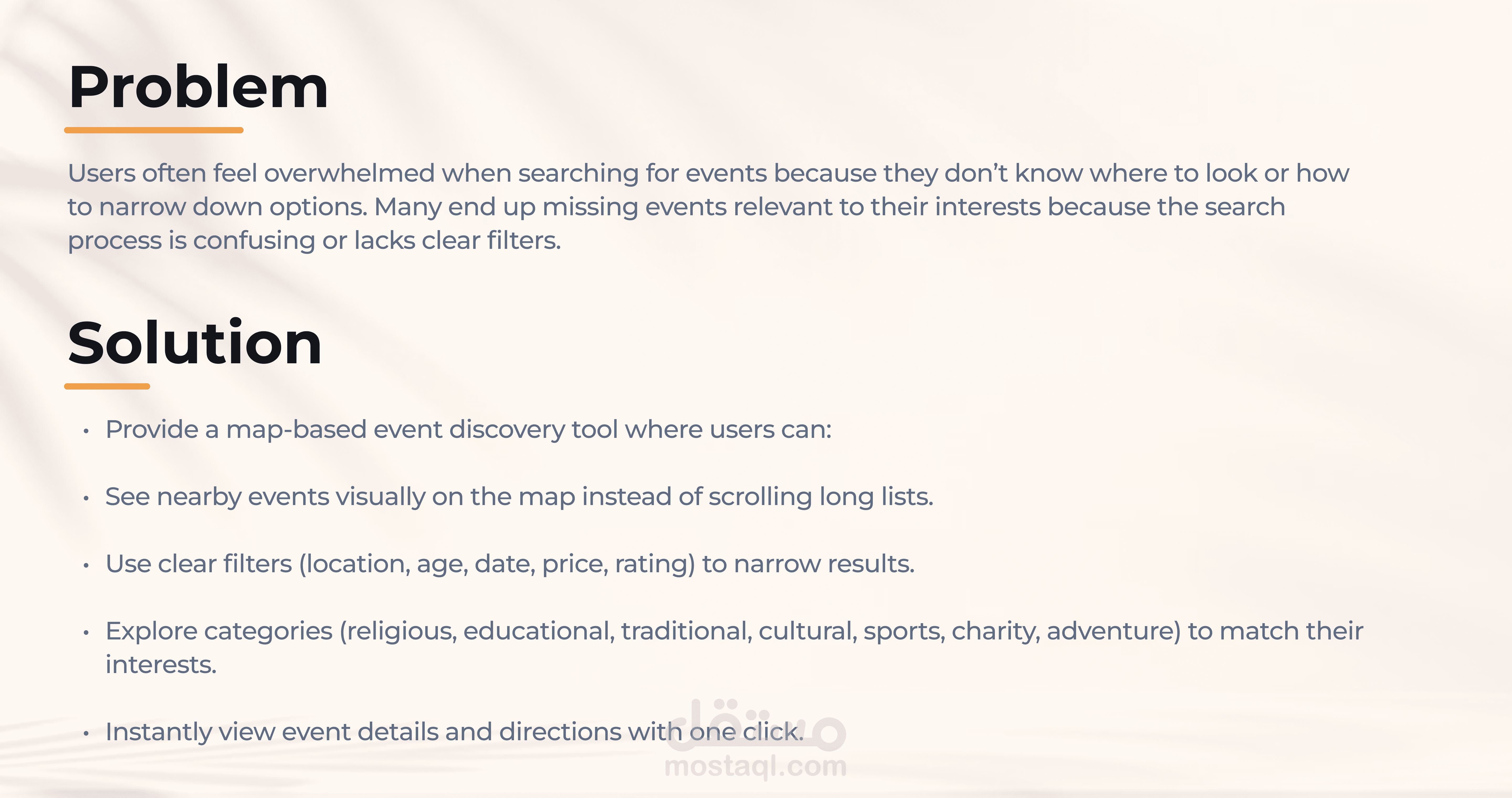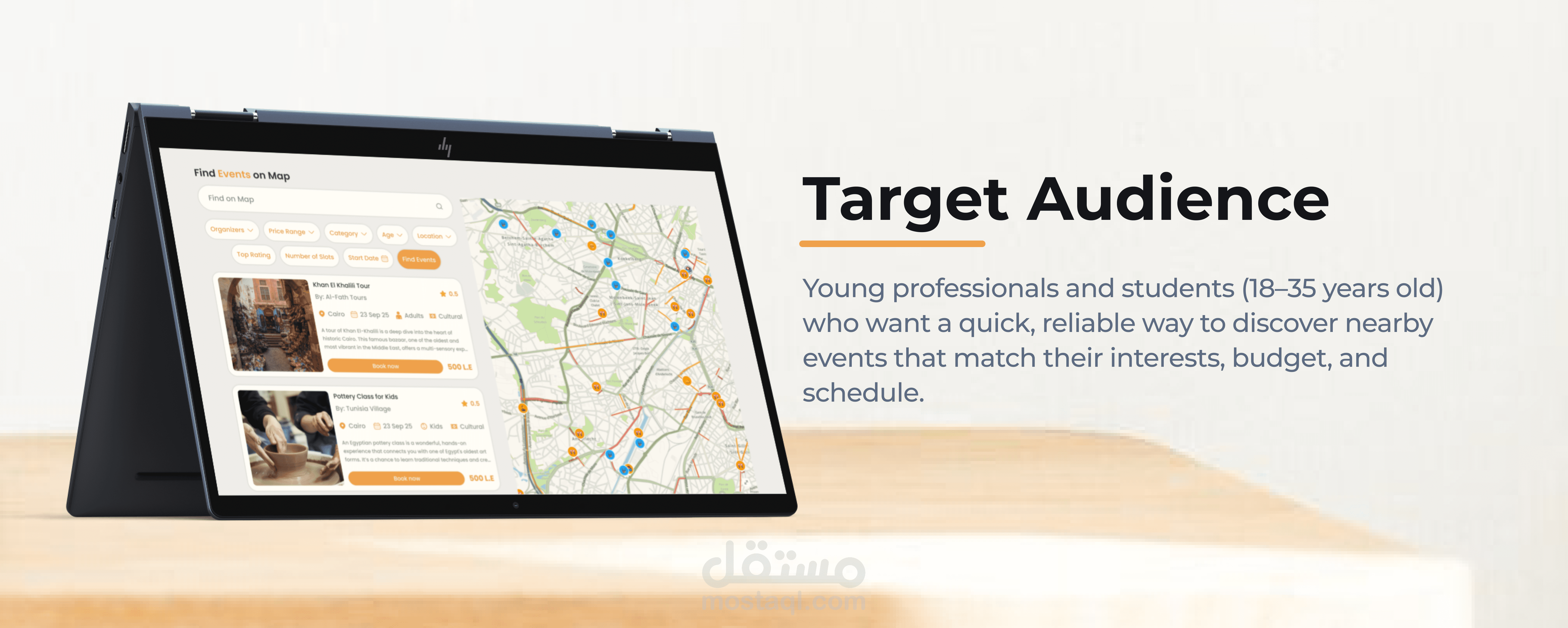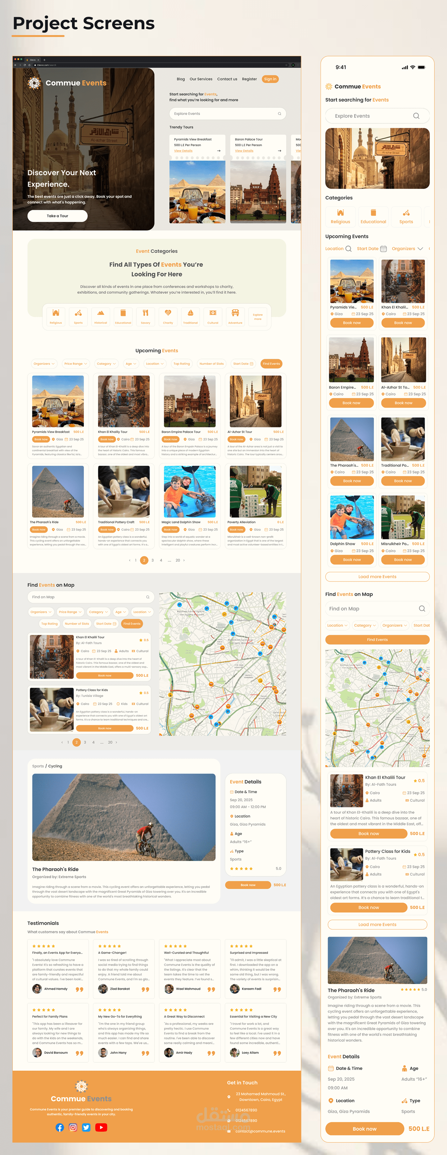 Adaptive design "ويب سايت و موبايل" تم تنفيذه لتوفير نشاطات مختلفة بنظام تصفية النتائج حسب السعر و المسافة و الفئة العمرية و العدد و نوع الحدث اللى اليوزر بيدور عليه