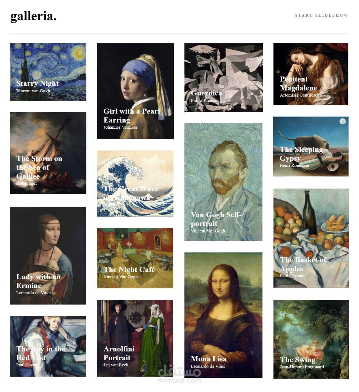 This art gallery slideshow project will be a great test for your layout and JS skills. With the masonry layout, slideshow logic, and lightbox view there's a lot to build!