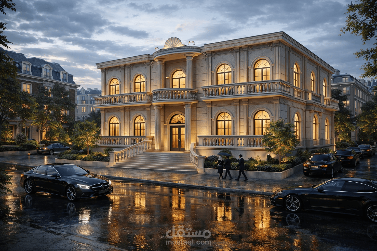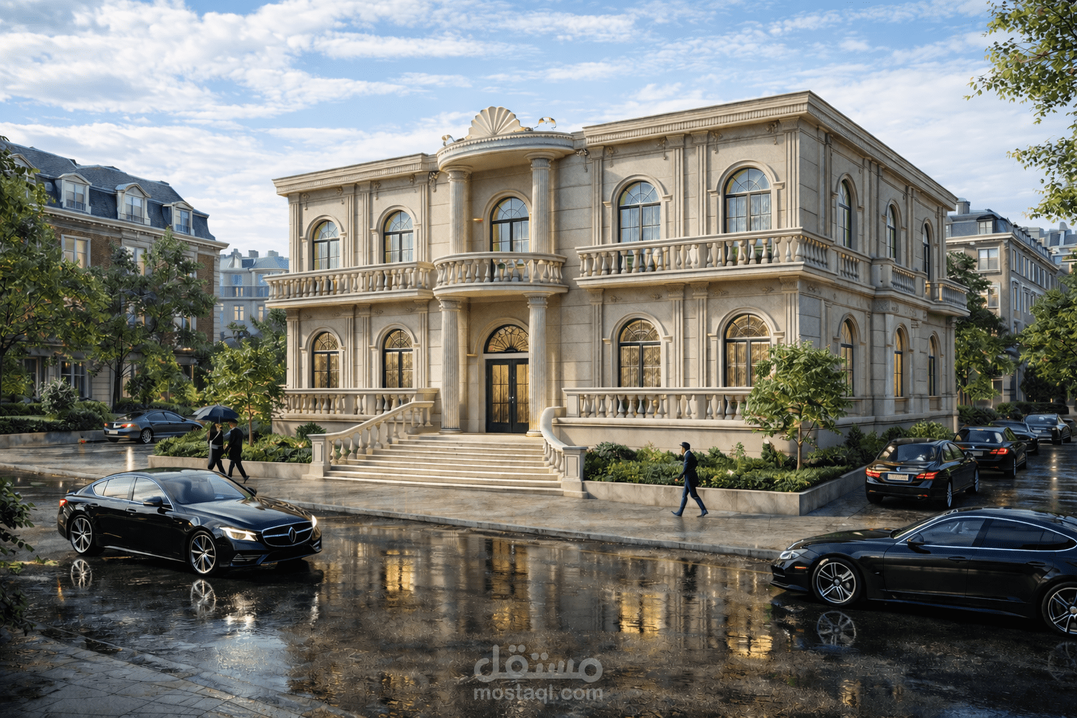 واجهة معمارية فاخرة بتصميم كلاسيك راقٍ تم تنفيذها باستخدام Autodesk Revit مع إخراج بصري معتمد على تقنيات الـ AI Rendering. يعتمد التصميم على التماثل والاتزان في التكوين المعماري، مع إبراز المدخل الرئيسي بالأعمدة والعناصر الكلاسيكية، واستخدام الأقواس في الفتحات والبلكونات لإضفاء طابع أنيق وفخم.